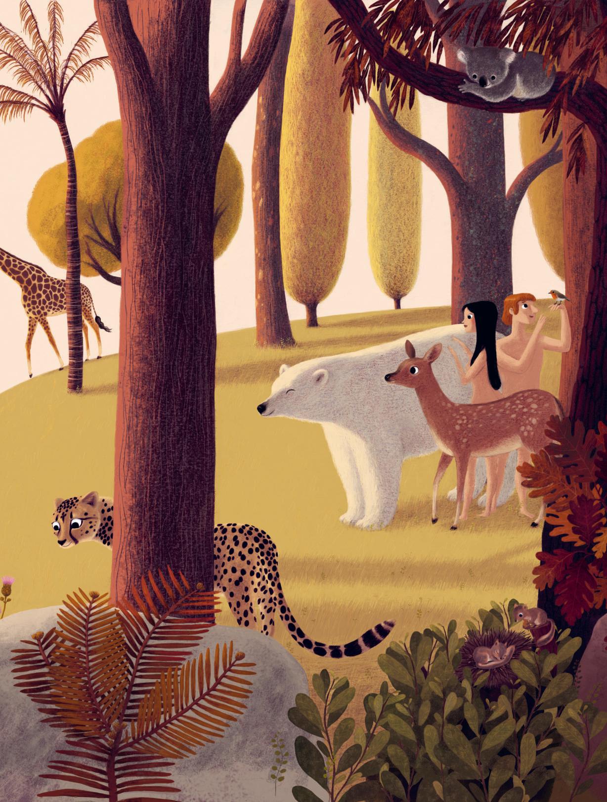 Gott schenkte dem Mann und der Frau das Leben; und sie verliebten sich ineinander. Er vertraute ihnen alles an: die Pflanzen, Bäume, Tiere und alle Wunder zwischen Himmel und Erde.