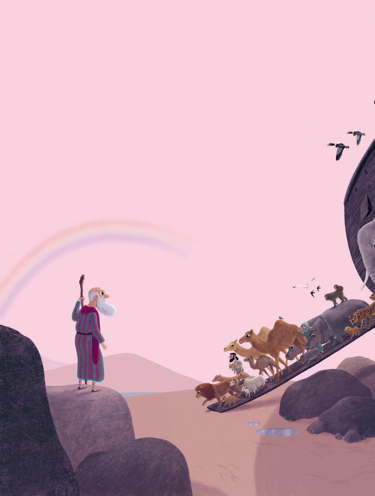 Noah schaut in den Himmel, und Gott sagt zu ihm: „Ich werde die Menschen nie wieder alleinlassen. Dieser Regenbogen ist ein Zeichen für meine Liebe und für die besondere Verbindung zwischen uns.“