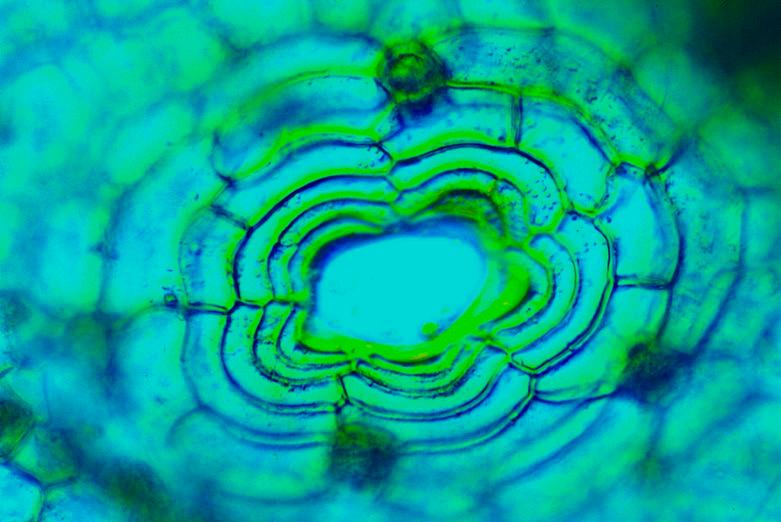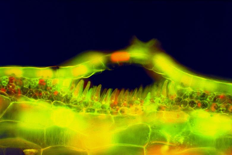 Im Hinblick auf die verschiedenen Bedürfnisse nach Licht unterscheidet man Lichtund Schattenpflanzen. Ein hauchfeiner Querschnitt durch die Blätter der Lichtpflanzen enthüllt den genialen Blattaufbau in vier Zellschichten. Die Blattoberhaut besteht aus lichtdurchlässigen, glasklaren Zellen, die das Licht an die darunterliegende zweite Zellschicht, den Palisadenzellen, weiterleiten. Ihr Geheimnis beruht auf einem technischen wie auch chemischen Wunder, denn entlang den elfenbeinfarbigen Zellwänden kreisen smaragdene, linsenförmige Körper dem Licht nach. Es sind die Blattgrünkörner (Chlorophyll). Wird der Lichteinfall stark, wenden sie dem Licht ihre Schmalseite zu, ist er schwach, präsentieren sie ihre Breitseite, mit der sie jede noch so geringe Lichtspur einfangen. Je nach Pflanzenart enthält eine Zelle 10 bis 100 Chlorophyllkörper, das macht auf einen Quadratzentimeter Blattfläche 50 bis 60 Millionen. Sie sind die wunderbarsten und kleinsten Lichtkraftmaschinen, die es gibt. Die so gewonnene Stärke wird in die dritte und vierte Zellschicht zum Aufbau der Pflanze verschickt.