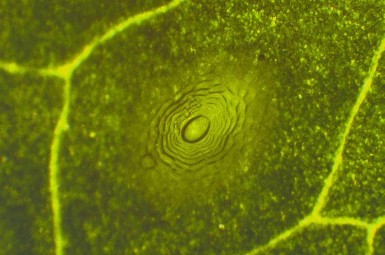 Zwischen den normalen Blattzellen stehen die klaren, lichtsammelnden Zellen mit jeweils einer Sammellinse in der Spitze. (Blattabdruck 125:1)