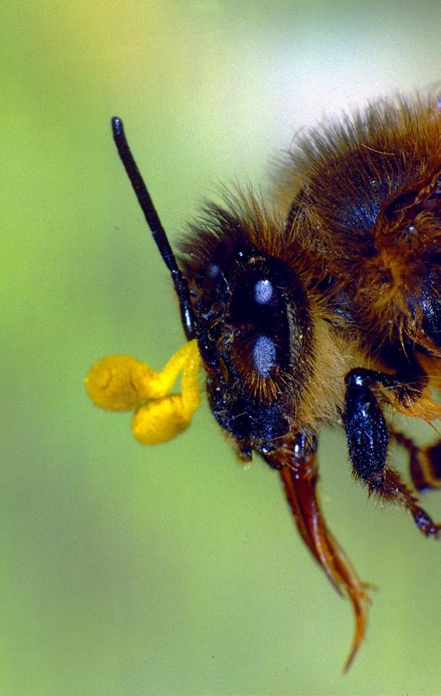 Nach dem Blütenbesuch Abgang mit Pollenpaketen am Kopf angeklebt.