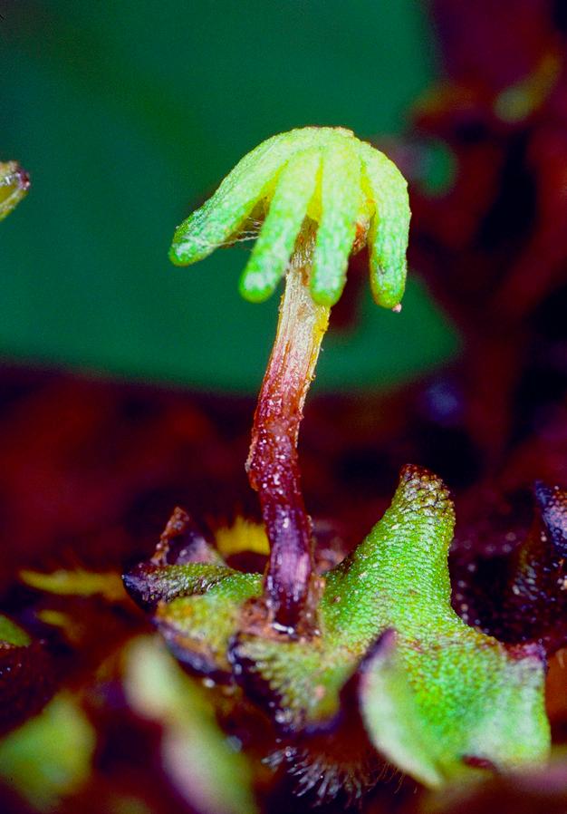 Blattaufsicht mit den weißen, lichtsammelnden Zellkuppeln und darauf ein Brutbecher, in dem sich die Sämlinge befinden.