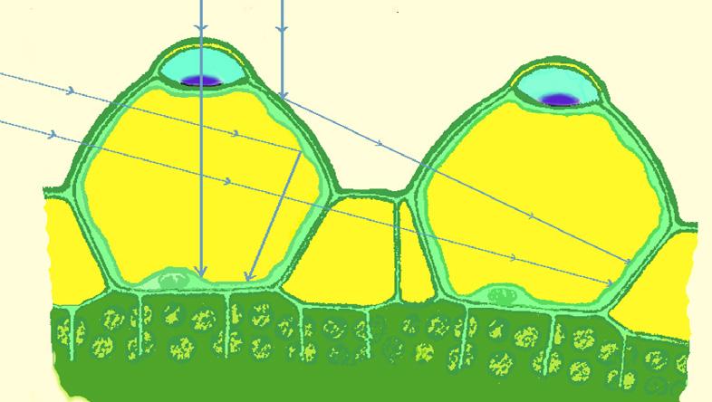 Die Lichtstrahlen durchdringen die glasklaren Zellwände zur Nachbarzelle, werden an den Außen- und Innenwänden so reflektiert, dass sie zu den Palisadenzellen gelangen. Senkrecht einfallendes Licht wird durch die bikonvexe Linse gebündelt und verstärkt nach unten geleitet.