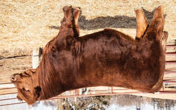 We are beyond excited about the future of Value. He is that cow bull that offers what many cattlemen and women are searching for. Value has 11 of the most economically relevant traits in the top 25% or better on the EPD and dollar index charts. Value is one of the few bulls you will find that is extremely easy fleshing, high performance that still offers exceptional carcass qualities. He indexed 191 on marbling ultrasound, a trait we all desire, but are often disappointed in the animal’s performance and ability to add pay-weight in one package. Take a look at his individual performance 205 wt 987-108 index, 365 wt 1234 108 index, IMF 3.78 Index 191, BF .32, Index 200, REA 14.43 perfect. Value’s cow family is outstanding, his dam and granddam have all the qualities we look for. They are extremely easy fleshing, superb uddered, and stand on perfect sets of feet and legs. They are the right size, two power cows that every good cowman would love to own. When you analyze Value’s carcass merit, you have to appreciate how his actual performance and his EPD elevate him into one of the elite. Not only does he marble well, Shear Force predicts a tender eating experience that every man, woman, and child desires. His end product should be outstanding. If you are looking for an AI sire that will add fleshing ability, a big sweeping rib and a threedimensional, eye-catching body type with a neat head that few purebred cattle can match. Value’s disposition is excellent, his feet are exceptional, and his body type is spot on. Value will be a high-used bull in our program.