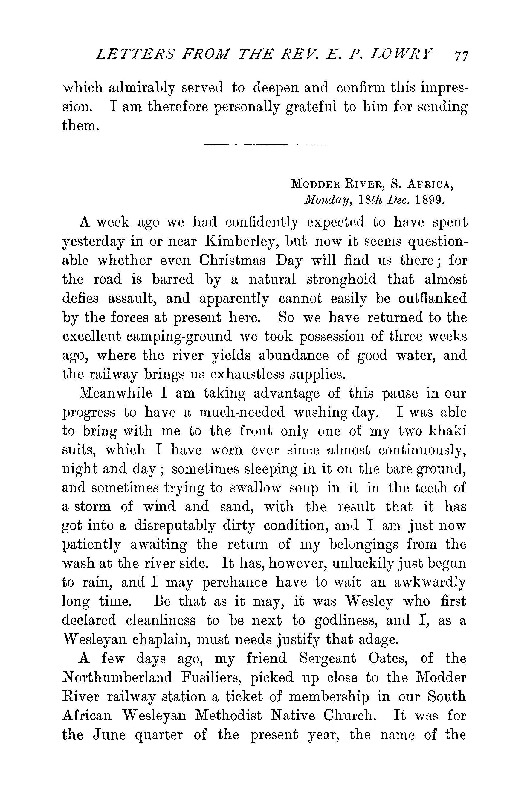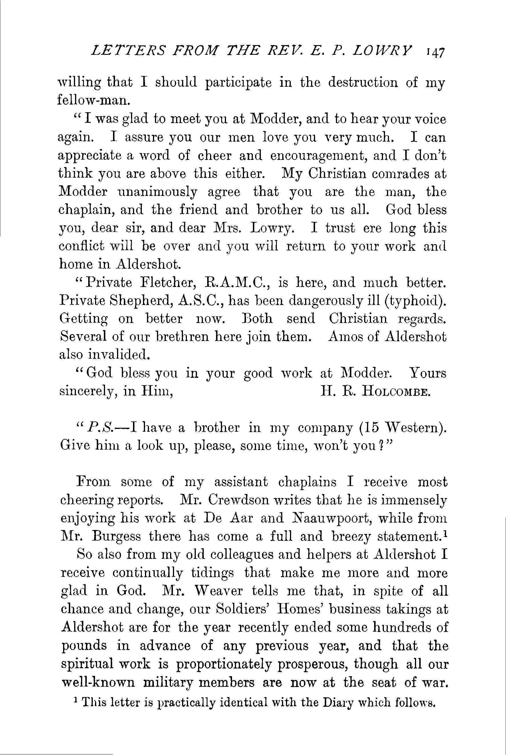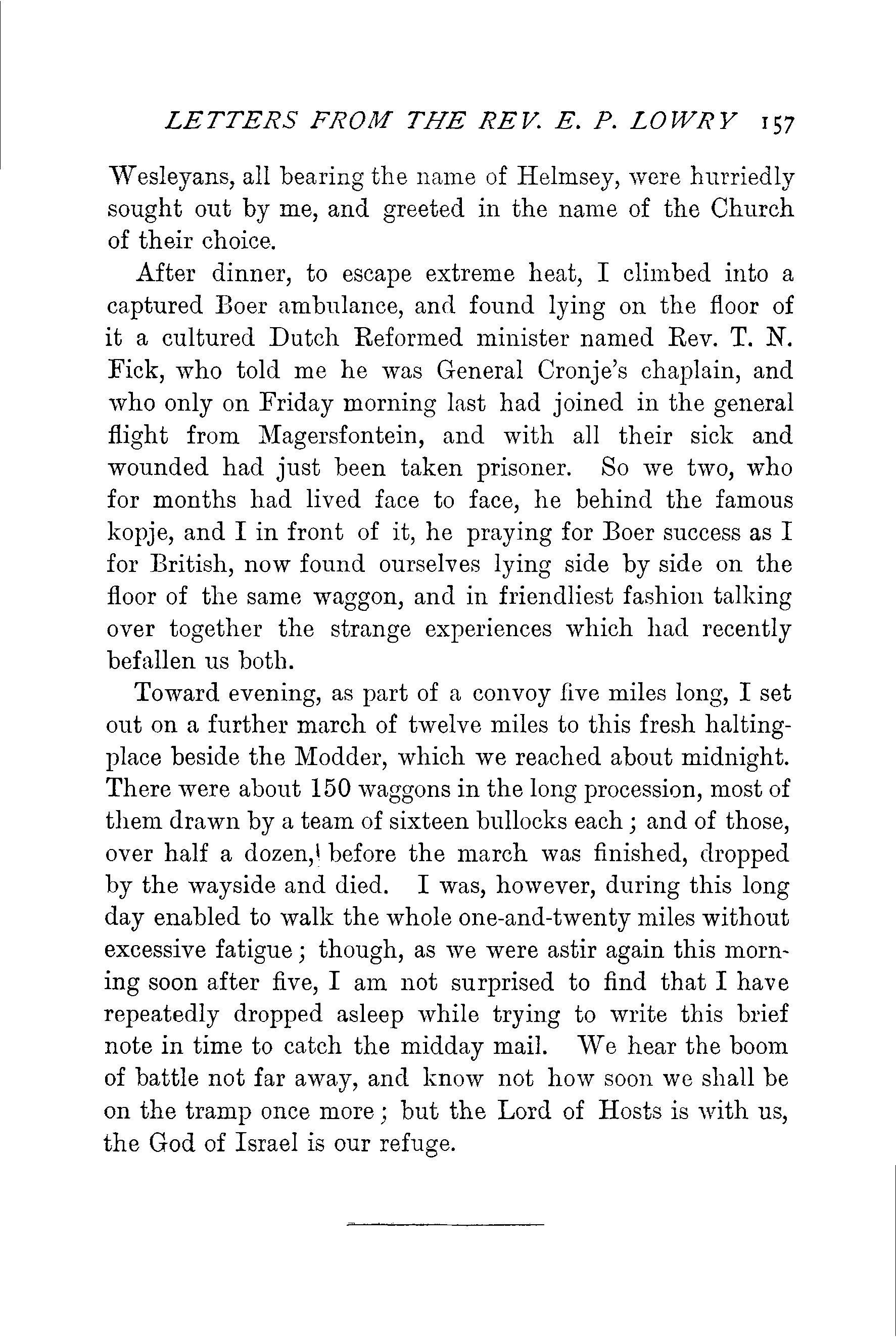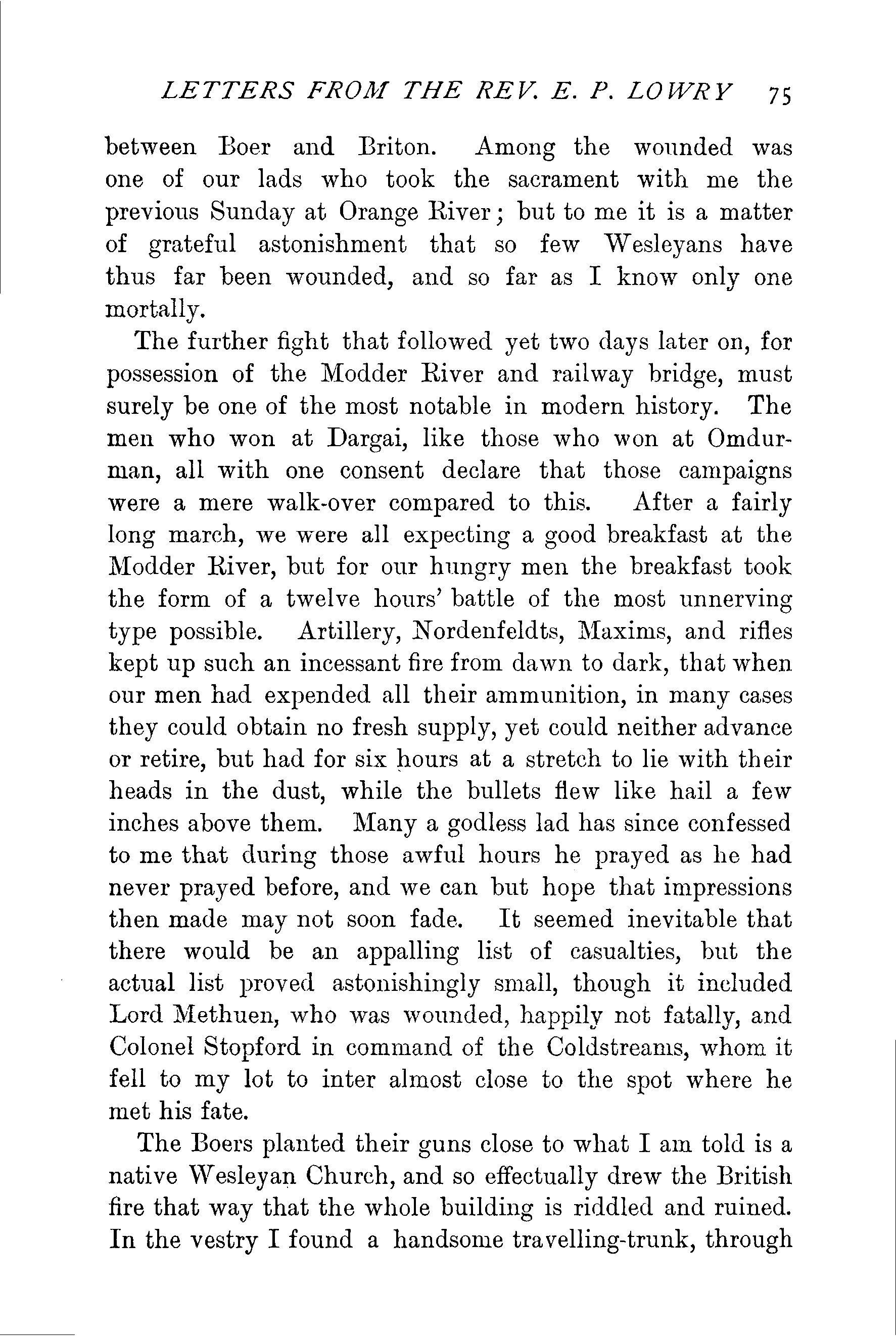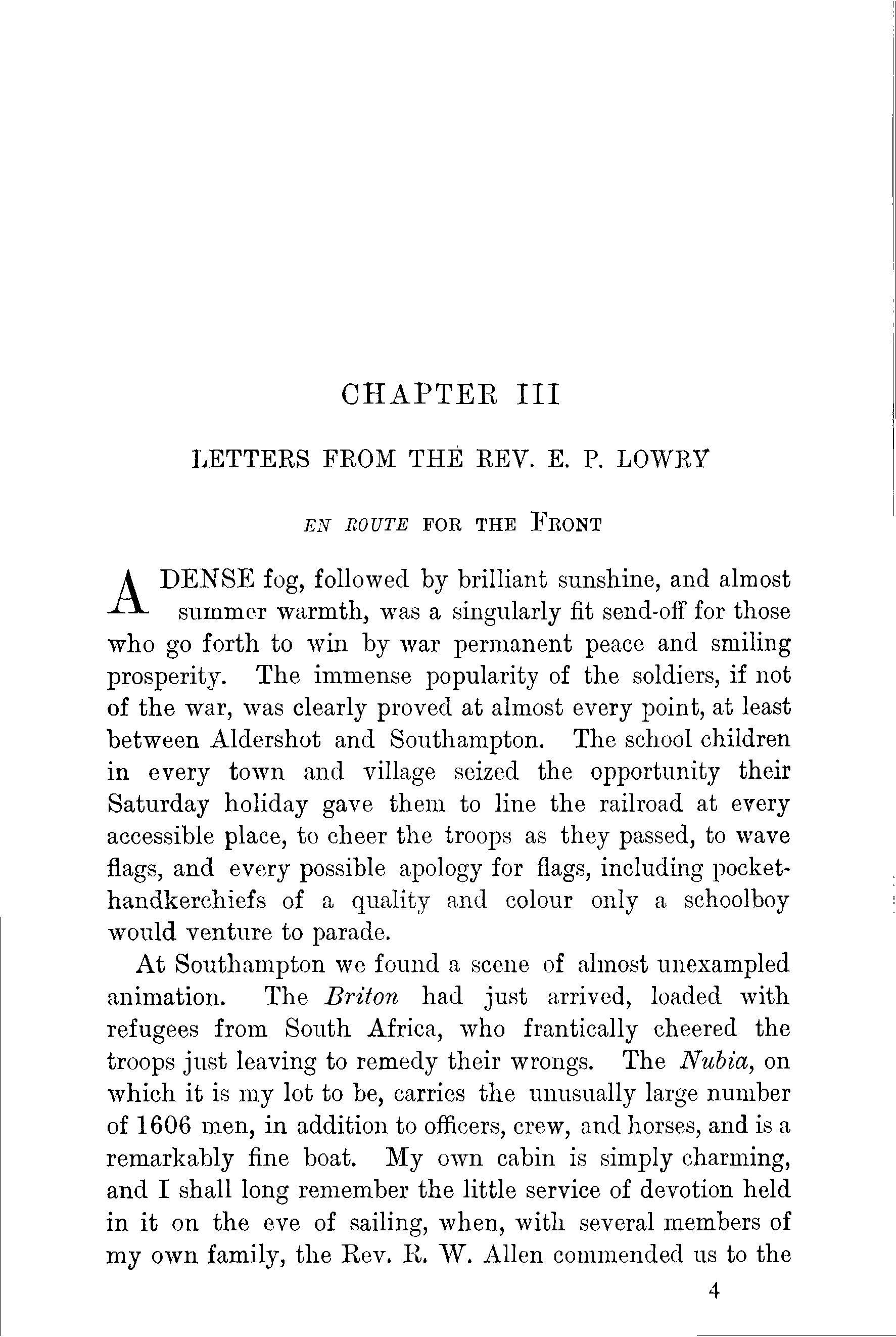 The letters written by our chaplains are also incomplete. Those which appear have been selected from the columns of the Methodist Recorder and the Methodist Times. We had hoped to include all the communications to the English Methodist newspapers. A difficulty, however, presented itself. To have included a larger number of letters would have increased the size, and therefore the cost, of the volume to an undesirable extent. We have therefore been compelled to make a selection. Mr. Lowry's letters are complete, and the whole series will be found to give a fairly consecutive view of the experiences of our chaplains over nearly the whole field. At the date of publication no letters had arrived from relieved Mafeking.