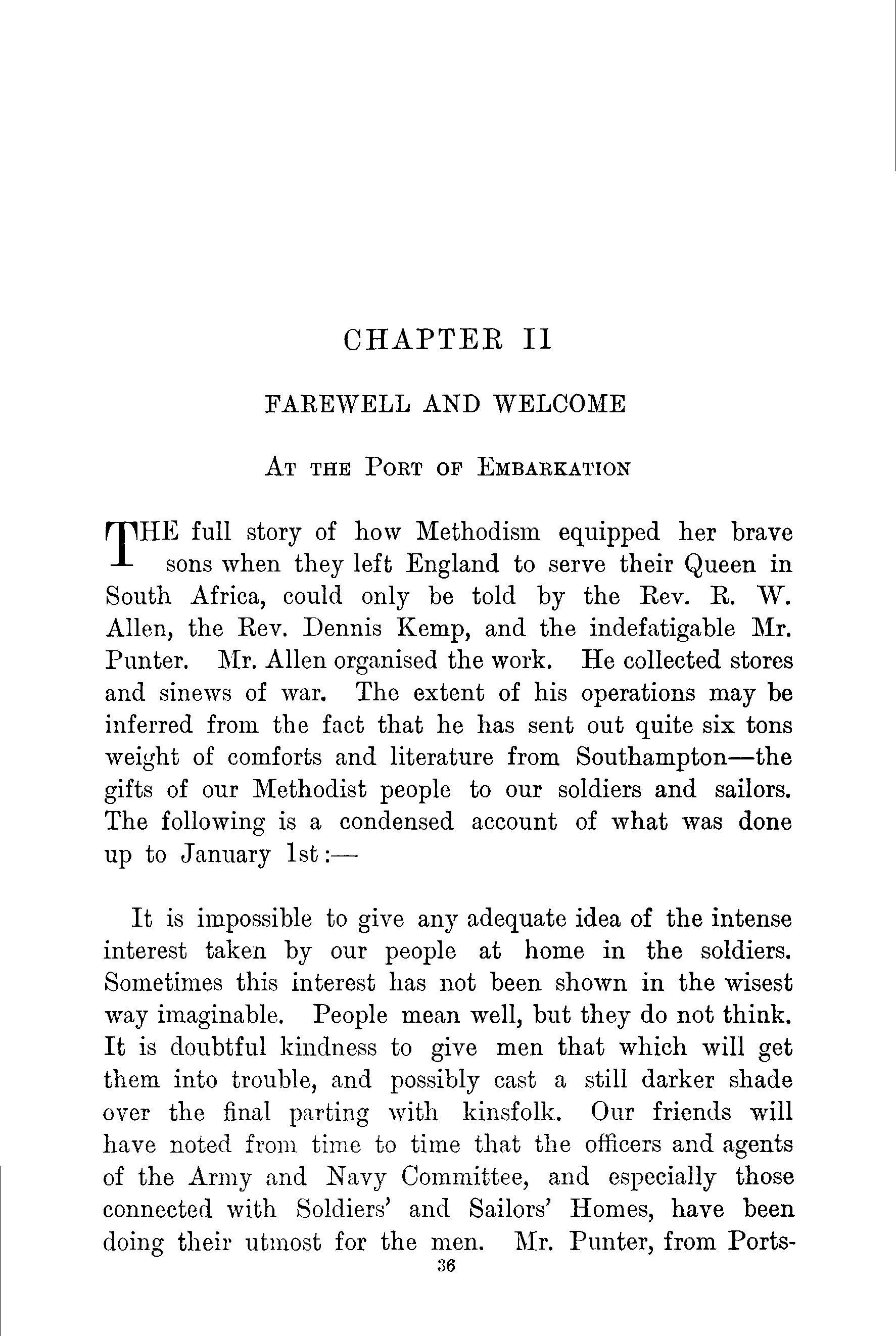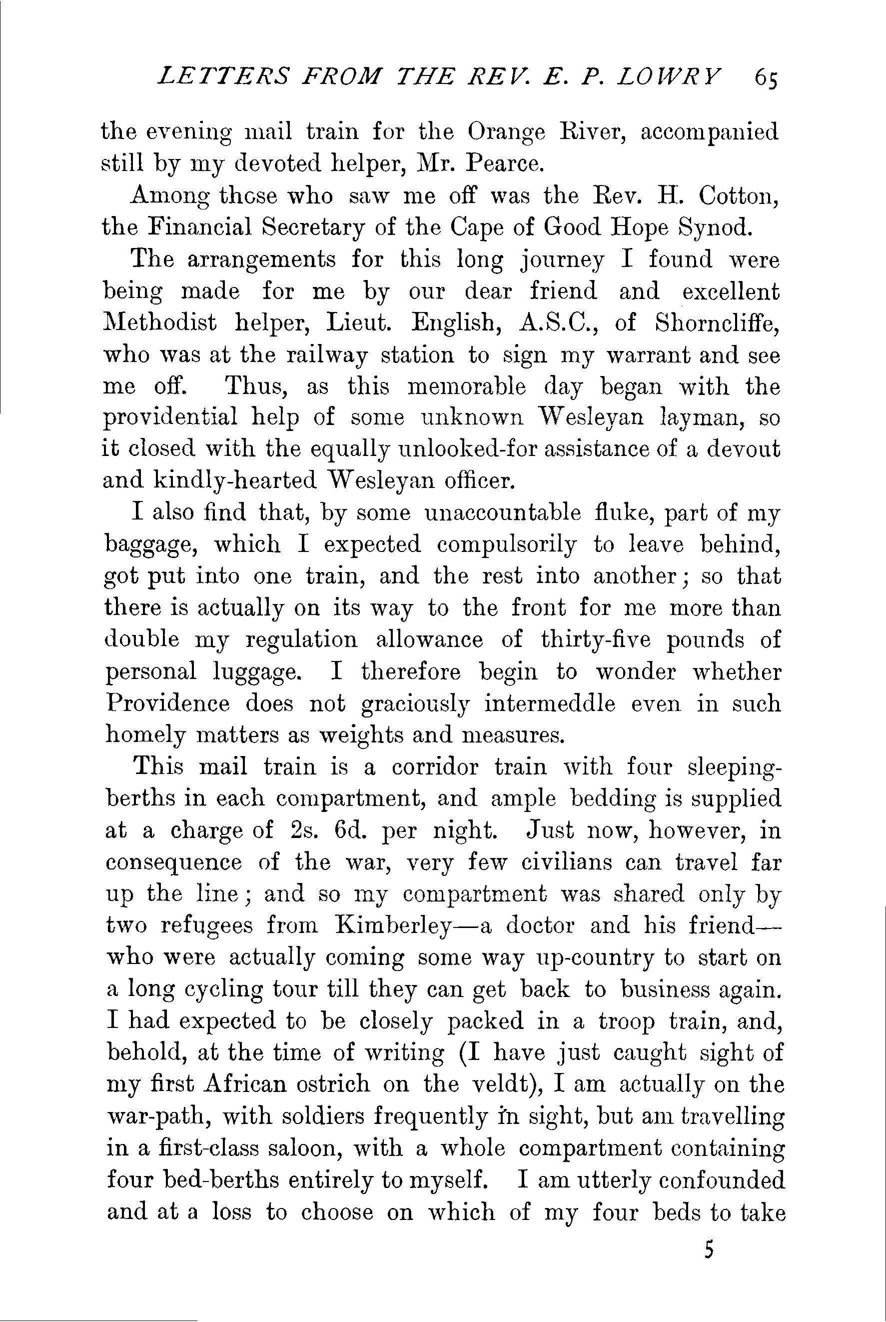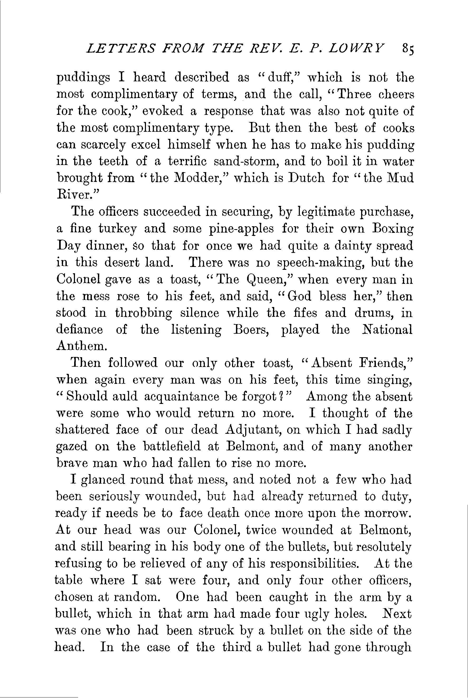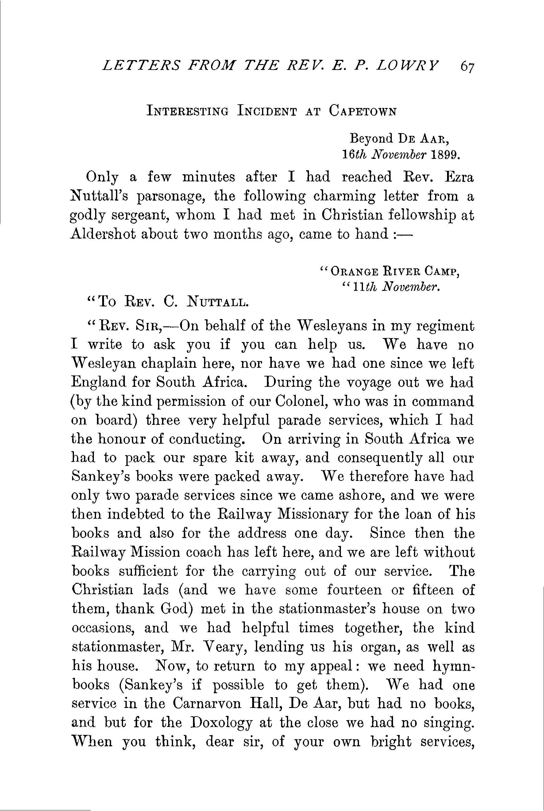 The letters written by our chaplains are also incomplete. Those which appear have been selected from the columns of the Methodist Recorder and the Methodist Times. We had hoped to include all the communications to the English Methodist newspapers. A difficulty, however, presented itself. To have included a larger number of letters would have increased the size, and therefore the cost, of the volume to an undesirable extent. We have therefore been compelled to make a selection. Mr. Lowry's letters are complete, and the whole series will be found to give a fairly consecutive view of the experiences of our chaplains over nearly the whole field. At the date of publication no letters had arrived from relieved Mafeking.