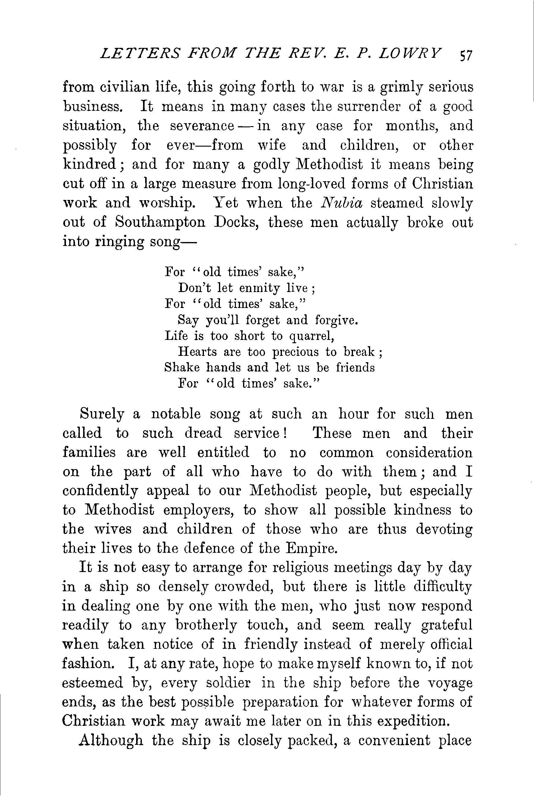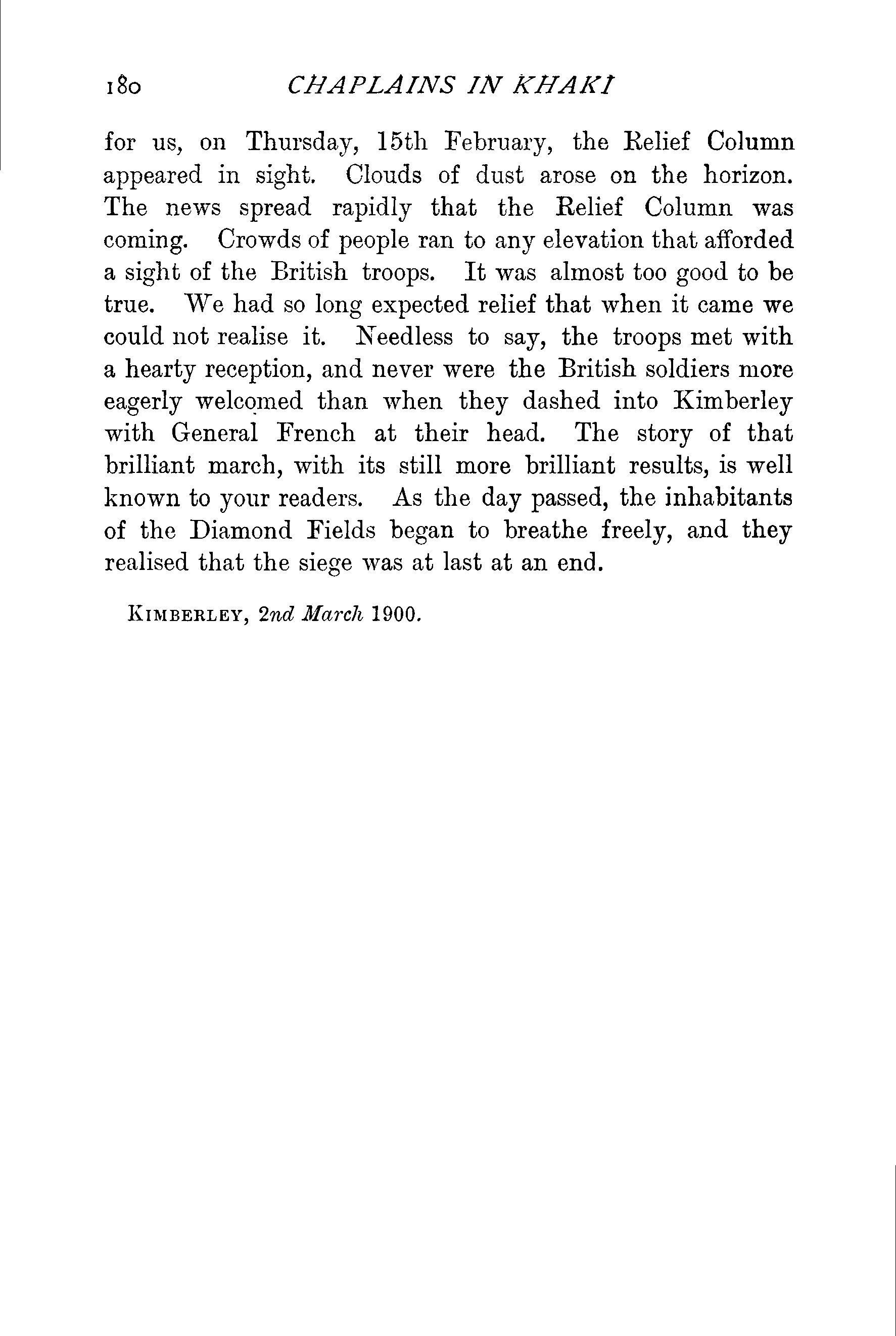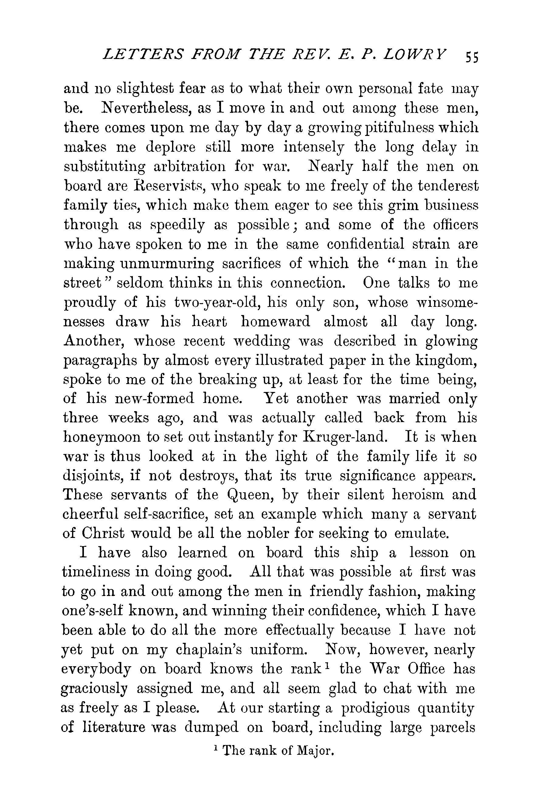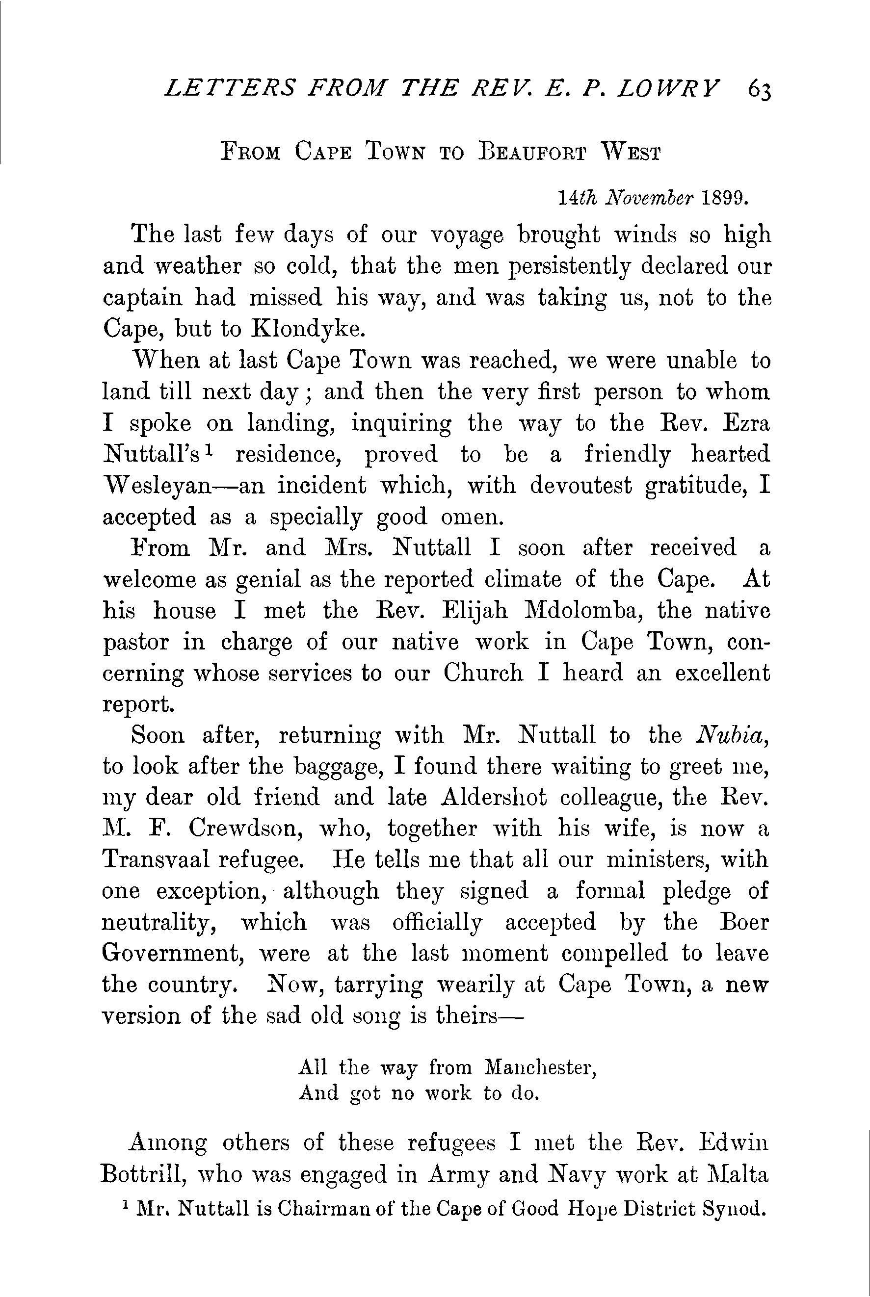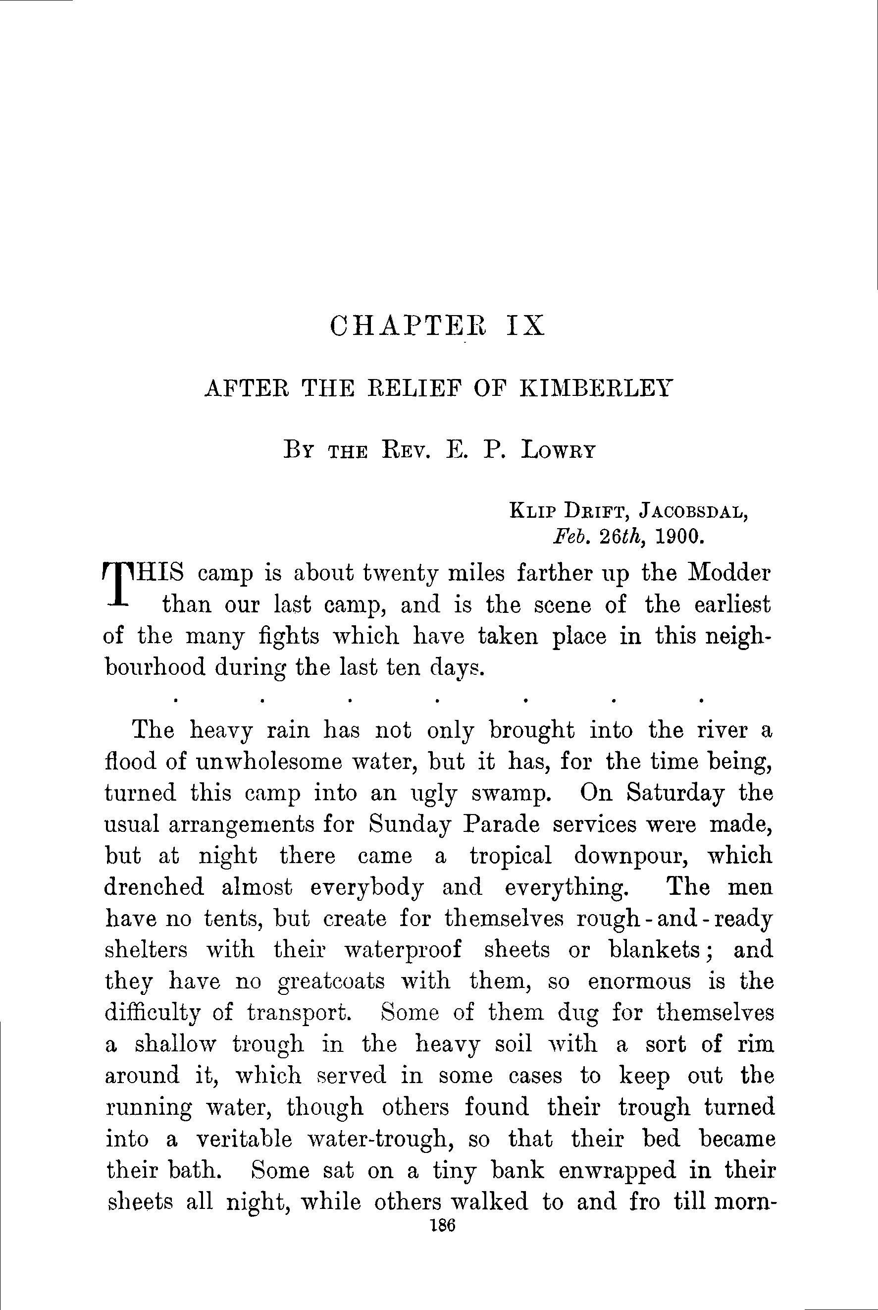 The letters written by our chaplains are also incomplete. Those which appear have been selected from the columns of the Methodist Recorder and the Methodist Times. We had hoped to include all the communications to the English Methodist newspapers. A difficulty, however, presented itself. To have included a larger number of letters would have increased the size, and therefore the cost, of the volume to an undesirable extent. We have therefore been compelled to make a selection. Mr. Lowry's letters are complete, and the whole series will be found to give a fairly consecutive view of the experiences of our chaplains over nearly the whole field. At the date of publication no letters had arrived from relieved Mafeking.