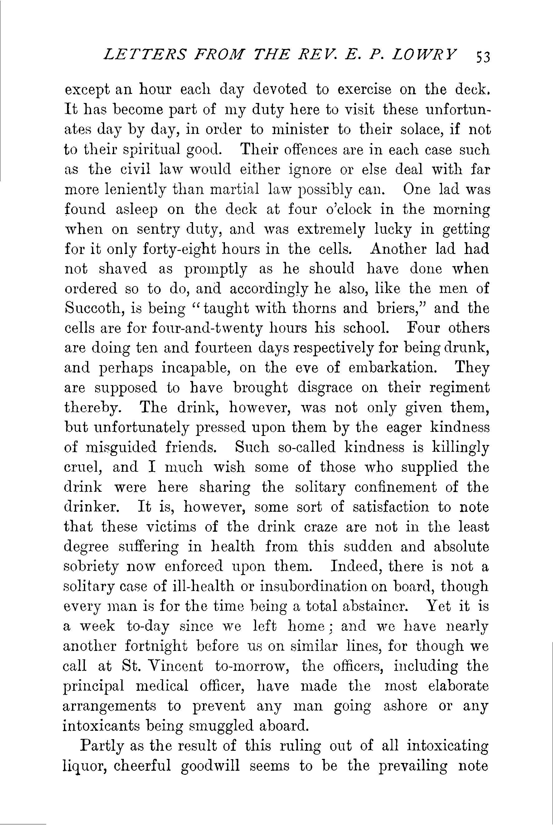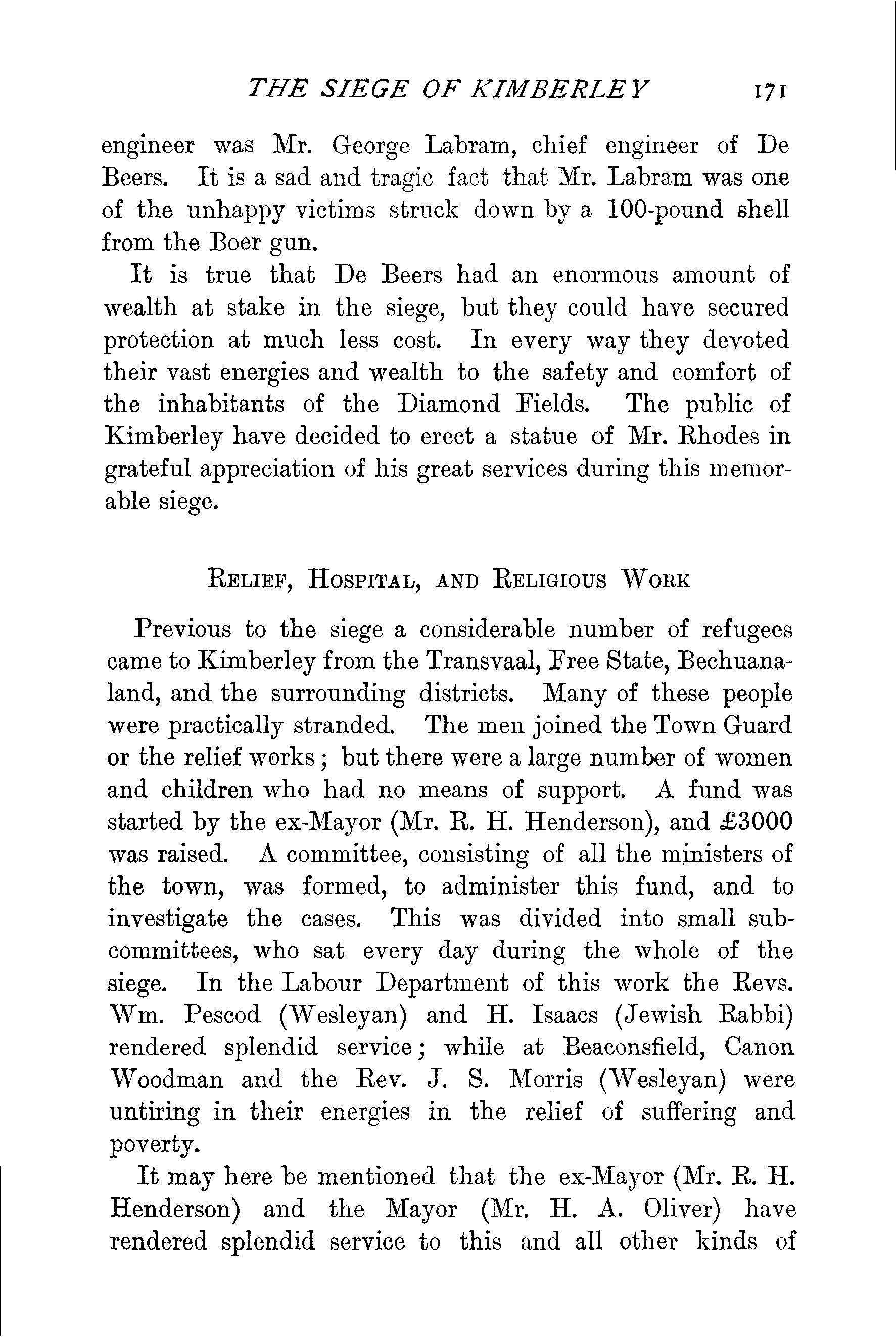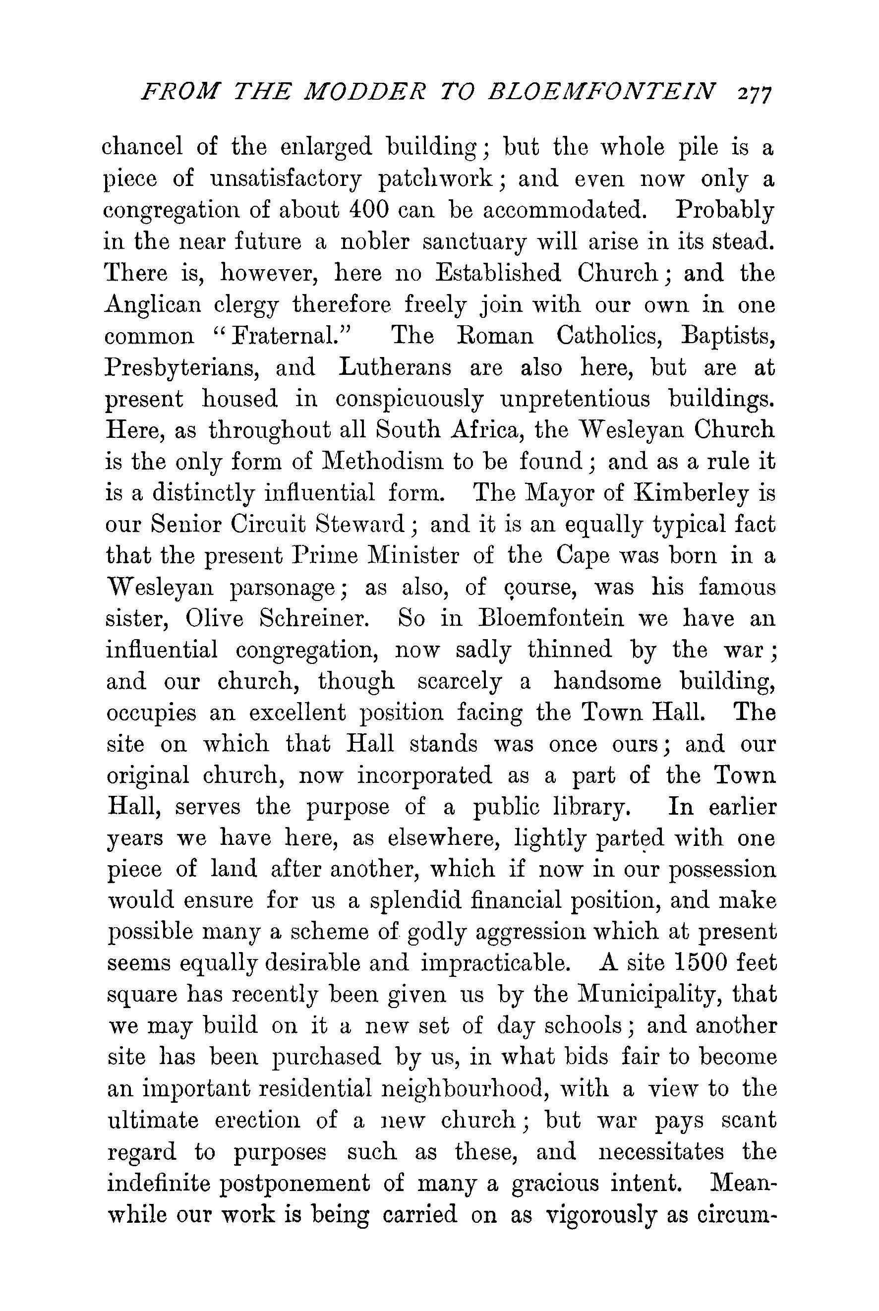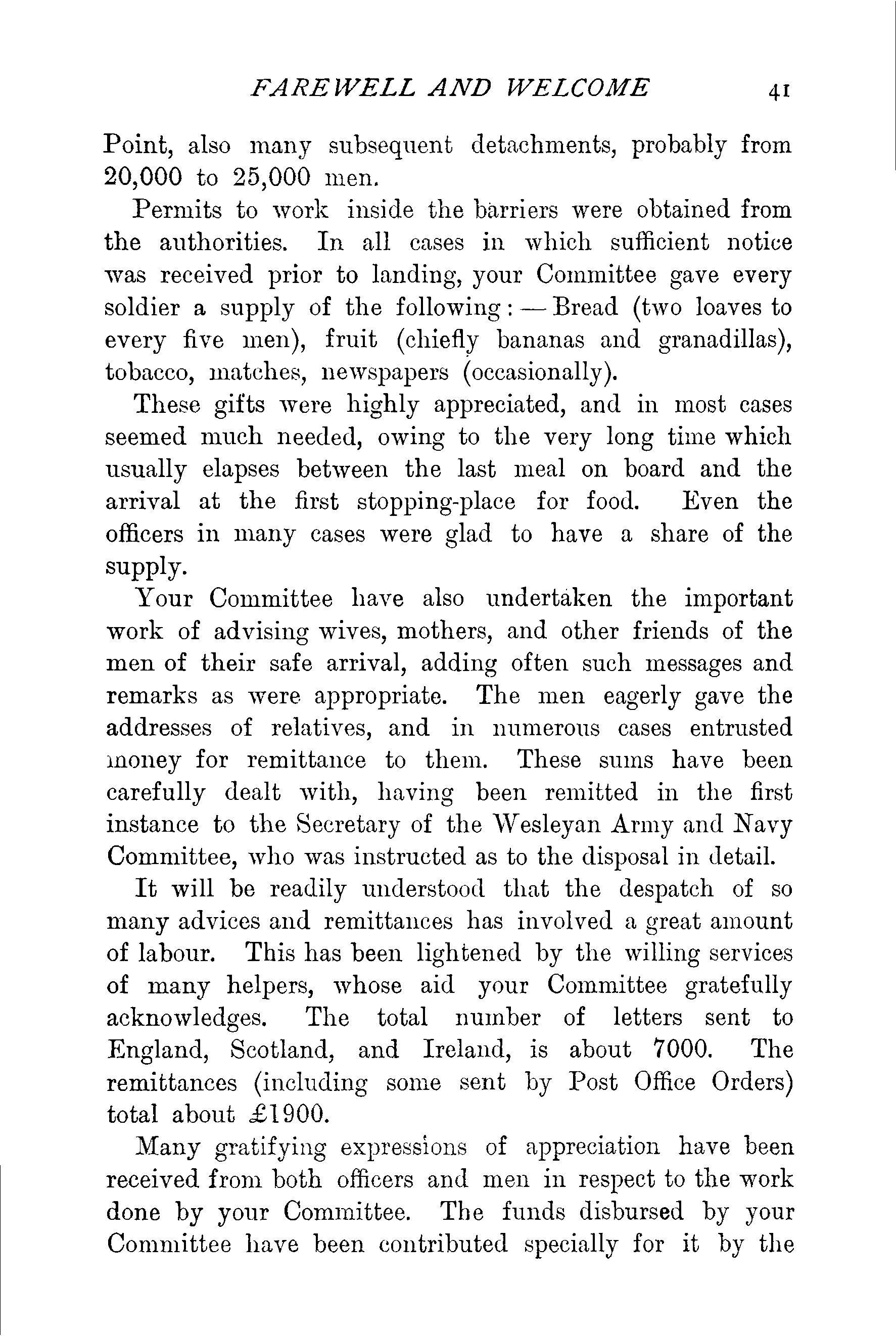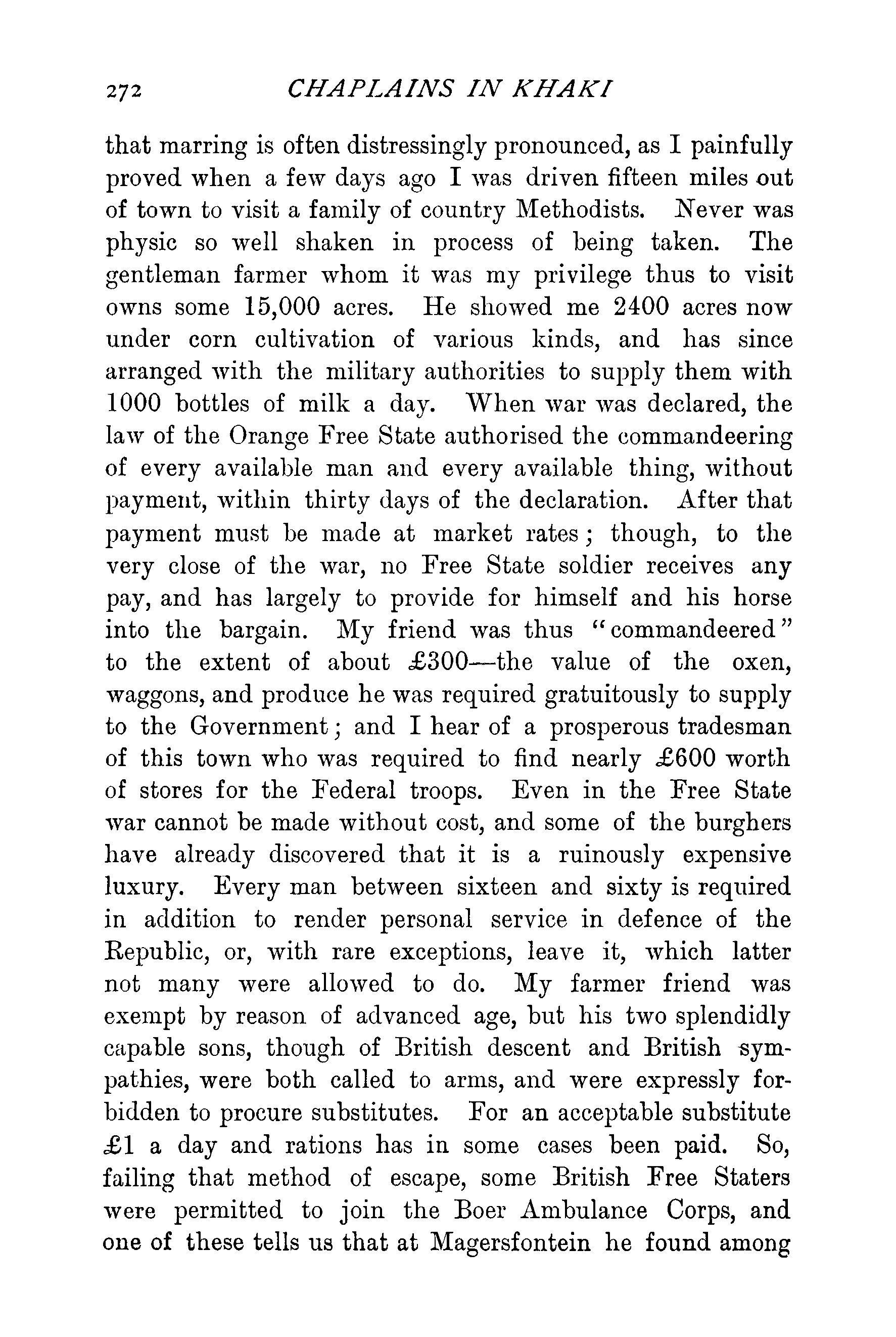 The letters written by our chaplains are also incomplete. Those which appear have been selected from the columns of the Methodist Recorder and the Methodist Times. We had hoped to include all the communications to the English Methodist newspapers. A difficulty, however, presented itself. To have included a larger number of letters would have increased the size, and therefore the cost, of the volume to an undesirable extent. We have therefore been compelled to make a selection. Mr. Lowry's letters are complete, and the whole series will be found to give a fairly consecutive view of the experiences of our chaplains over nearly the whole field. At the date of publication no letters had arrived from relieved Mafeking.