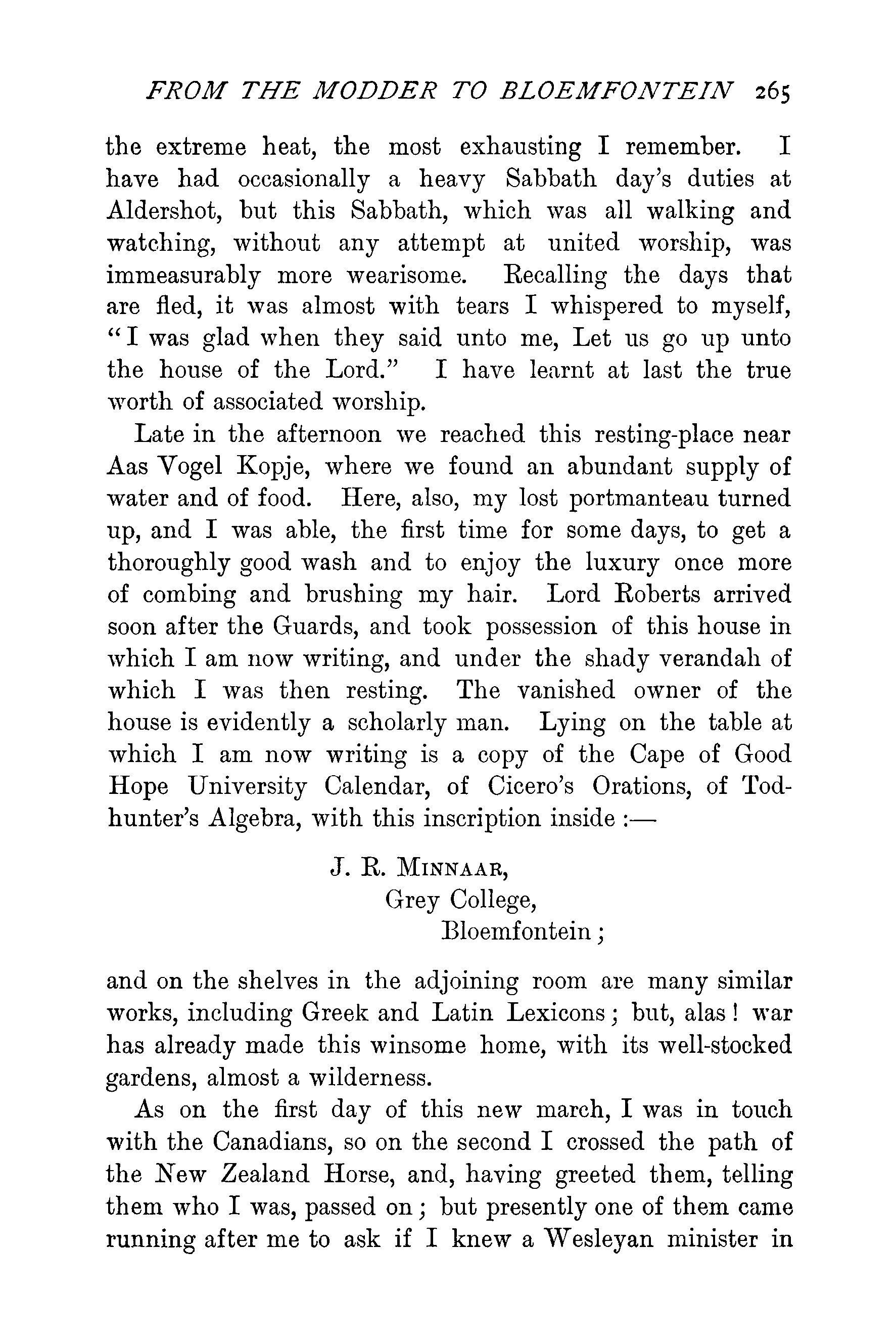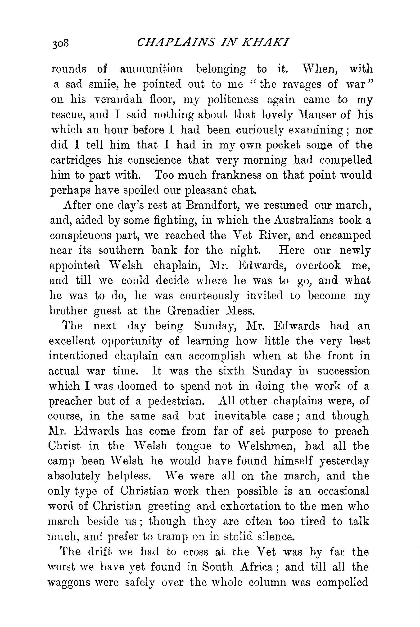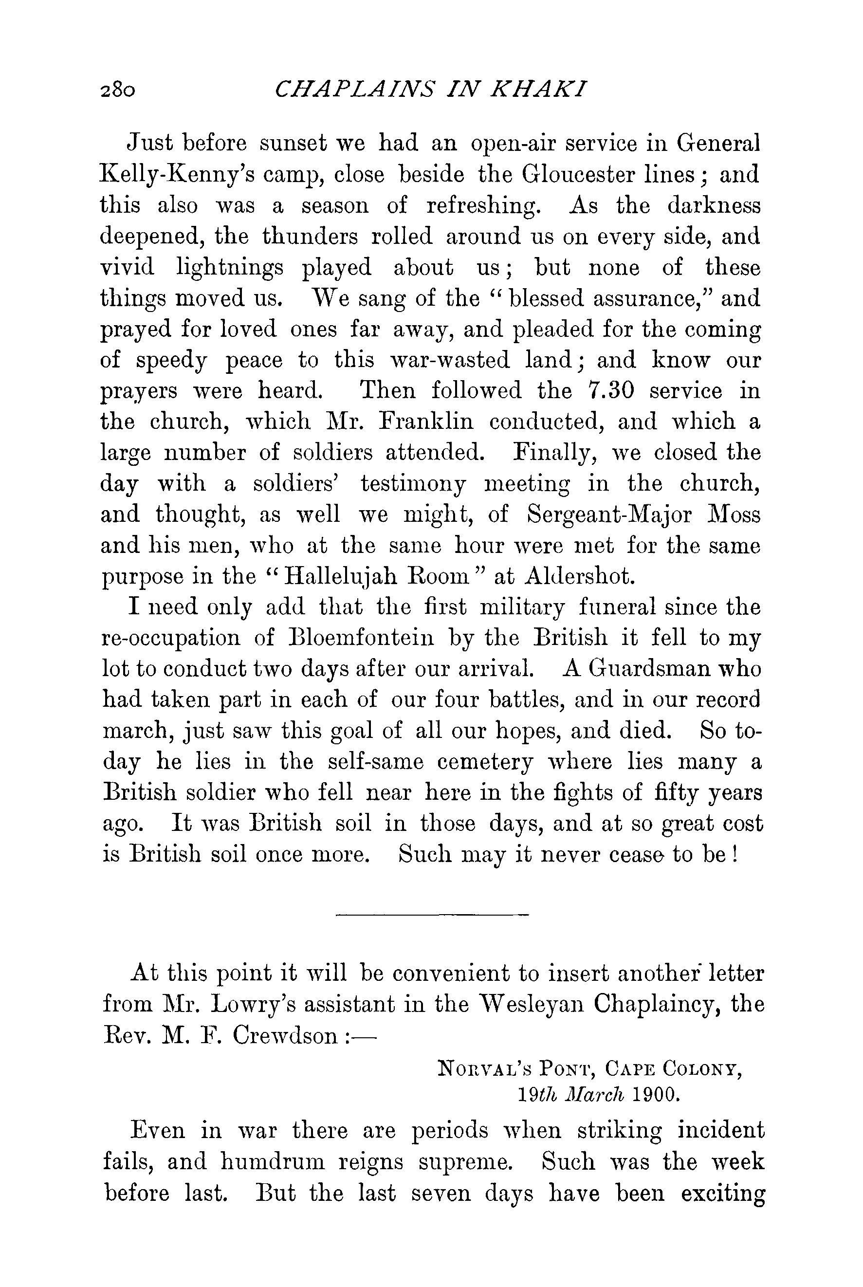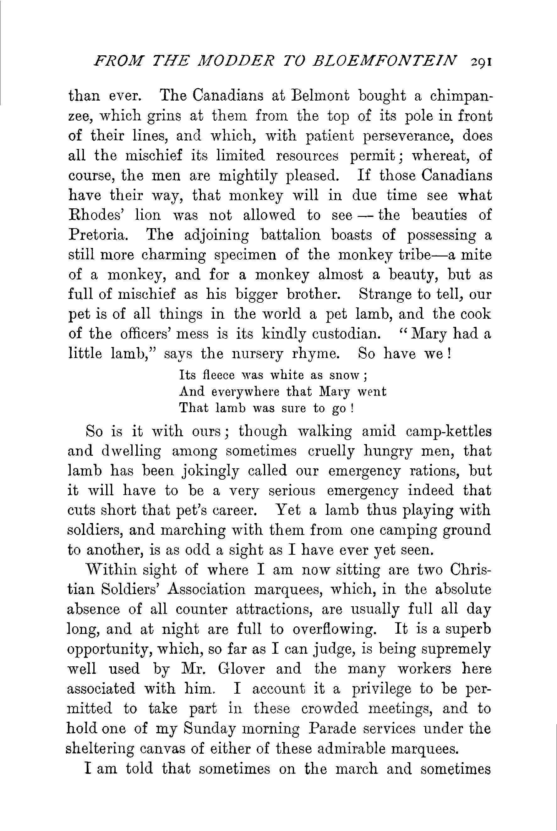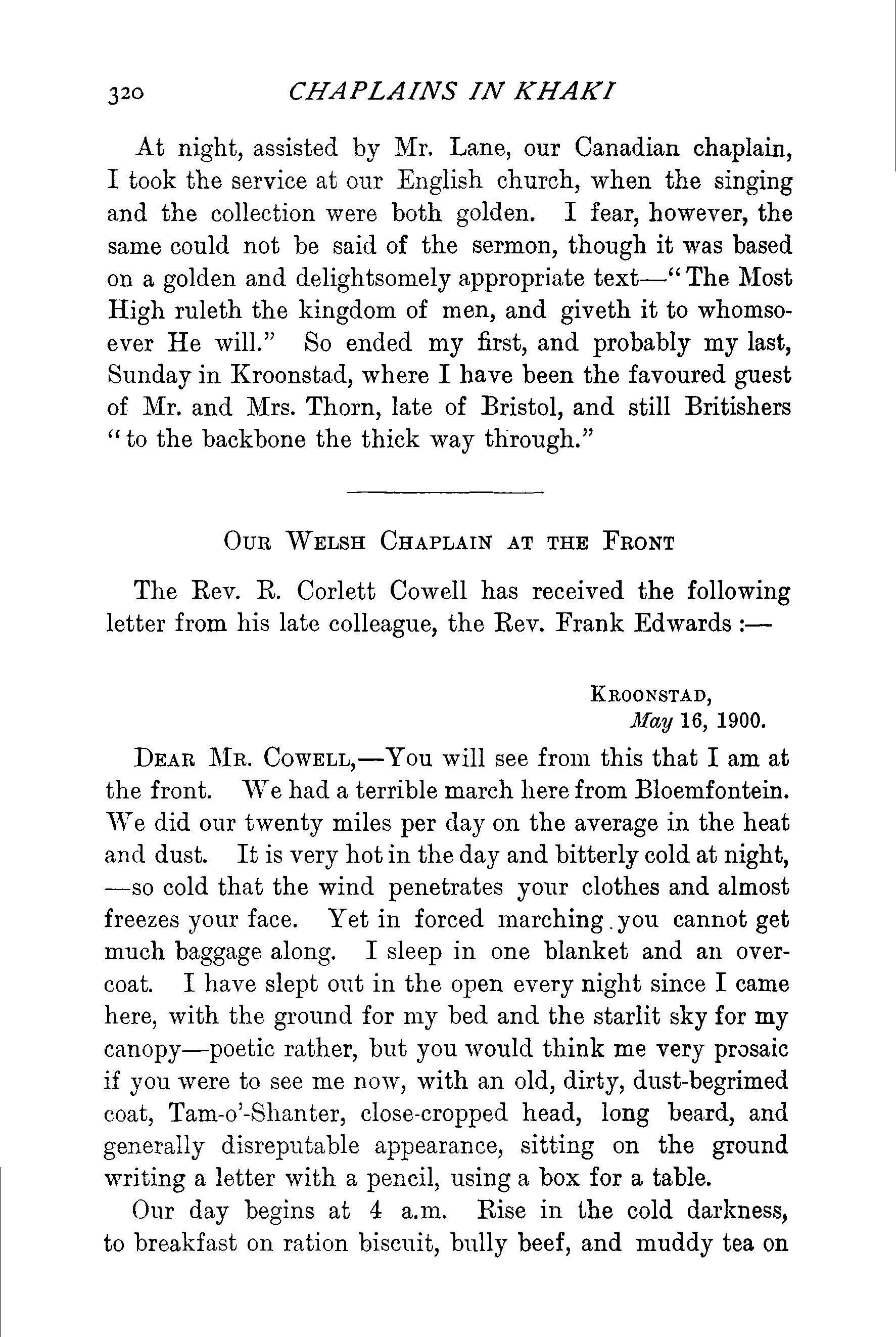 I was at the battle of Vet River (only a spectator), and on Sunday Lord Roberts sent me to the Seventh Division, w here I am sole Nonconformist chaplain. I am very happy out here. It, suits me splendidly. I am as healthy as can be. The first week was very trying. I was a bit seedy with the food and change from heat to cold, and vice 'l:el's(( / but now I am hungry all day, and sleep like a dormouse. I have had my first fight. I was allowed to go up with the battalion right into the battle, and was in the firing line with the water-cart which goes into action. When the first shell screamed over my head I felt a bit cold inside, but soon got over that; another made me feel a bit queer when it burst with a thunder - clap on the very bank under which our company was resting. Soon the word "Advance! was given, and we had to move out into the fire-zone. Some bushes sheltered us for a while, but the shells were flying over, and the bullets touched the branches in a way that was not exactly comfortable. Our battalion lay here a while, but, having by this time got used to it, I went forward to the batteries, and had a look through the telescope at the enemy's position, but the shells were falling fast, almost between every gun. One poor fellow was hit in the stomach. It was an awful thud and a sickening sight. Just then the General and his Staff came galloping up on to the plain between the batteries and the place where our battalion was waiting the order to advance, which was soon given. The East Lancashires moved straight into the deadly shower. Our men came up on their right, as steady as on parade. The General wanted a message taken. All his Staff were off in different directions. Saluting him, I asked that I might go. He looked only at my shoulder, saw I was a captain, and sent me with an order to a halfbattalion. Taking a horse which a servant held close by, I was off like a shot. It was grand. I felt I was doing something in the fight. The bullets spat up most viciously in