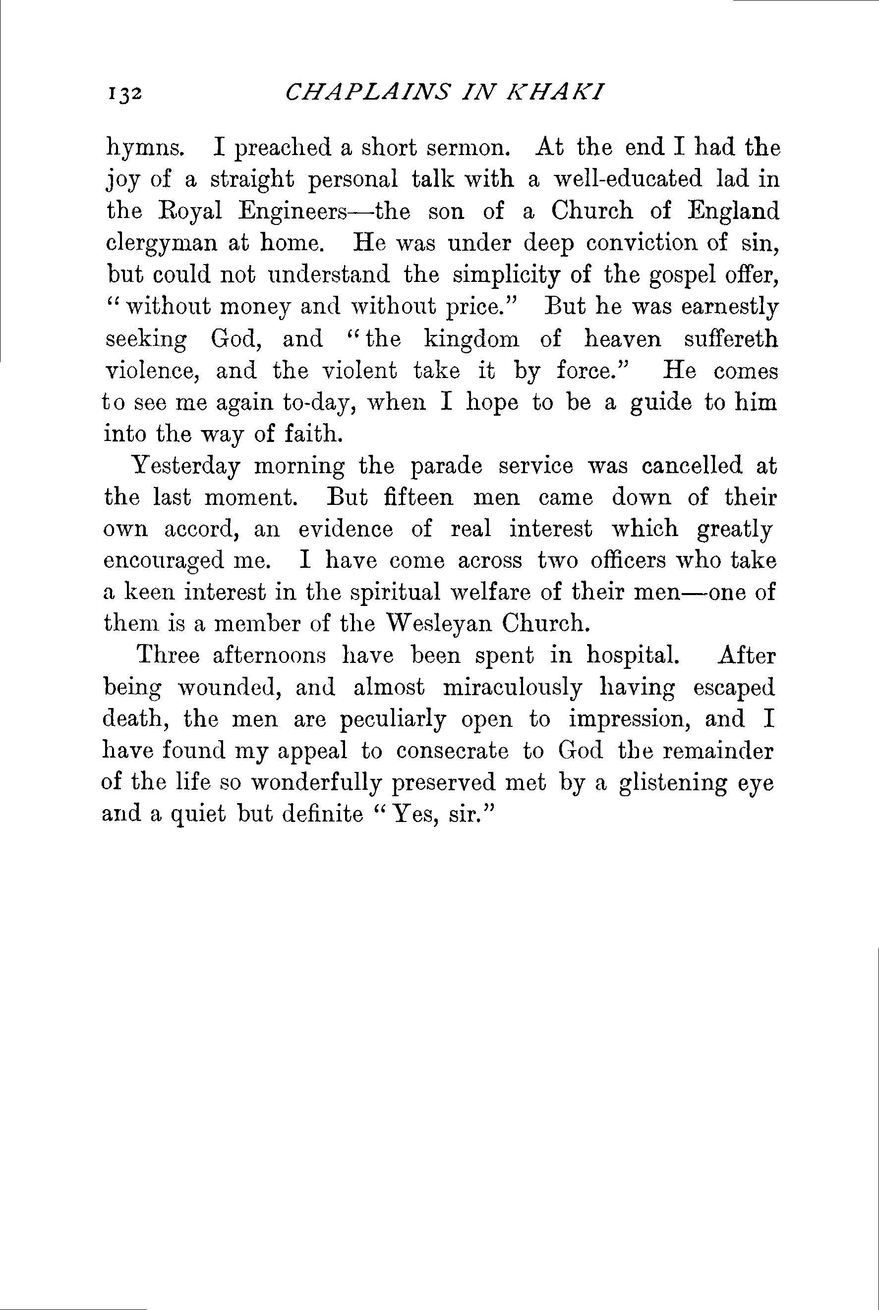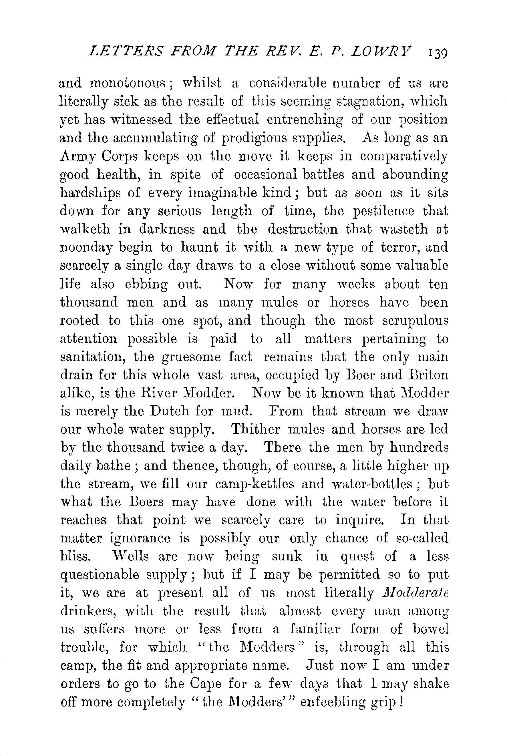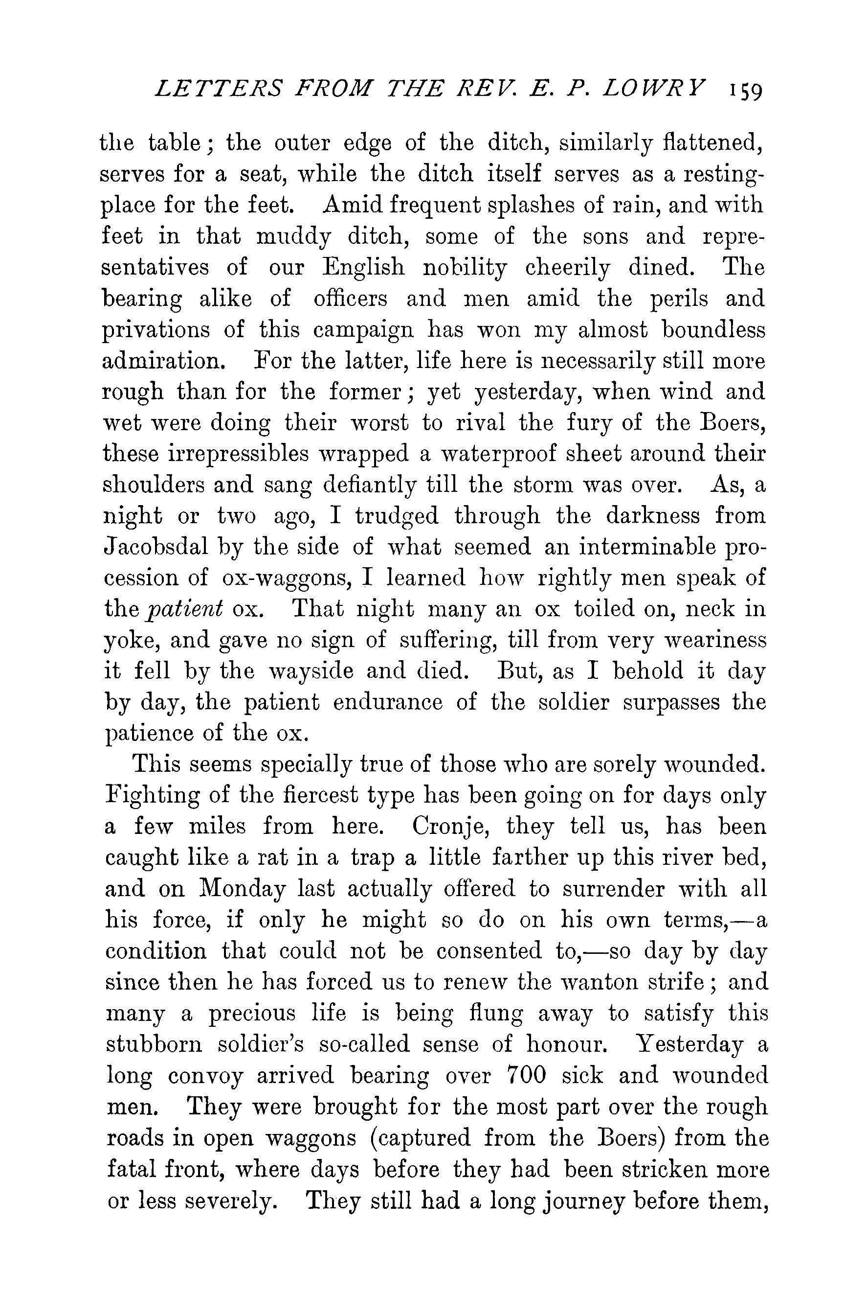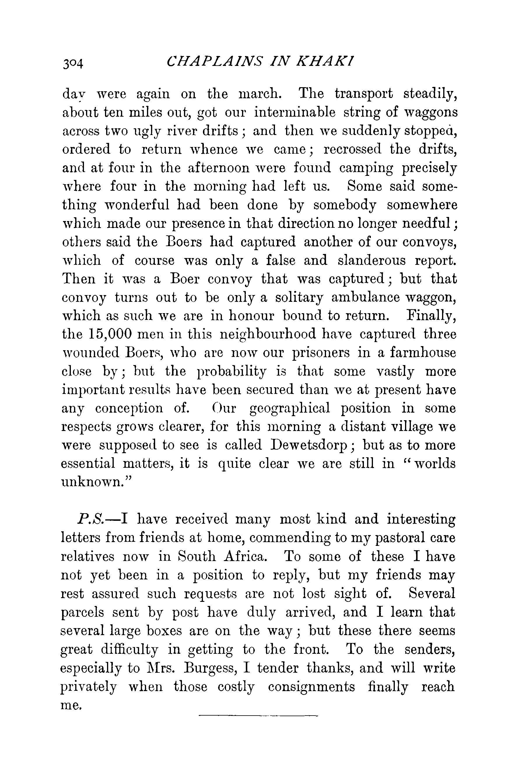 I was at the battle of Vet River (only a spectator), and on Sunday Lord Roberts sent me to the Seventh Division, w here I am sole Nonconformist chaplain. I am very happy out here. It, suits me splendidly. I am as healthy as can be. The first week was very trying. I was a bit seedy with the food and change from heat to cold, and vice 'l:el's(( / but now I am hungry all day, and sleep like a dormouse. I have had my first fight. I was allowed to go up with the battalion right into the battle, and was in the firing line with the water-cart which goes into action. When the first shell screamed over my head I felt a bit cold inside, but soon got over that; another made me feel a bit queer when it burst with a thunder - clap on the very bank under which our company was resting. Soon the word "Advance! was given, and we had to move out into the fire-zone. Some bushes sheltered us for a while, but the shells were flying over, and the bullets touched the branches in a way that was not exactly comfortable. Our battalion lay here a while, but, having by this time got used to it, I went forward to the batteries, and had a look through the telescope at the enemy's position, but the shells were falling fast, almost between every gun. One poor fellow was hit in the stomach. It was an awful thud and a sickening sight. Just then the General and his Staff came galloping up on to the plain between the batteries and the place where our battalion was waiting the order to advance, which was soon given. The East Lancashires moved straight into the deadly shower. Our men came up on their right, as steady as on parade. The General wanted a message taken. All his Staff were off in different directions. Saluting him, I asked that I might go. He looked only at my shoulder, saw I was a captain, and sent me with an order to a halfbattalion. Taking a horse which a servant held close by, I was off like a shot. It was grand. I felt I was doing something in the fight. The bullets spat up most viciously in
