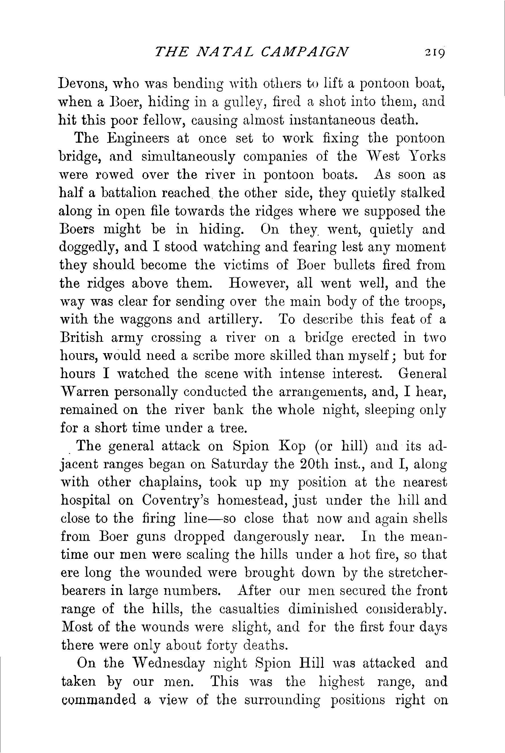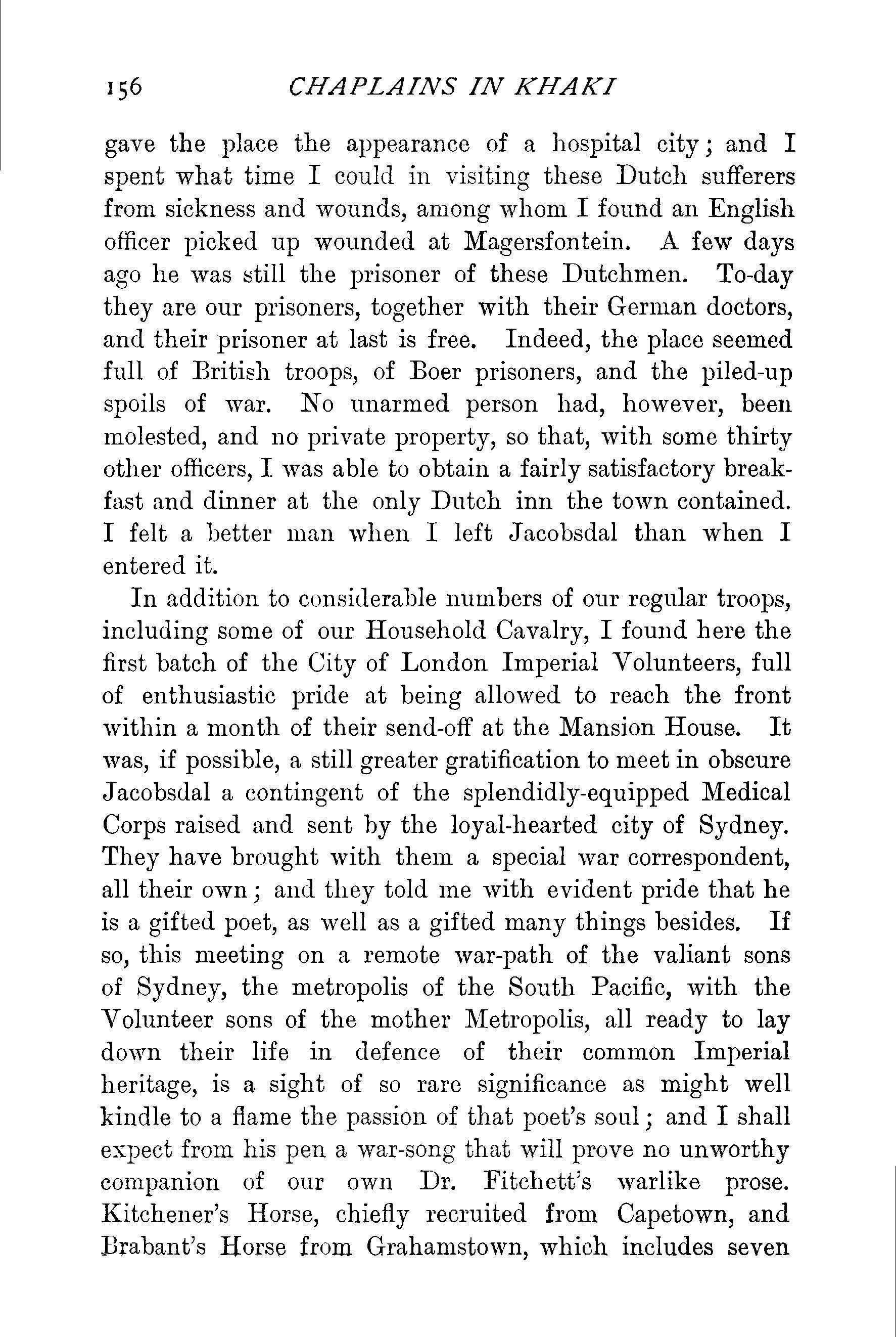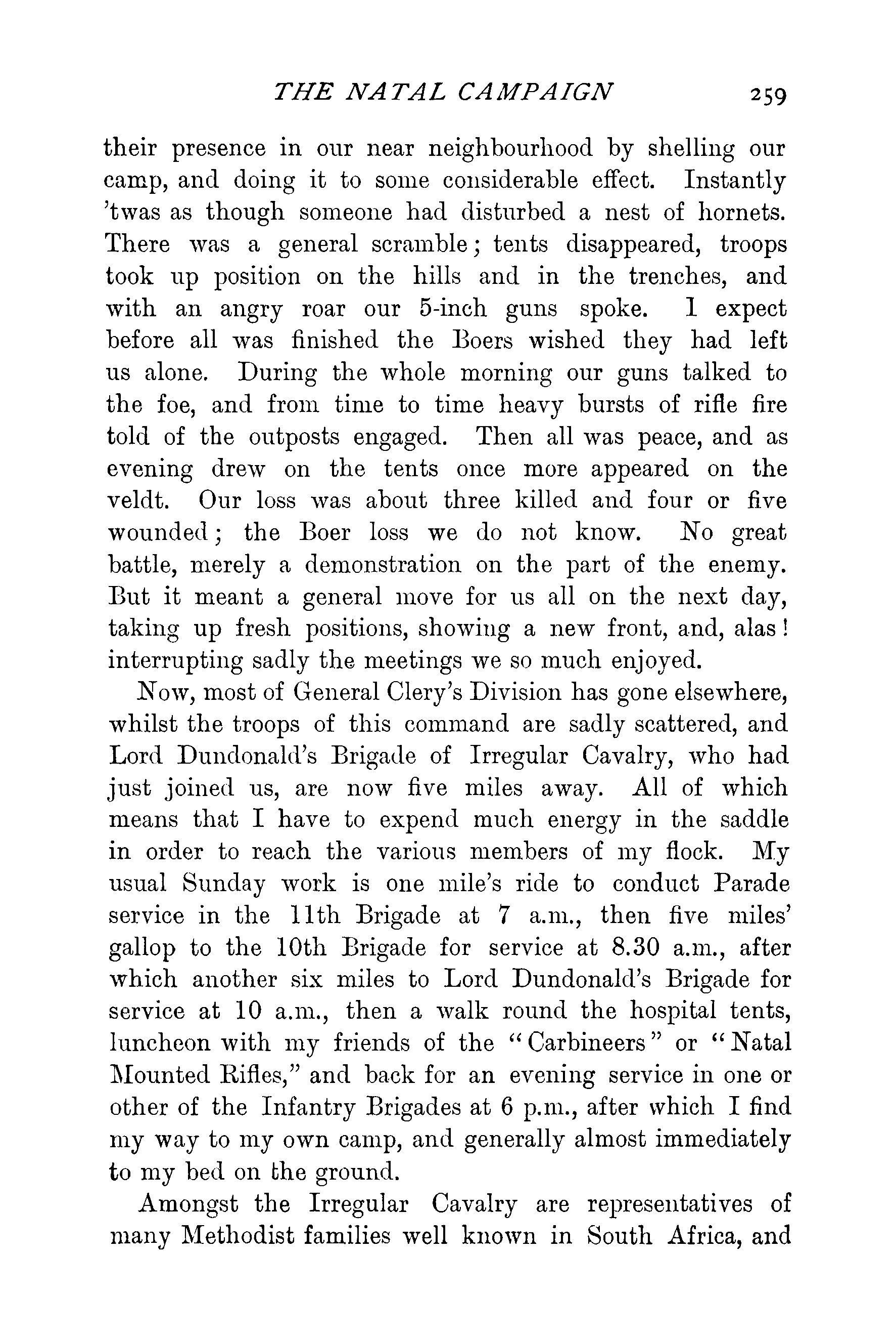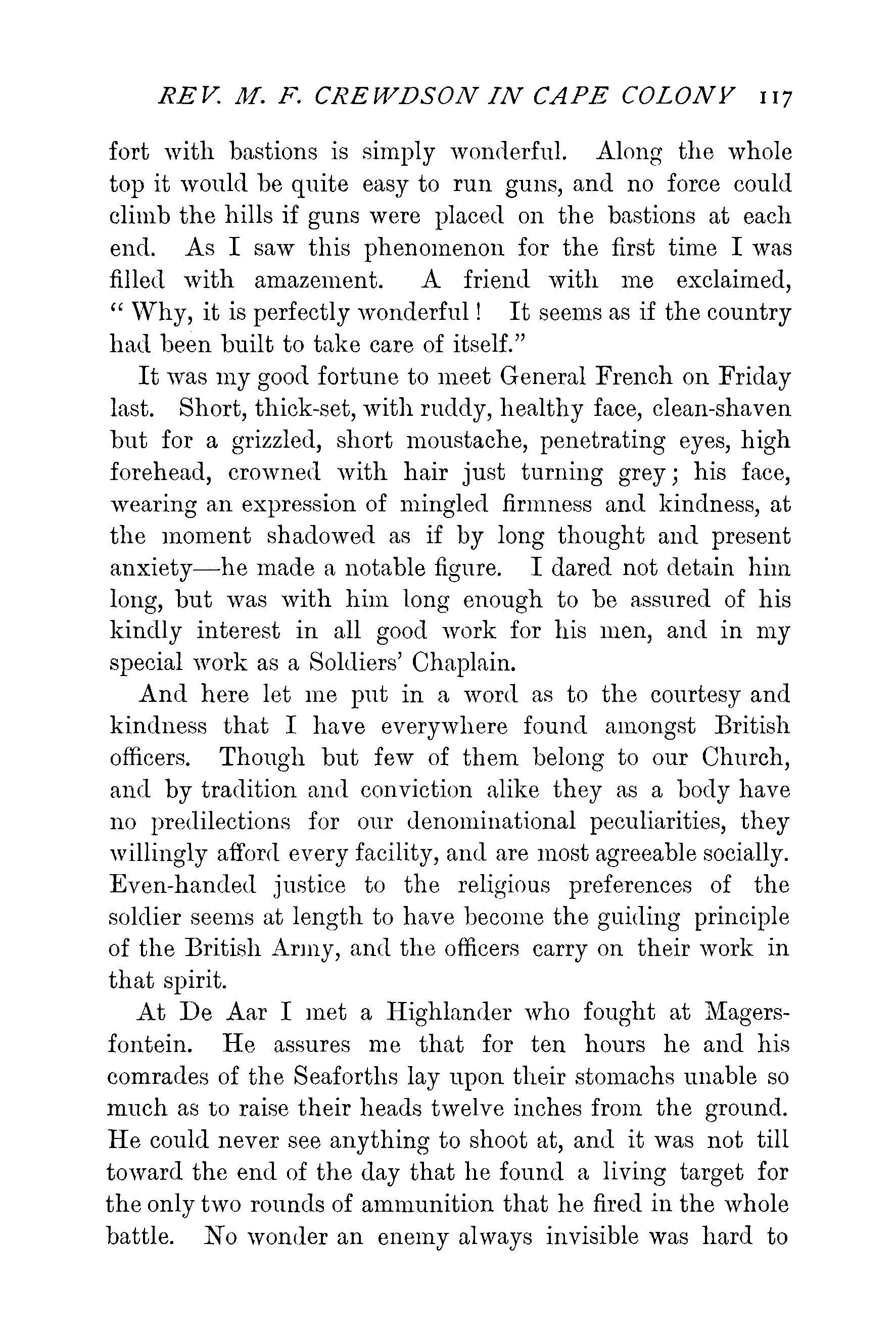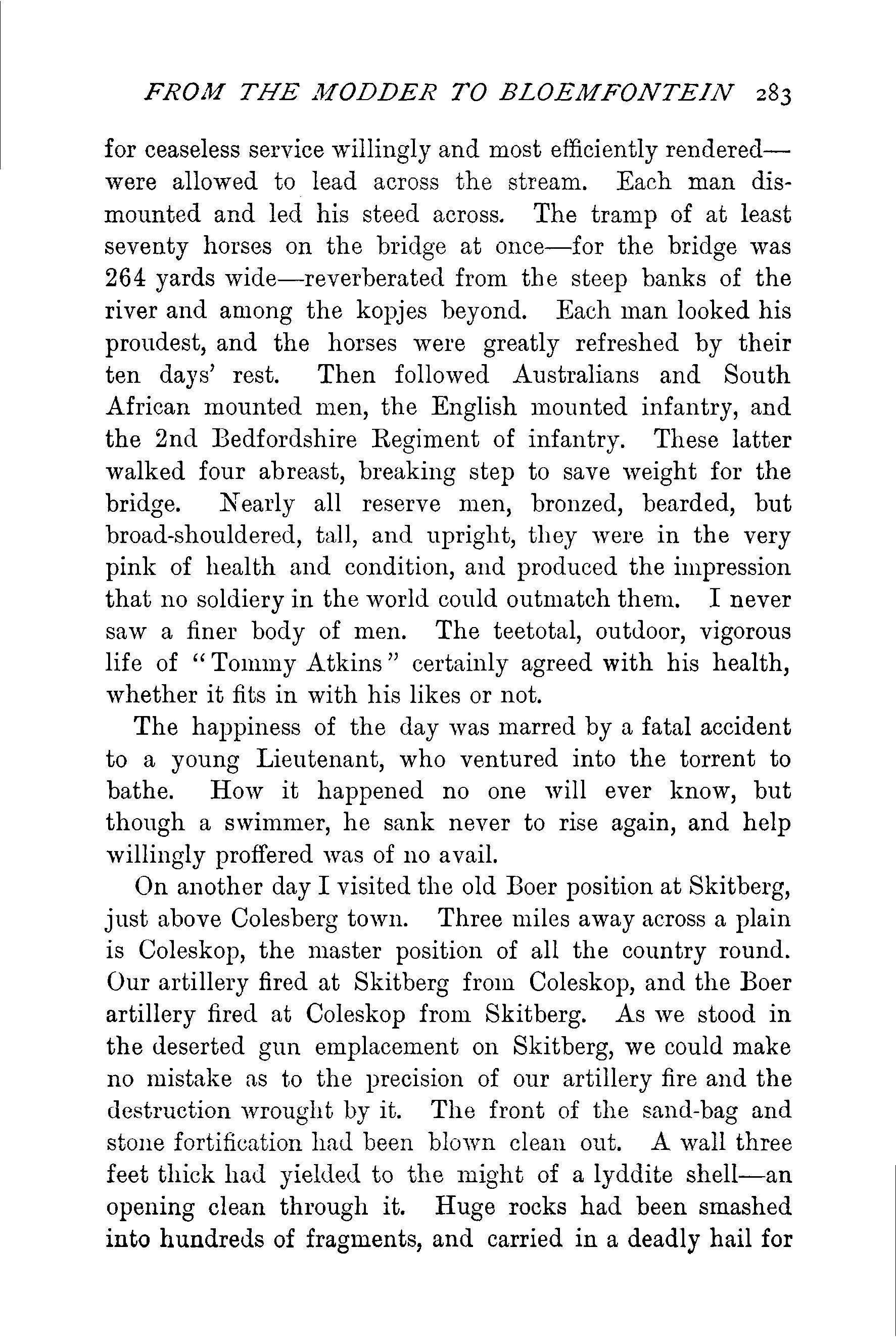 I was at the battle of Vet River (only a spectator), and on Sunday Lord Roberts sent me to the Seventh Division, w here I am sole Nonconformist chaplain. I am very happy out here. It, suits me splendidly. I am as healthy as can be. The first week was very trying. I was a bit seedy with the food and change from heat to cold, and vice 'l:el's(( / but now I am hungry all day, and sleep like a dormouse. I have had my first fight. I was allowed to go up with the battalion right into the battle, and was in the firing line with the water-cart which goes into action. When the first shell screamed over my head I felt a bit cold inside, but soon got over that; another made me feel a bit queer when it burst with a thunder - clap on the very bank under which our company was resting. Soon the word "Advance! was given, and we had to move out into the fire-zone. Some bushes sheltered us for a while, but the shells were flying over, and the bullets touched the branches in a way that was not exactly comfortable. Our battalion lay here a while, but, having by this time got used to it, I went forward to the batteries, and had a look through the telescope at the enemy's position, but the shells were falling fast, almost between every gun. One poor fellow was hit in the stomach. It was an awful thud and a sickening sight. Just then the General and his Staff came galloping up on to the plain between the batteries and the place where our battalion was waiting the order to advance, which was soon given. The East Lancashires moved straight into the deadly shower. Our men came up on their right, as steady as on parade. The General wanted a message taken. All his Staff were off in different directions. Saluting him, I asked that I might go. He looked only at my shoulder, saw I was a captain, and sent me with an order to a halfbattalion. Taking a horse which a servant held close by, I was off like a shot. It was grand. I felt I was doing something in the fight. The bullets spat up most viciously in