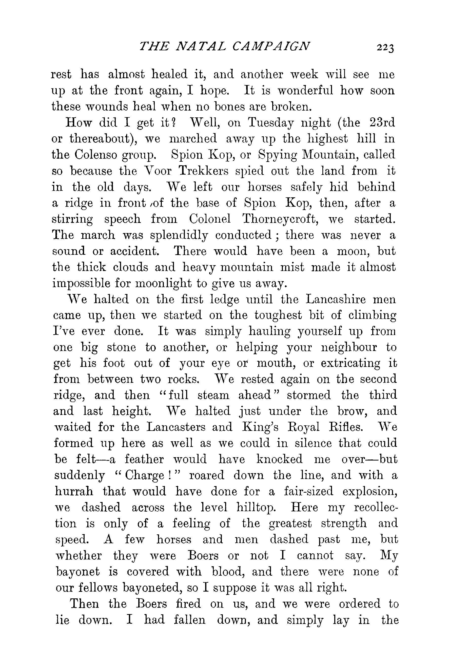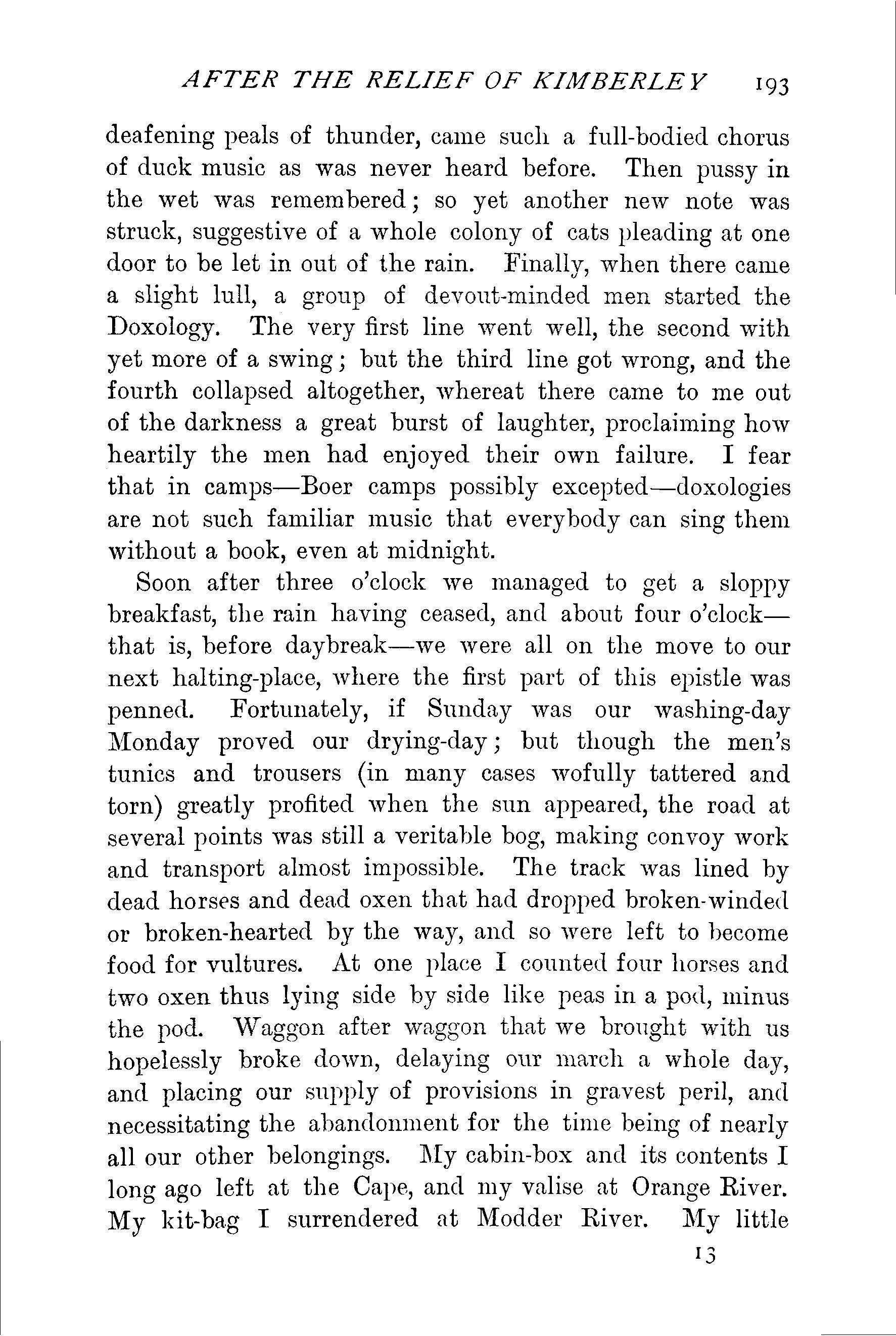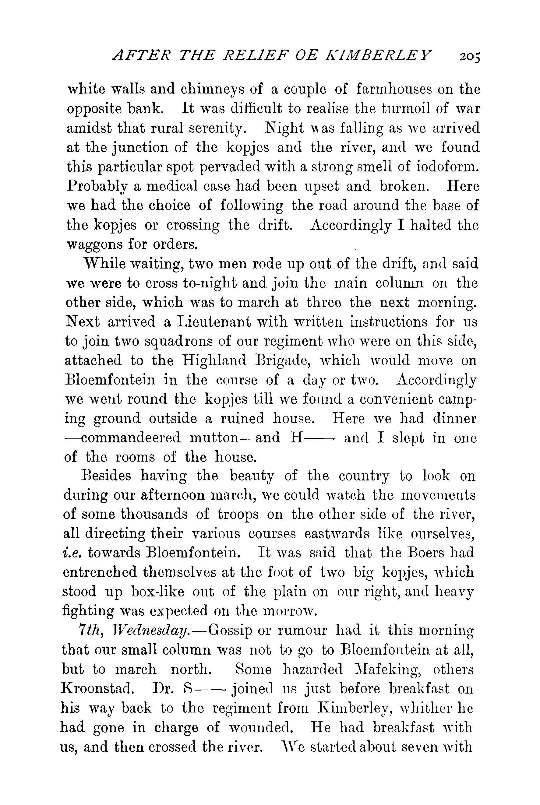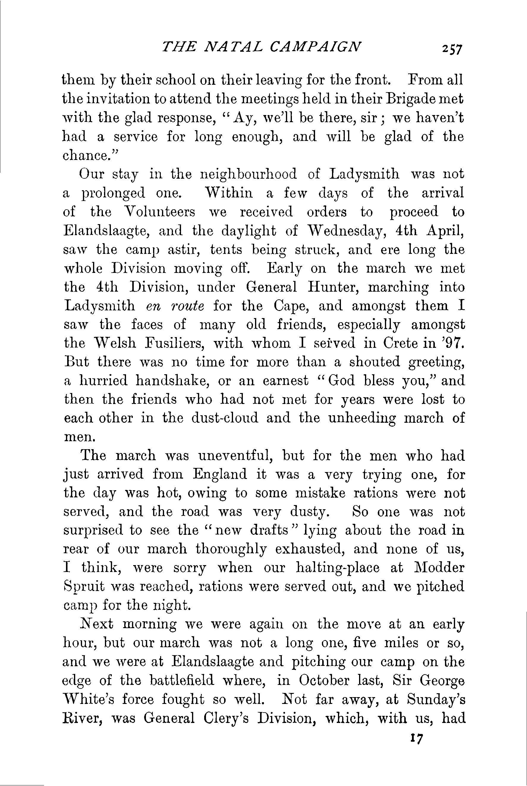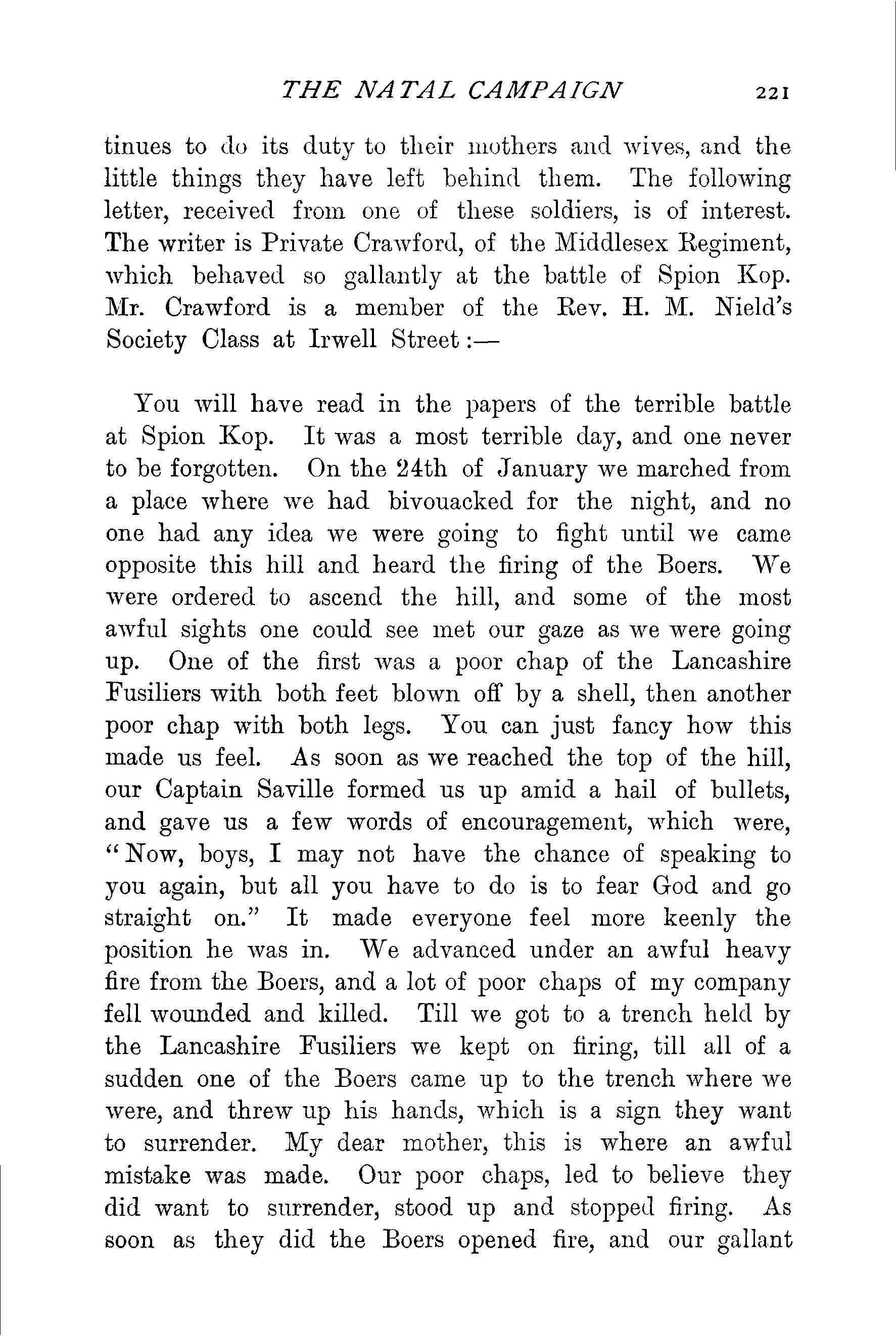 I was at the battle of Vet River (only a spectator), and on Sunday Lord Roberts sent me to the Seventh Division, w here I am sole Nonconformist chaplain. I am very happy out here. It, suits me splendidly. I am as healthy as can be. The first week was very trying. I was a bit seedy with the food and change from heat to cold, and vice 'l:el's(( / but now I am hungry all day, and sleep like a dormouse. I have had my first fight. I was allowed to go up with the battalion right into the battle, and was in the firing line with the water-cart which goes into action. When the first shell screamed over my head I felt a bit cold inside, but soon got over that; another made me feel a bit queer when it burst with a thunder - clap on the very bank under which our company was resting. Soon the word "Advance! was given, and we had to move out into the fire-zone. Some bushes sheltered us for a while, but the shells were flying over, and the bullets touched the branches in a way that was not exactly comfortable. Our battalion lay here a while, but, having by this time got used to it, I went forward to the batteries, and had a look through the telescope at the enemy's position, but the shells were falling fast, almost between every gun. One poor fellow was hit in the stomach. It was an awful thud and a sickening sight. Just then the General and his Staff came galloping up on to the plain between the batteries and the place where our battalion was waiting the order to advance, which was soon given. The East Lancashires moved straight into the deadly shower. Our men came up on their right, as steady as on parade. The General wanted a message taken. All his Staff were off in different directions. Saluting him, I asked that I might go. He looked only at my shoulder, saw I was a captain, and sent me with an order to a halfbattalion. Taking a horse which a servant held close by, I was off like a shot. It was grand. I felt I was doing something in the fight. The bullets spat up most viciously in