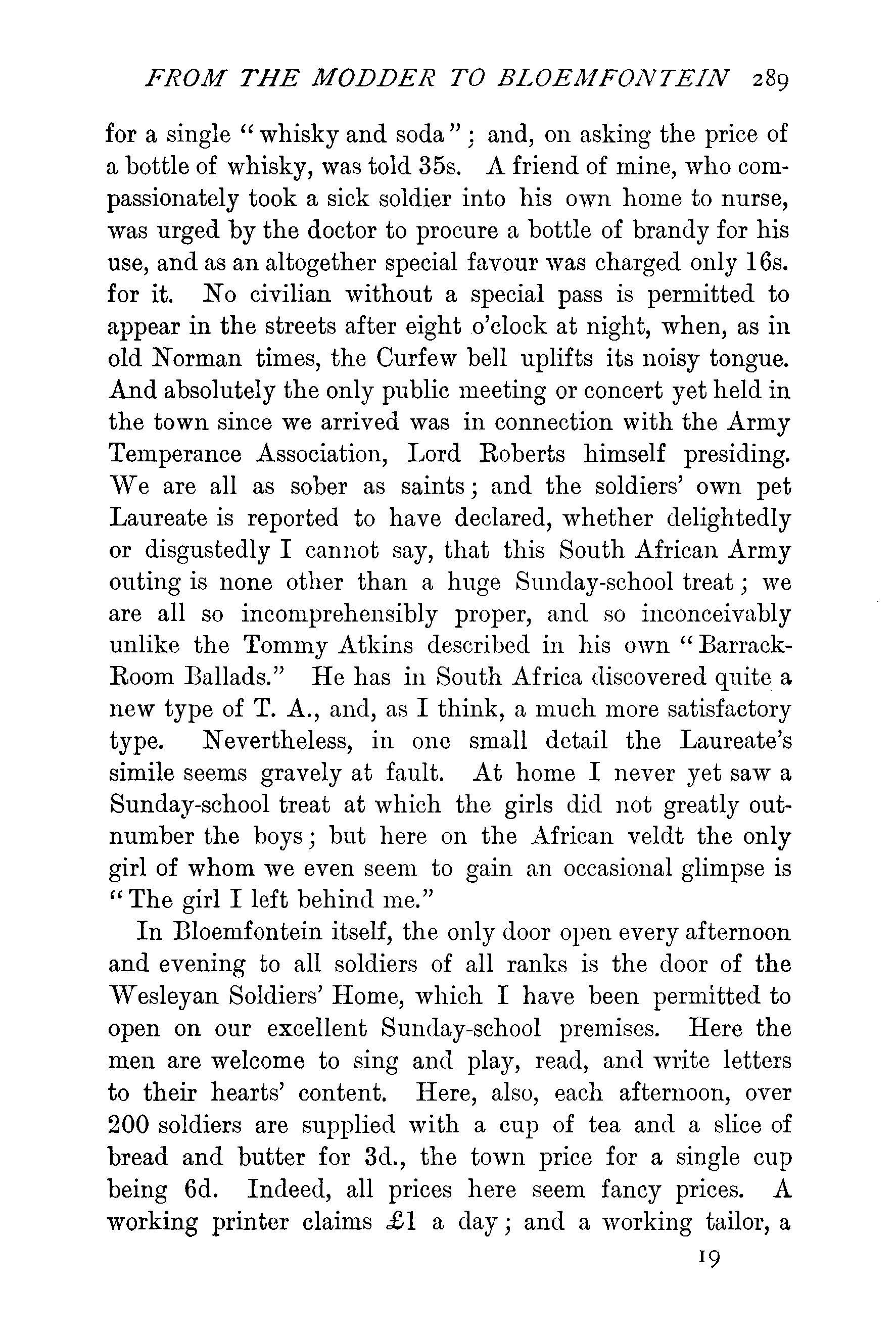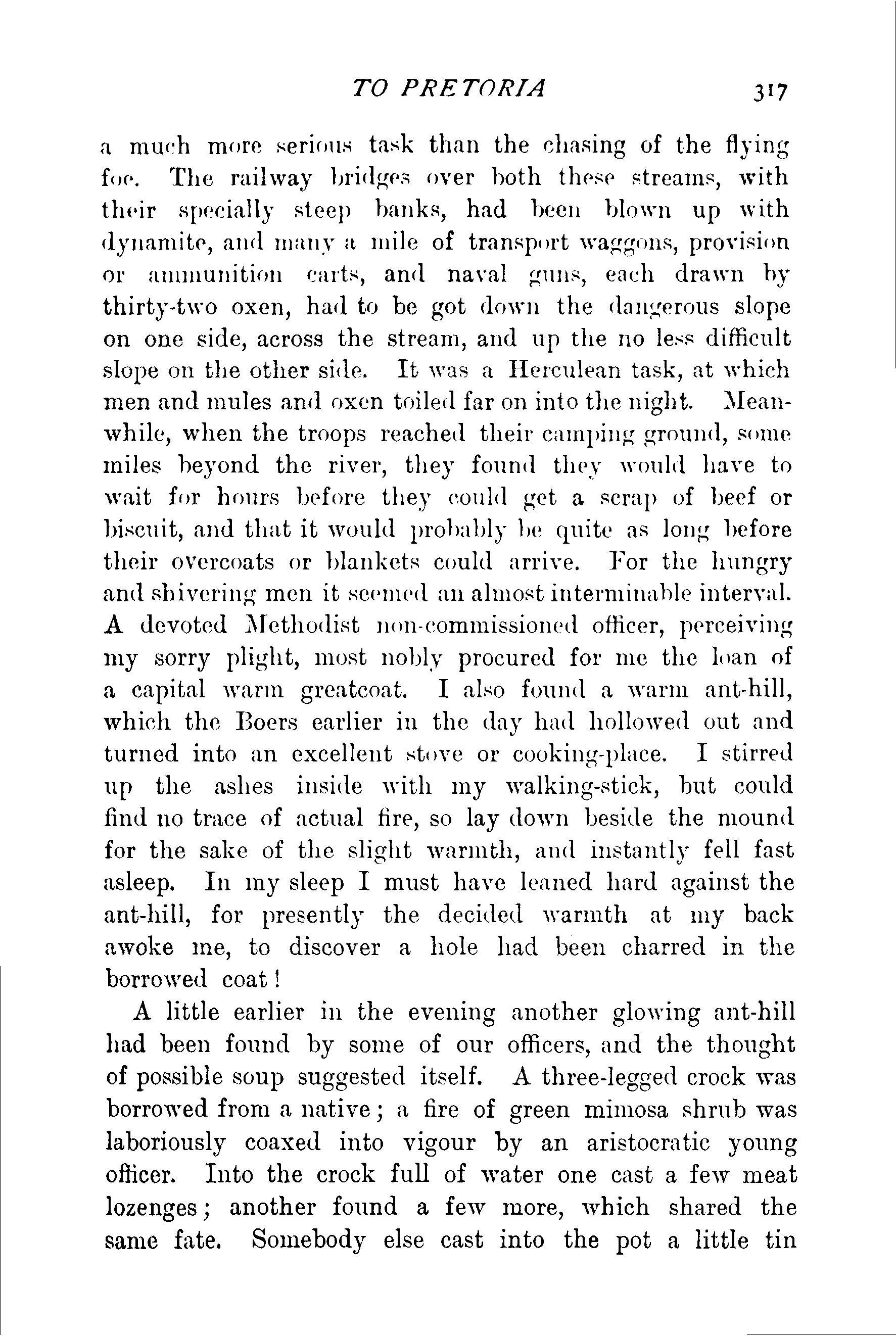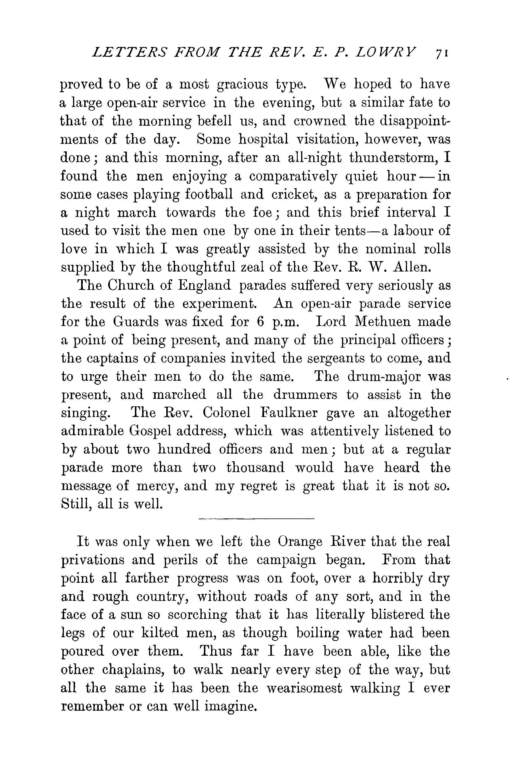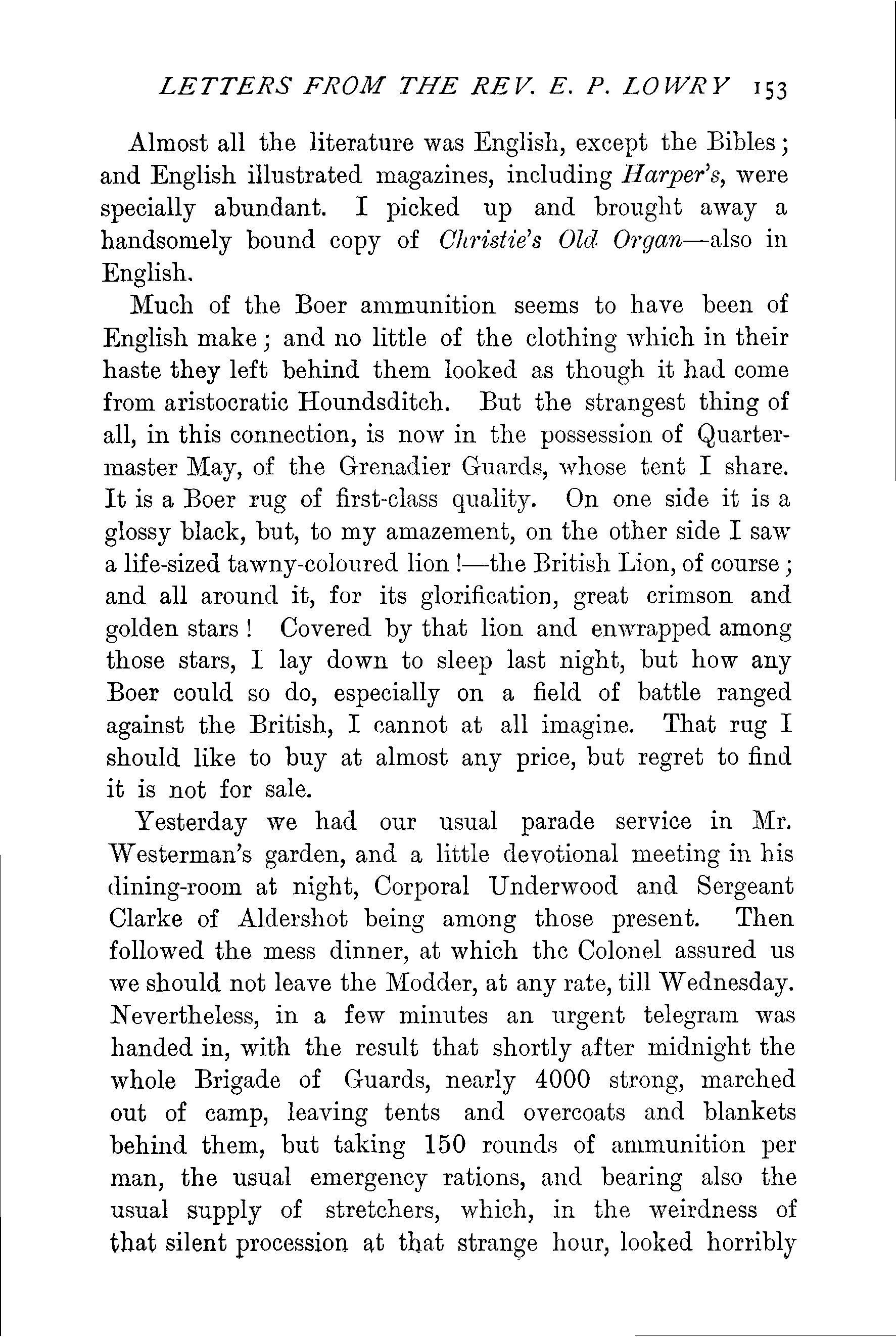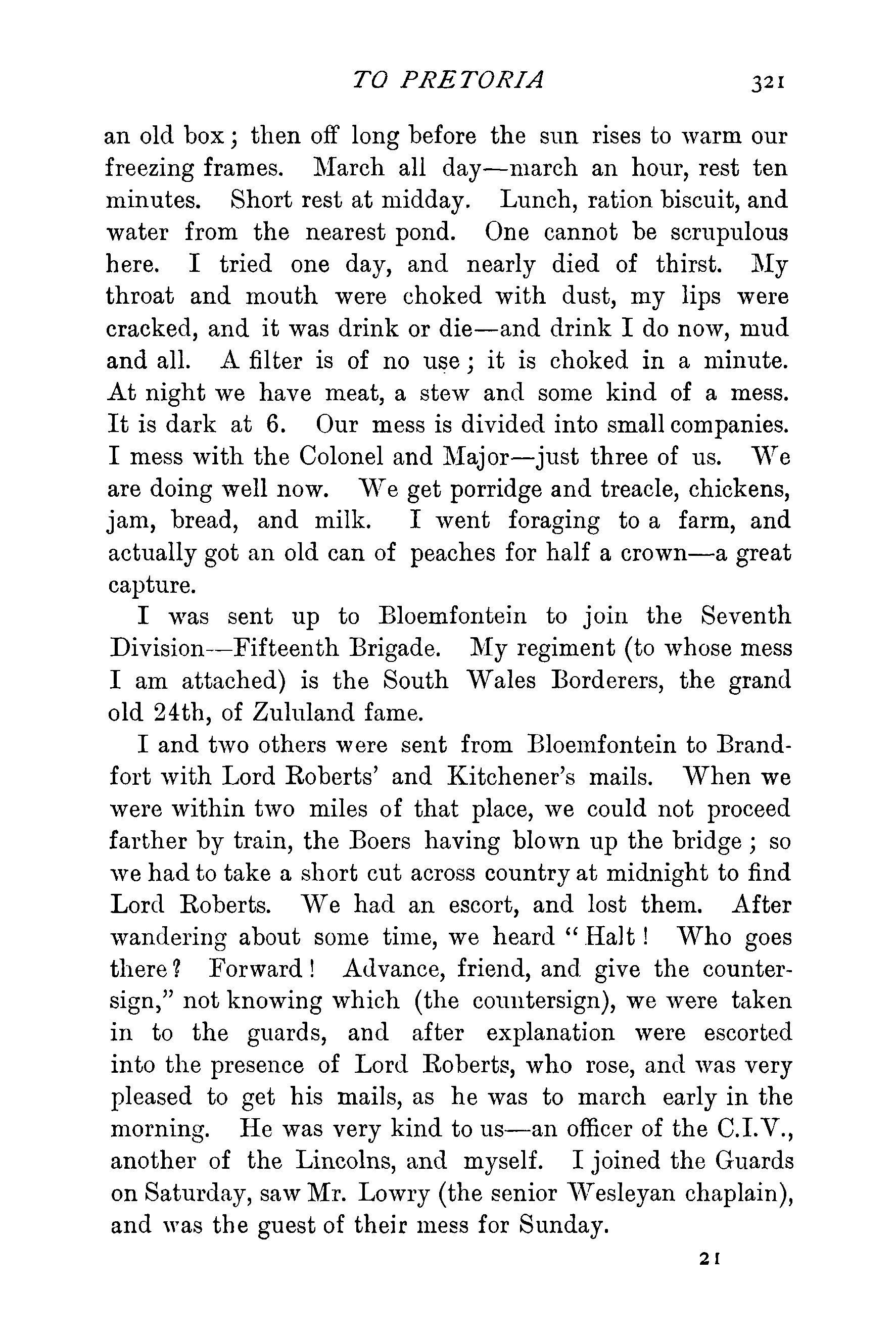 I and two others were sent from Bloemfontein to Brandfort with Lord Roberts' and Kitchener's mails. When we were within two miles of that place, we could not proceed farther by train, the Boers having blown up the bridge; so we had to take a short cut across country at midnight to find Lord Roberts. We had an escort, and lost them. After wandering about some time, we heard" Halt 1 Who goes there 1 Forward 1 Advance, friend, and give the countersign," not knowing which (the countersign), we were taken in to the guards, and after explanation were escorted into the presence of Lord Roberts, who rose, and was very pleased to get his mails, as he was to march early in the morning. He was very kind to us-an officer of the C.I.V., another of the Lincolns, and myself. I joined the Guards on Saturday, saw Mr. Lowry (the senior Wesleyan chaplain), and was the guest of their mess for Sunday.