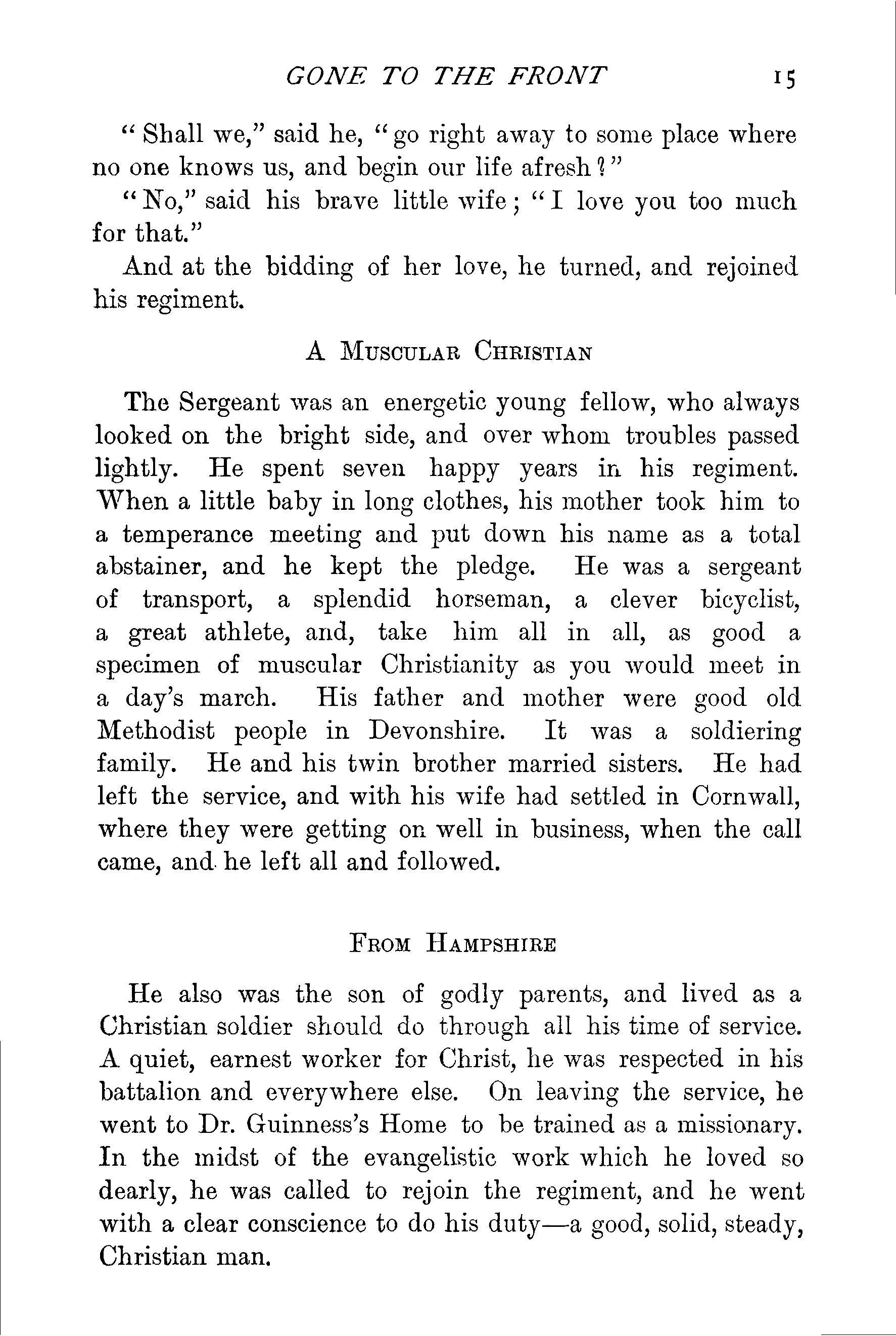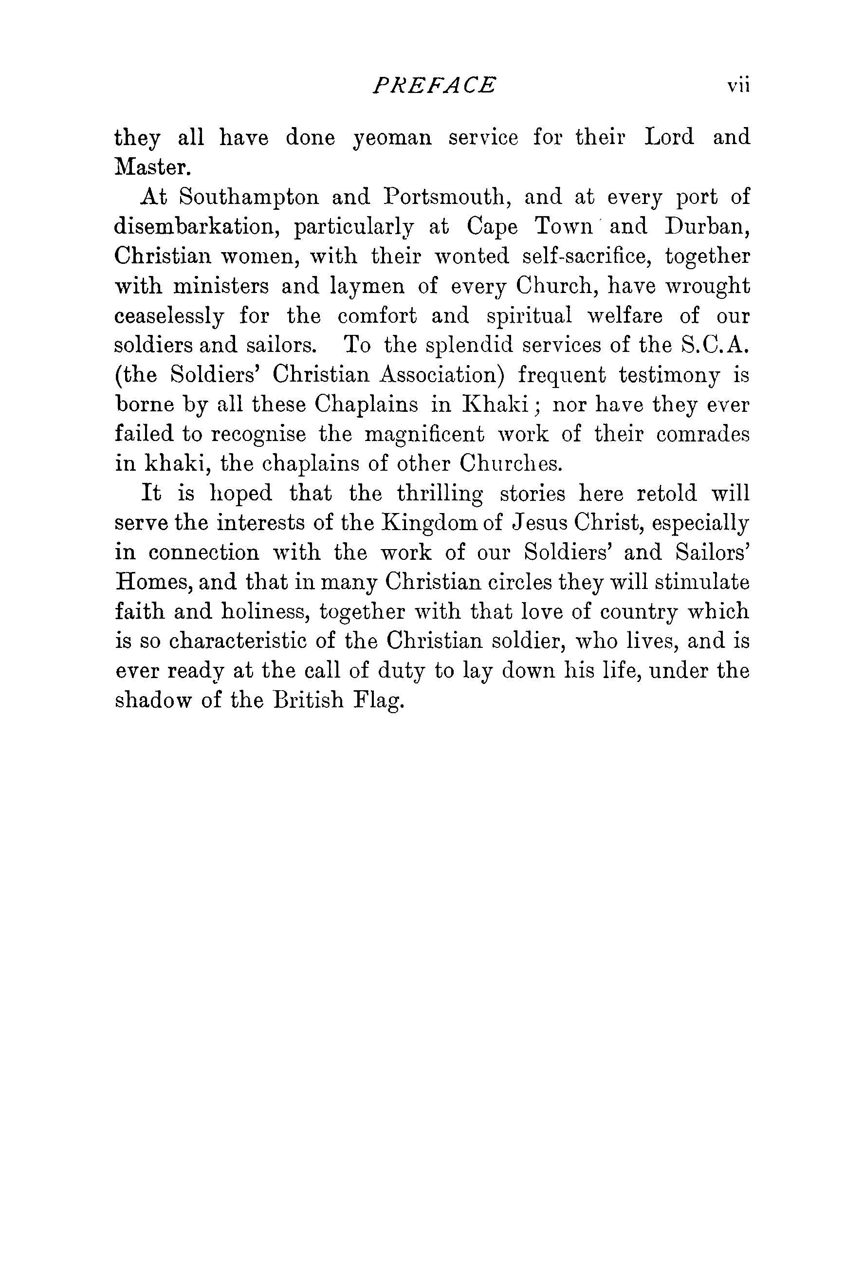 It is hoped that the thrilling stories here retold will serve the interests of the Kingdom of Jesus Christ, especially in connection with the work of our Soldiers' and Sailors' Homes, and that ill many Christian circles they will stimulate faith and holiness, together with that love of country which is so characteristic of the Christian soldier, who lives, and is ever ready at the call of duty to lay down his life, under the shadow of the British Flag.