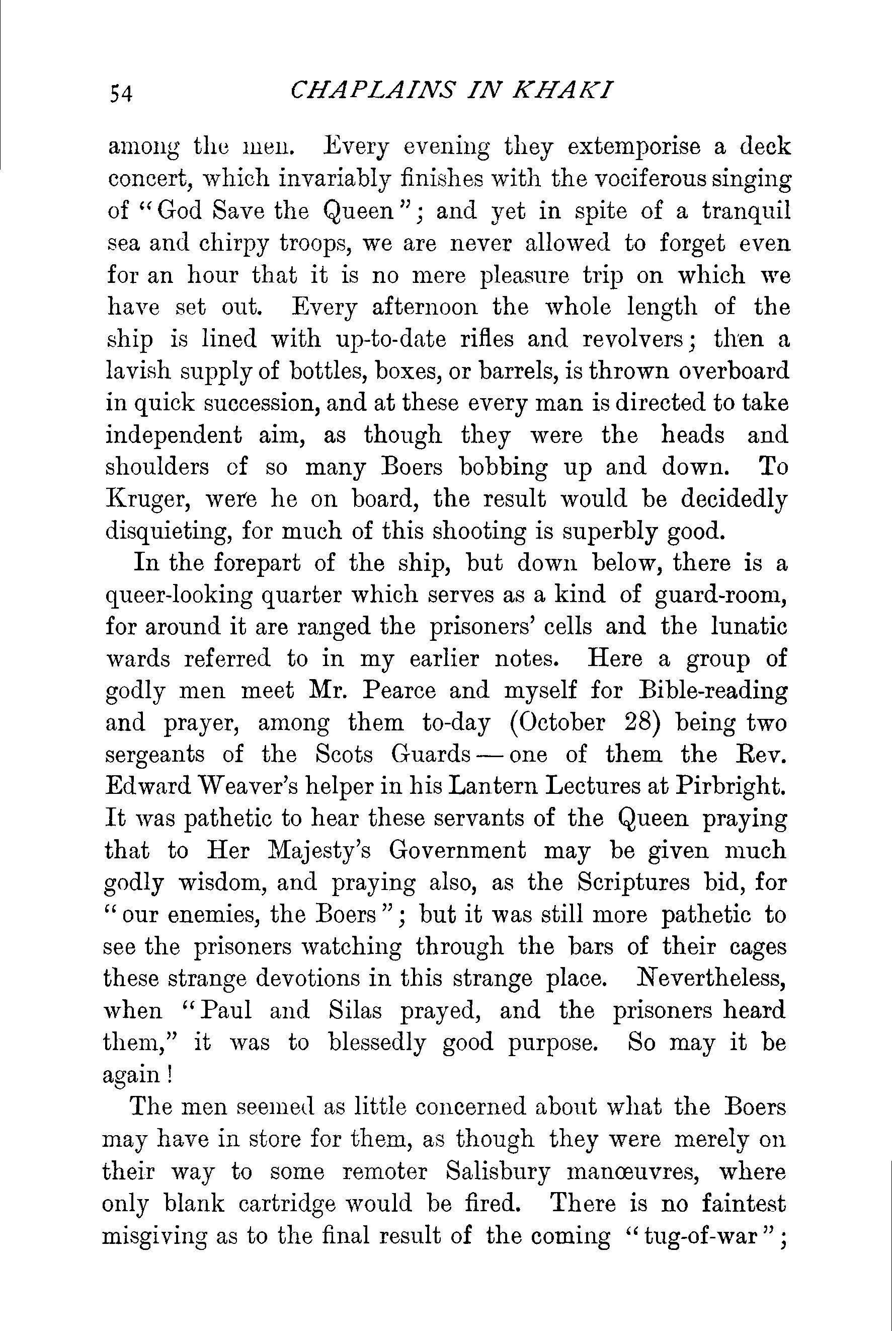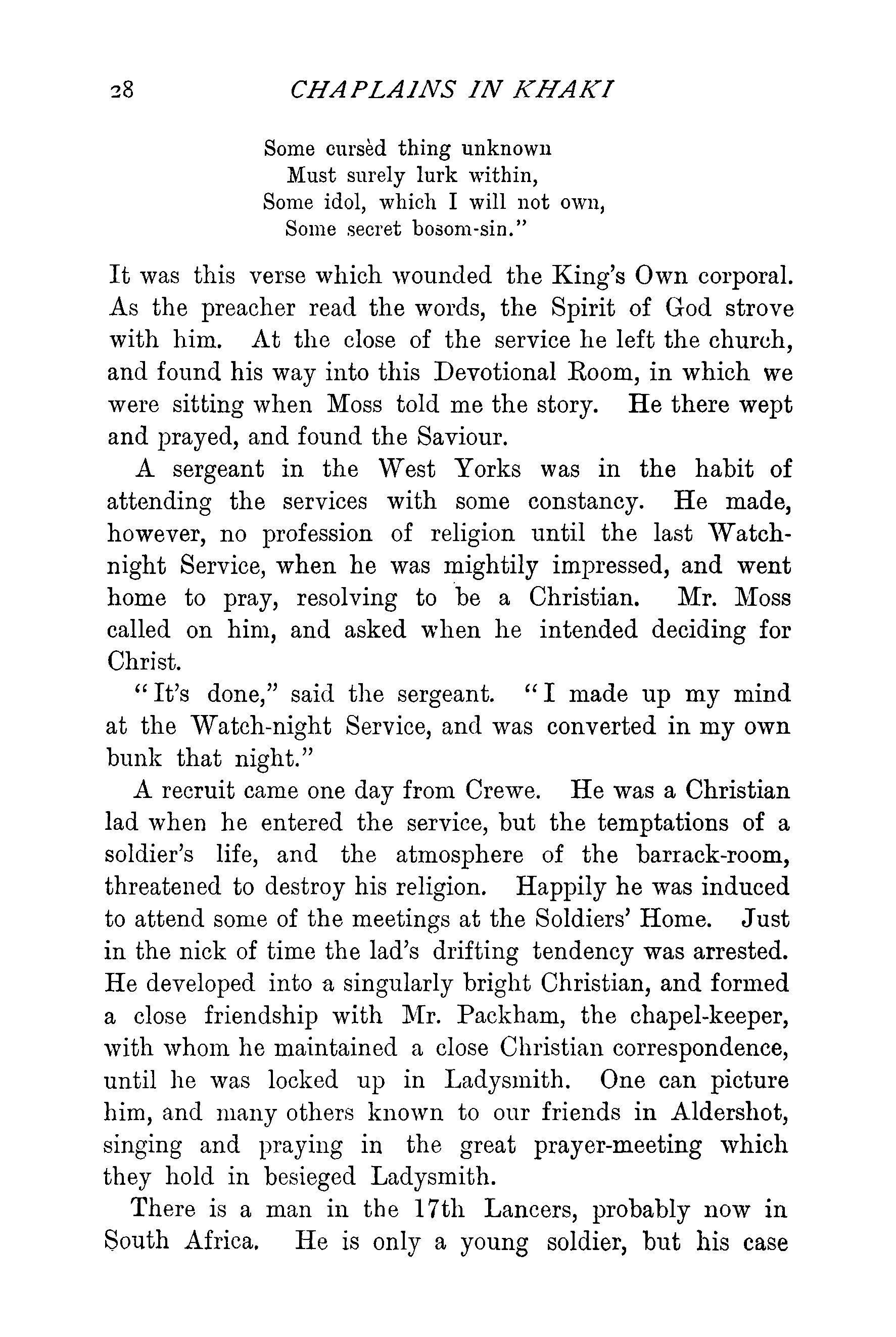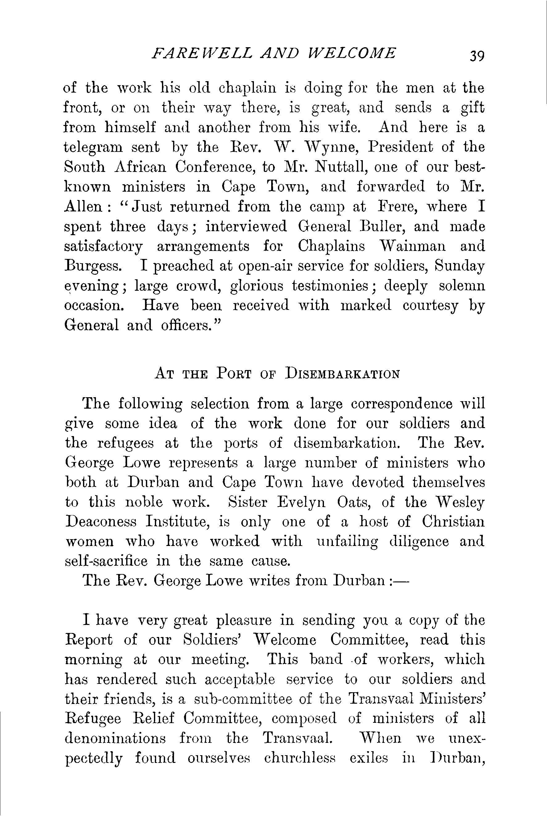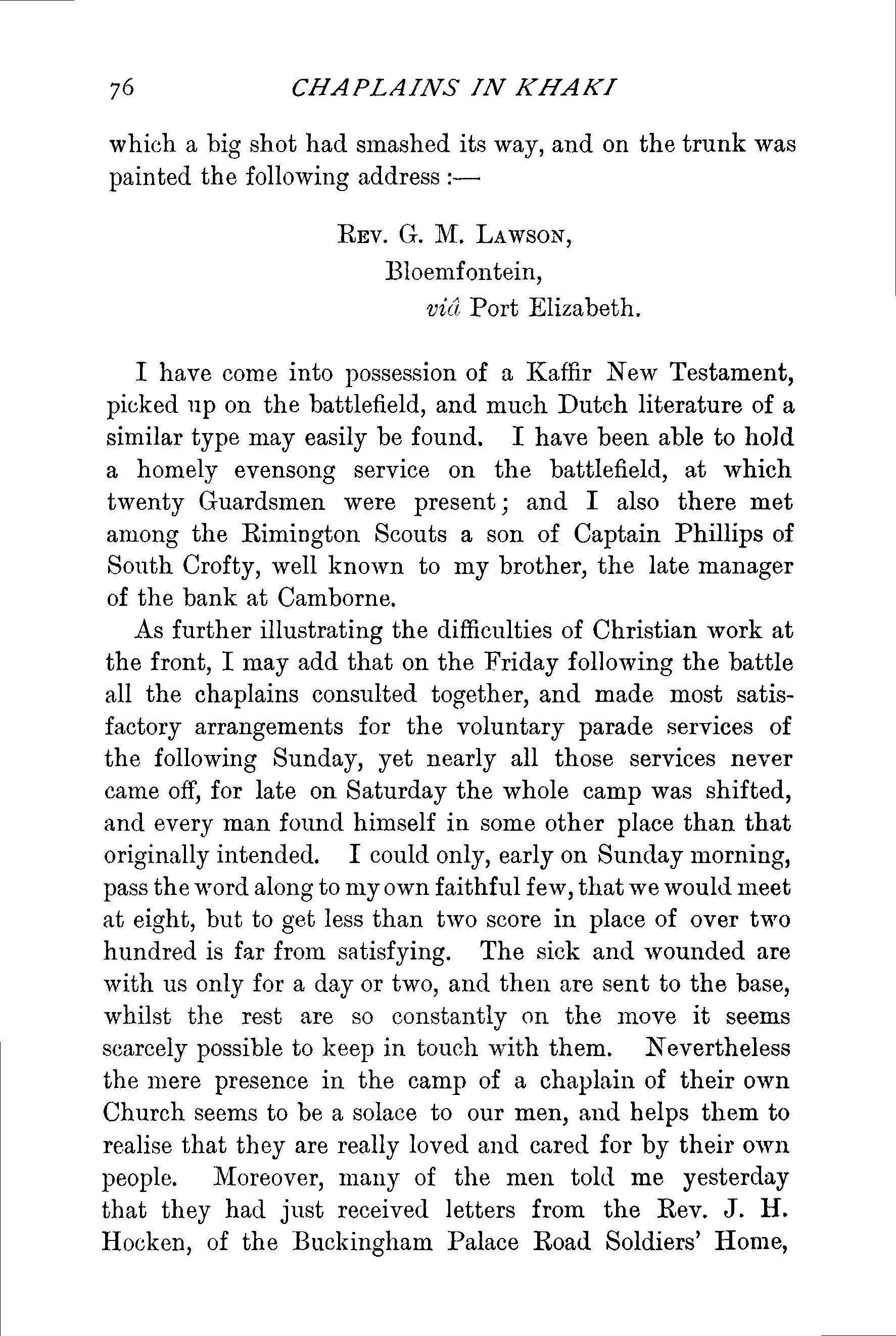 At Southampton and Portsmouth, and at every port of disembarkation, particularly at Cape Town and Durban, Christian women, with their wonted self-sacrifice, together with ministers and laymen of every Church, have wrought ceaselessly for the comfort and spiritual welfare of our soldiers and sailors. To the splendid services of the S.C.A. (the Soldiers' Christian Association) frequent testimony is borne by all these Chaplains in Khaki; nor have they ever failed to recognise the magnificent work of their comrades in khaki, the chaplains of other Churches.