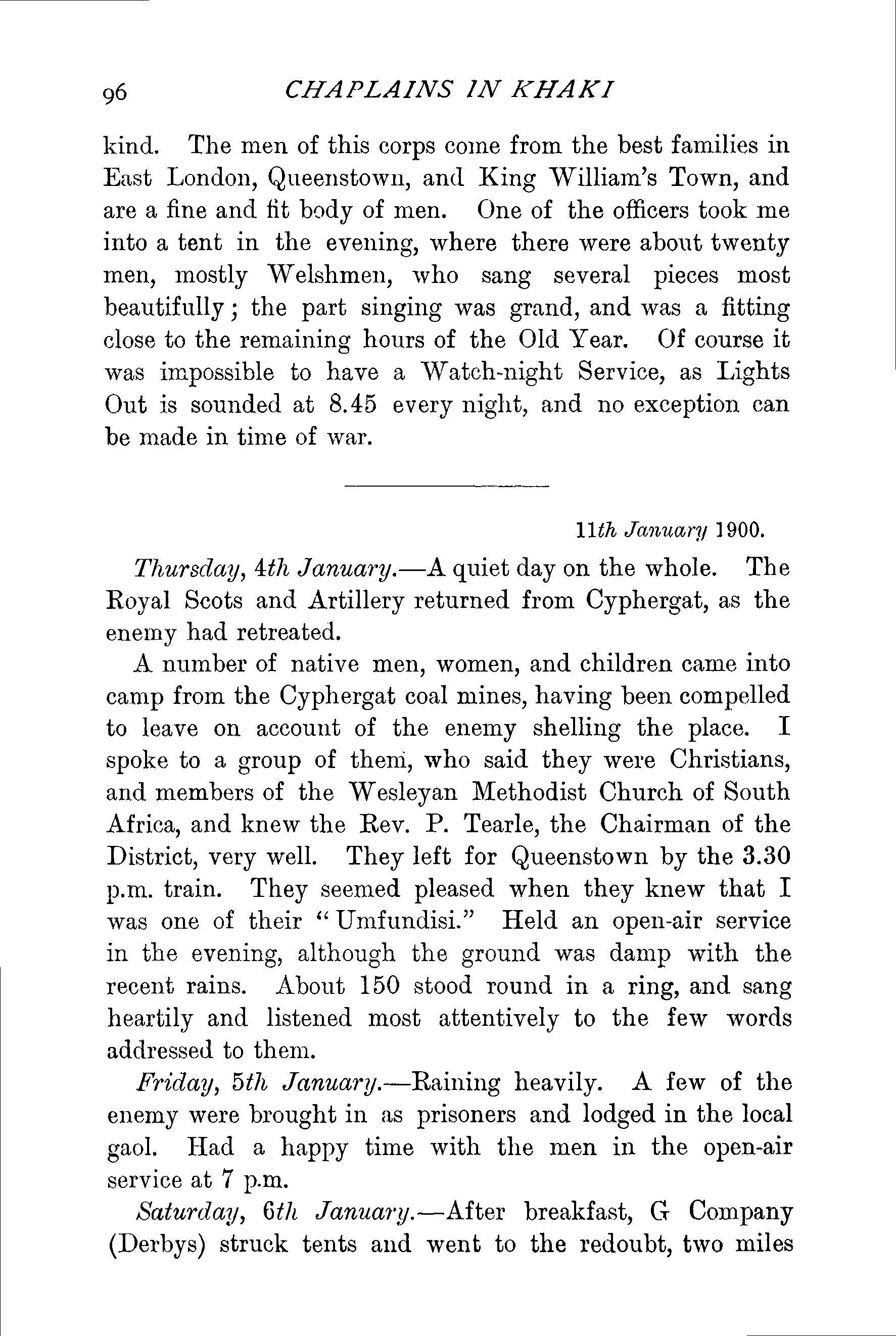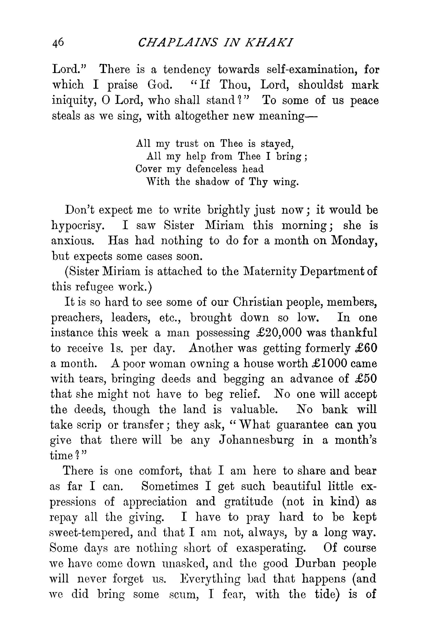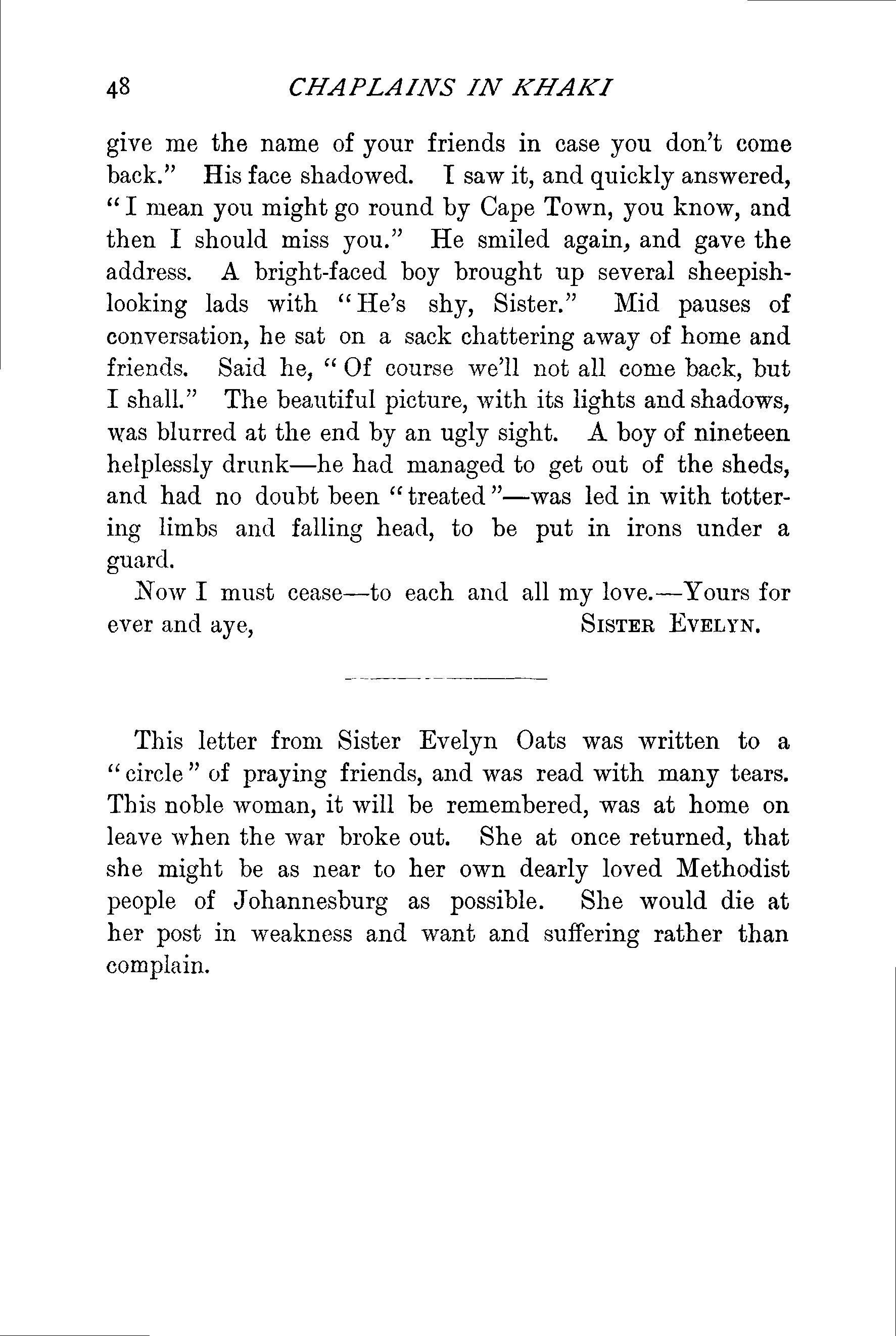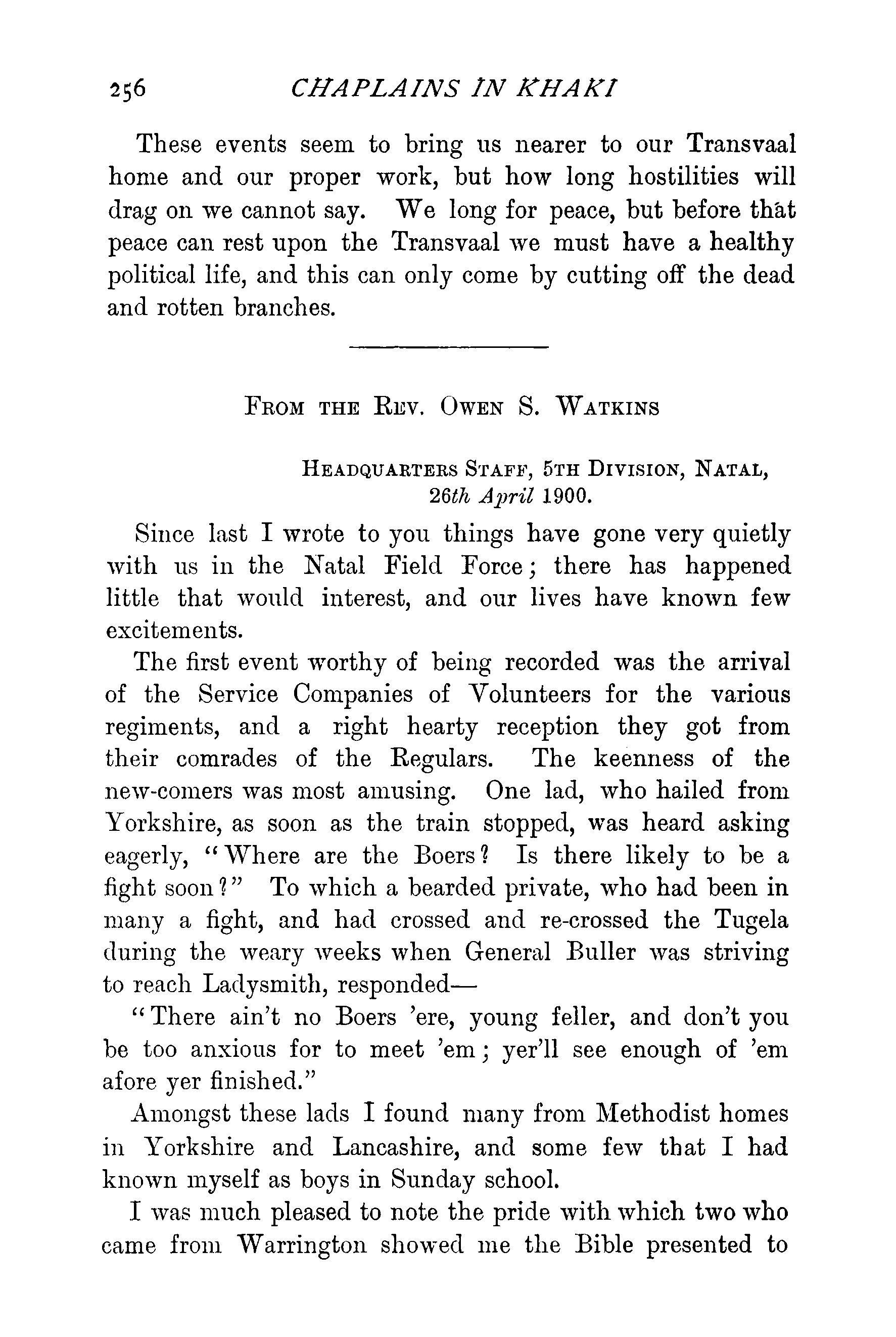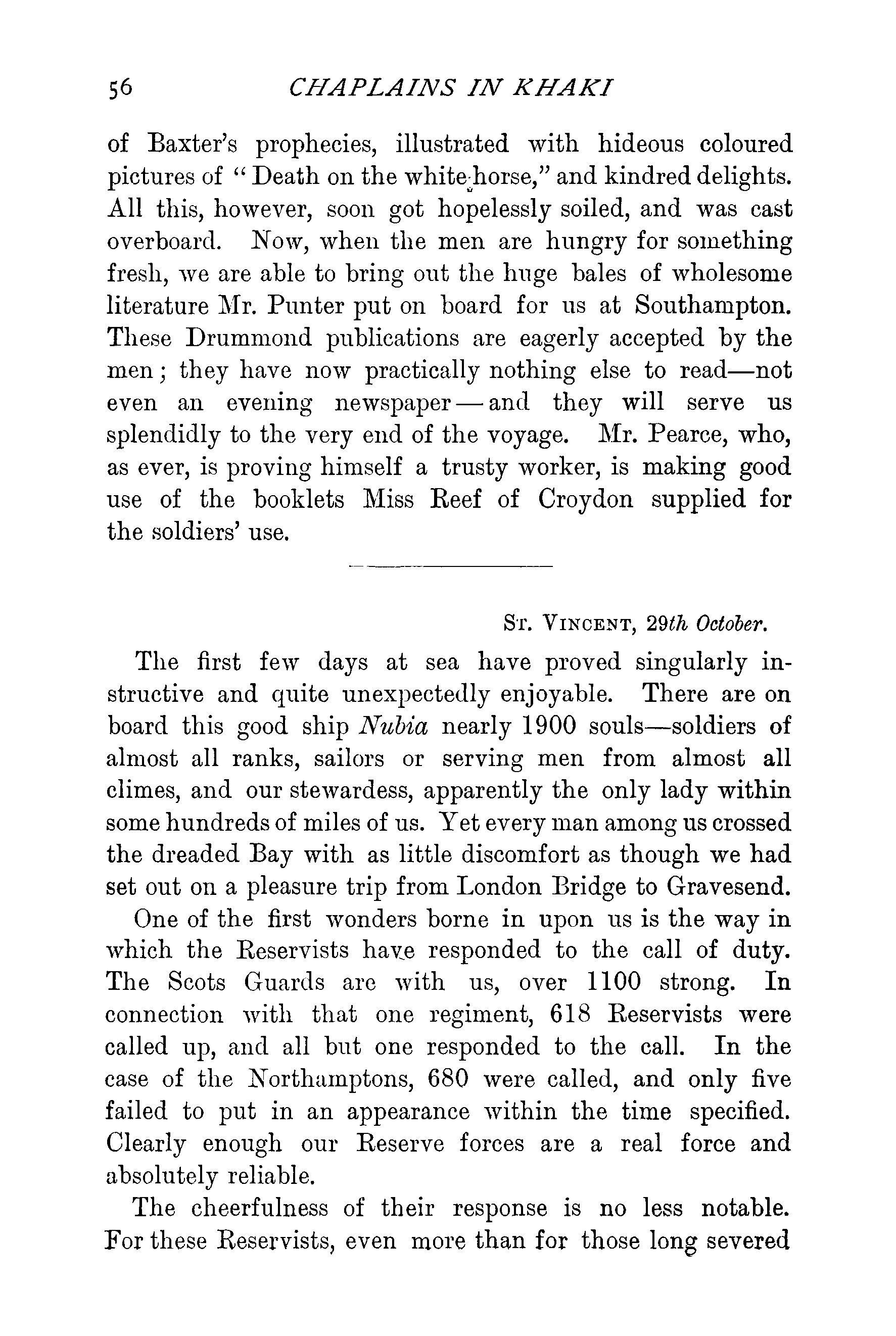 At Southampton and Portsmouth, and at every port of disembarkation, particularly at Cape Town and Durban, Christian women, with their wonted self-sacrifice, together with ministers and laymen of every Church, have wrought ceaselessly for the comfort and spiritual welfare of our soldiers and sailors. To the splendid services of the S.C.A. (the Soldiers' Christian Association) frequent testimony is borne by all these Chaplains in Khaki; nor have they ever failed to recognise the magnificent work of their comrades in khaki, the chaplains of other Churches.