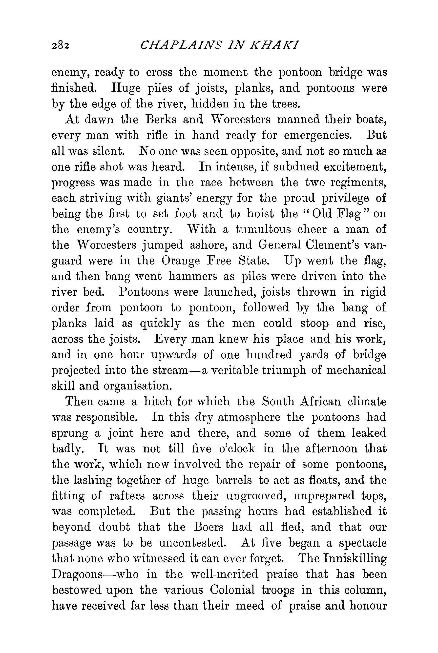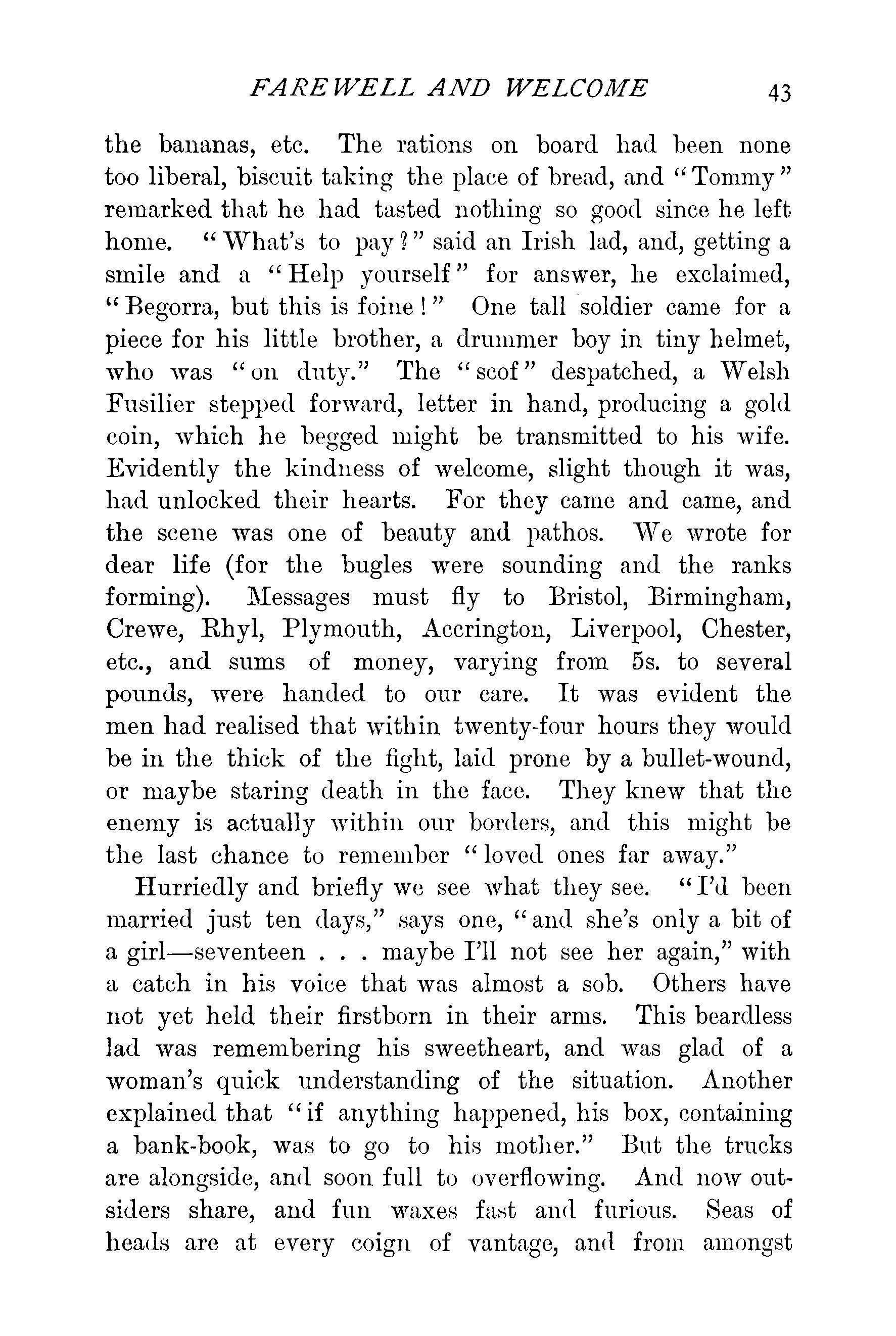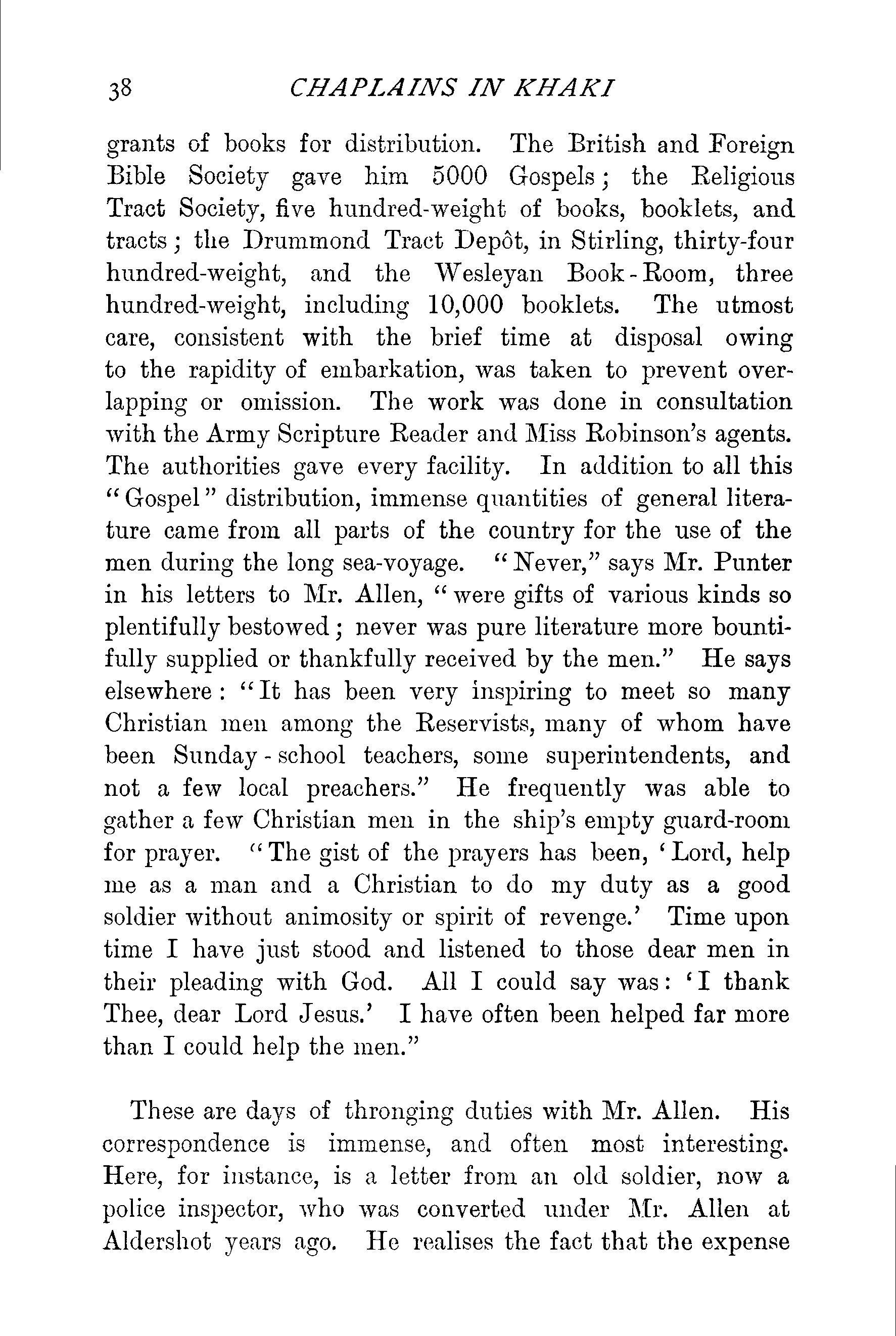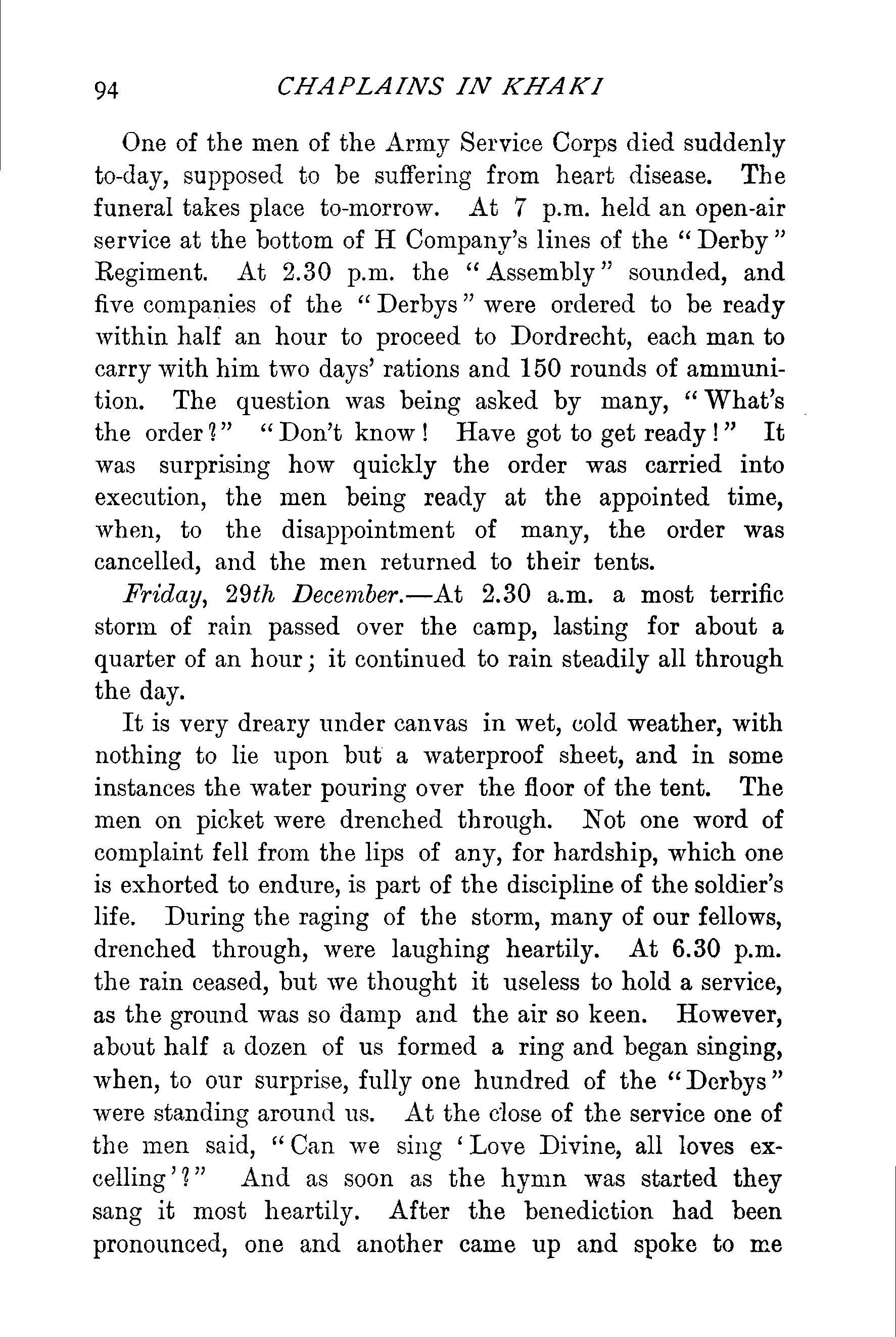 At Southampton and Portsmouth, and at every port of disembarkation, particularly at Cape Town and Durban, Christian women, with their wonted self-sacrifice, together with ministers and laymen of every Church, have wrought ceaselessly for the comfort and spiritual welfare of our soldiers and sailors. To the splendid services of the S.C.A. (the Soldiers' Christian Association) frequent testimony is borne by all these Chaplains in Khaki; nor have they ever failed to recognise the magnificent work of their comrades in khaki, the chaplains of other Churches.