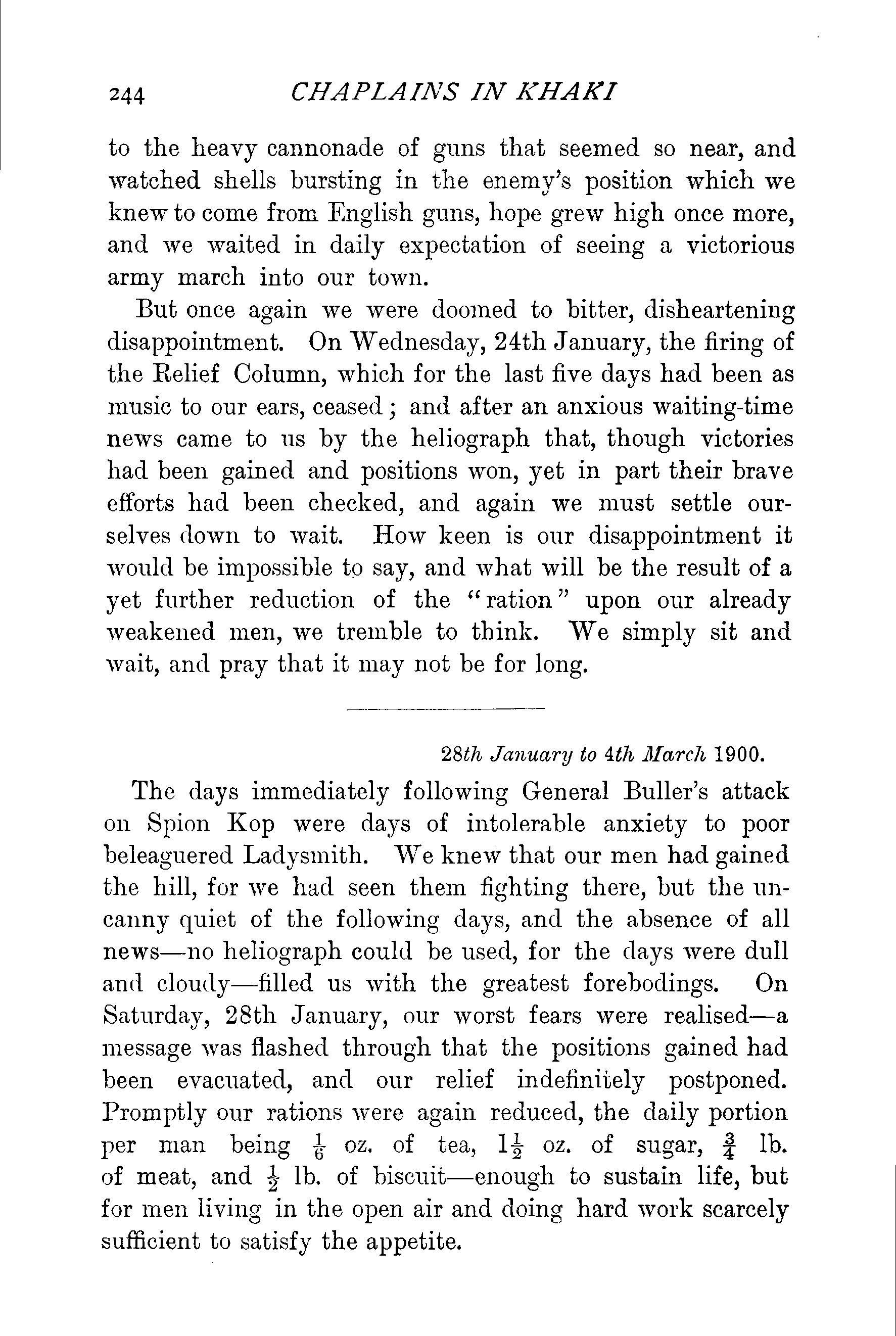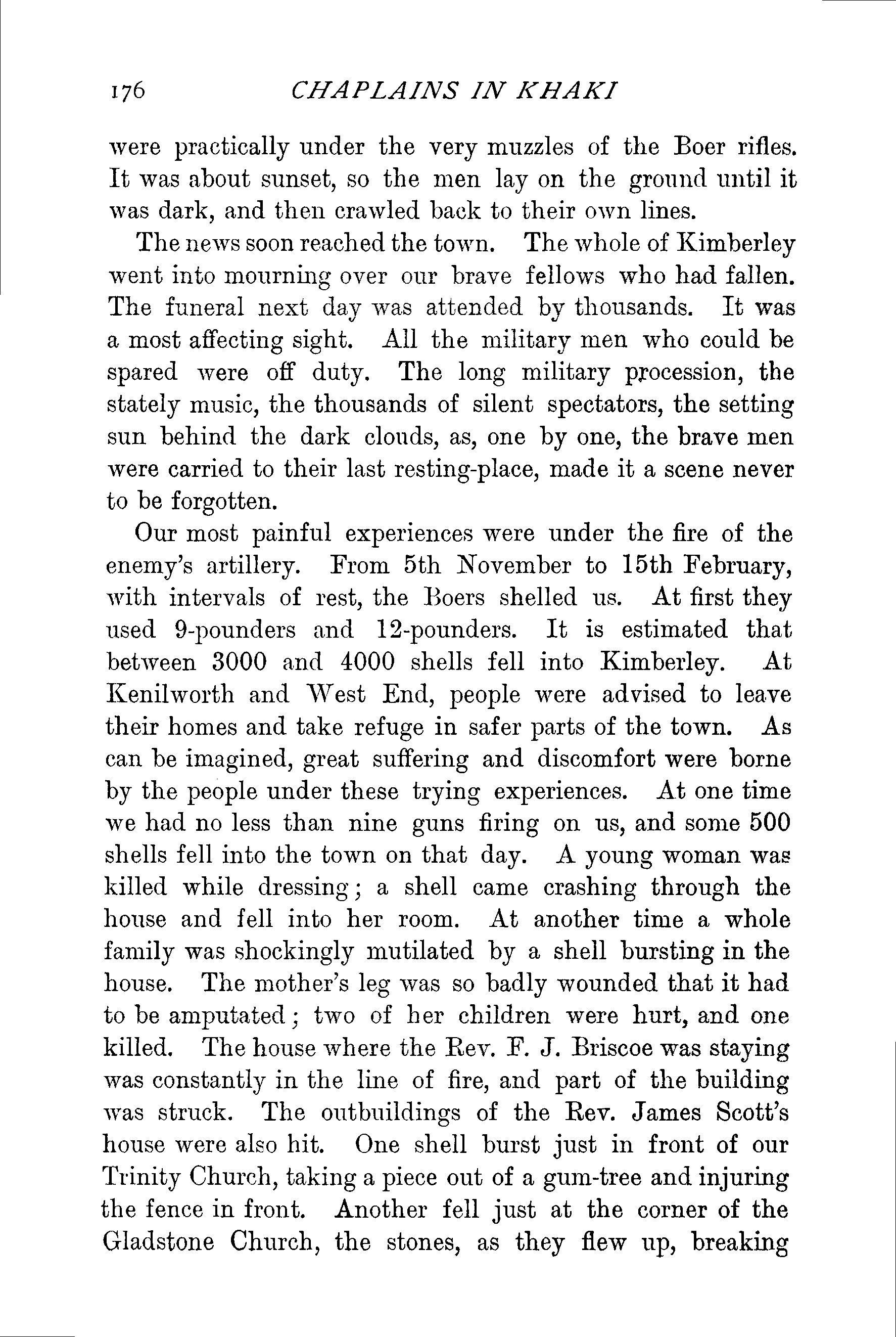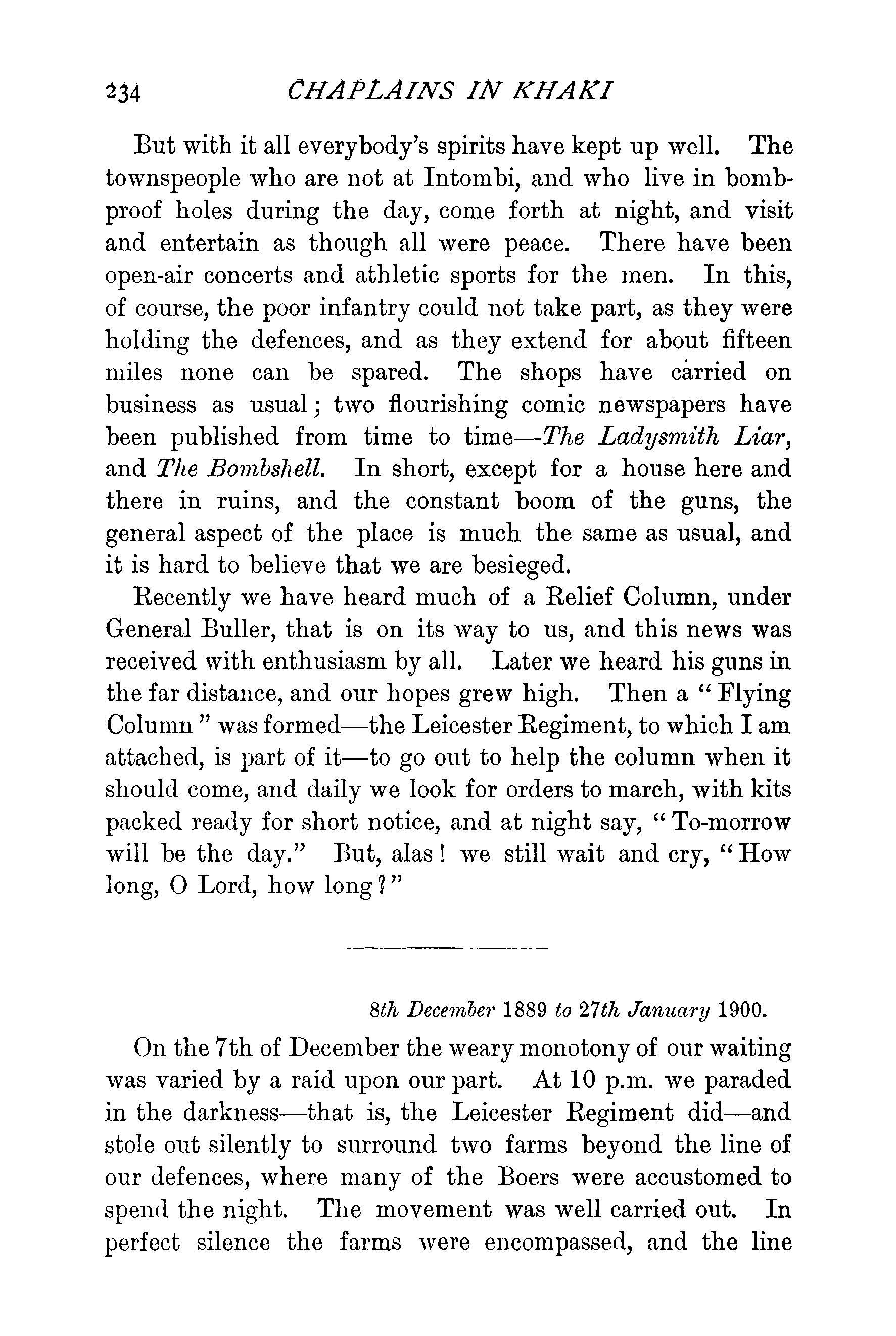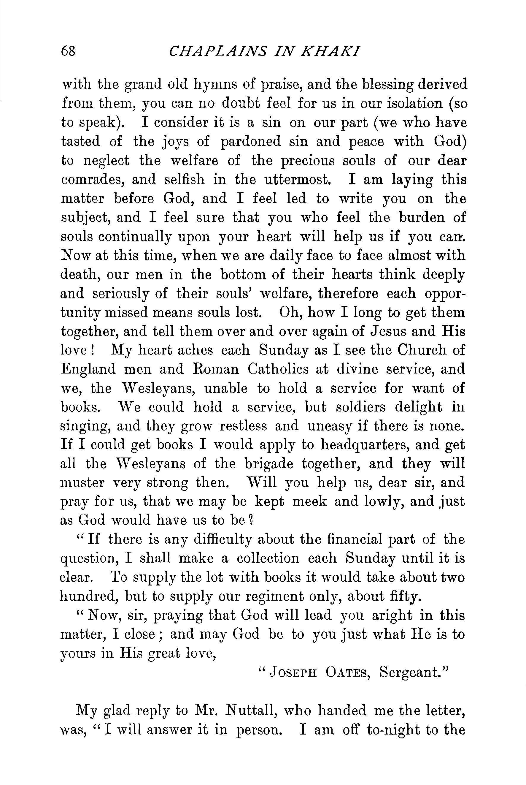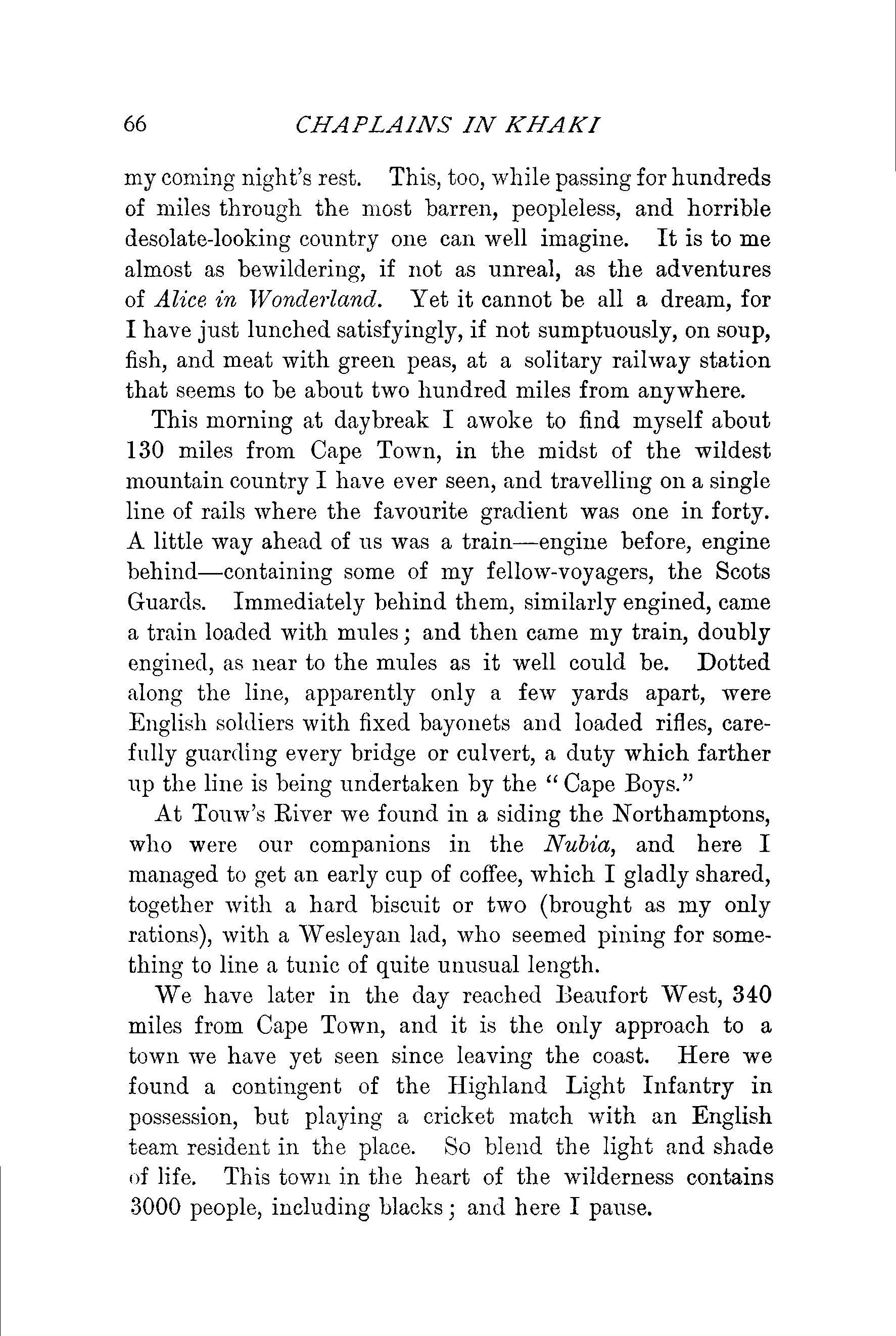 At Southampton and Portsmouth, and at every port of disembarkation, particularly at Cape Town and Durban, Christian women, with their wonted self-sacrifice, together with ministers and laymen of every Church, have wrought ceaselessly for the comfort and spiritual welfare of our soldiers and sailors. To the splendid services of the S.C.A. (the Soldiers' Christian Association) frequent testimony is borne by all these Chaplains in Khaki; nor have they ever failed to recognise the magnificent work of their comrades in khaki, the chaplains of other Churches.