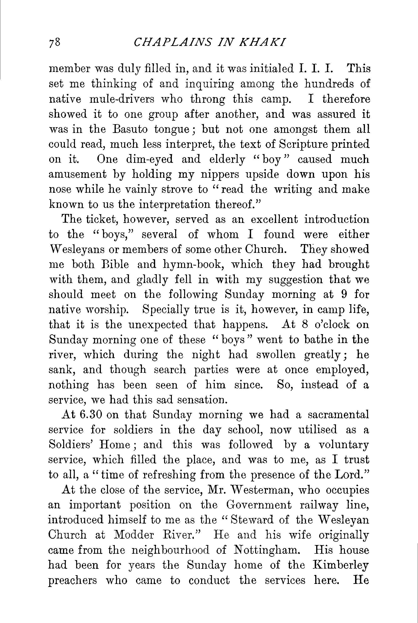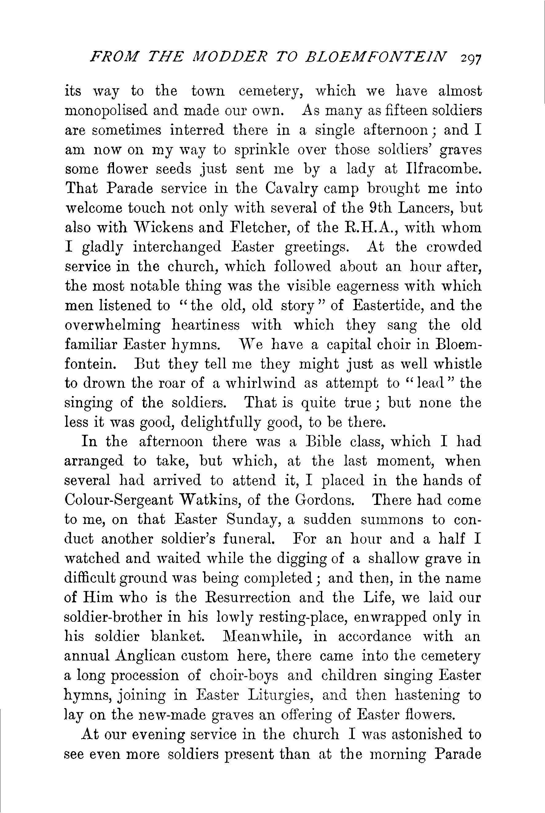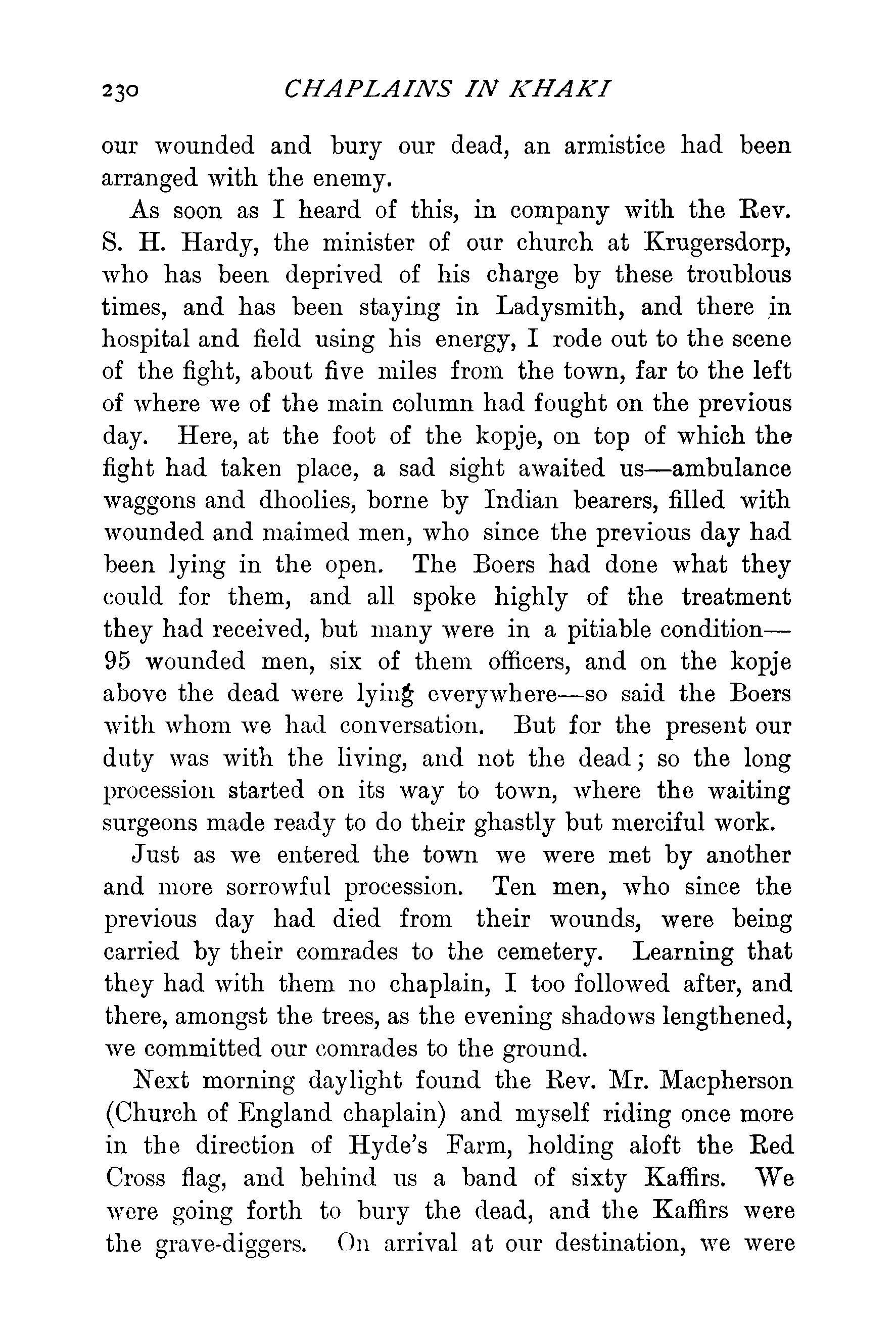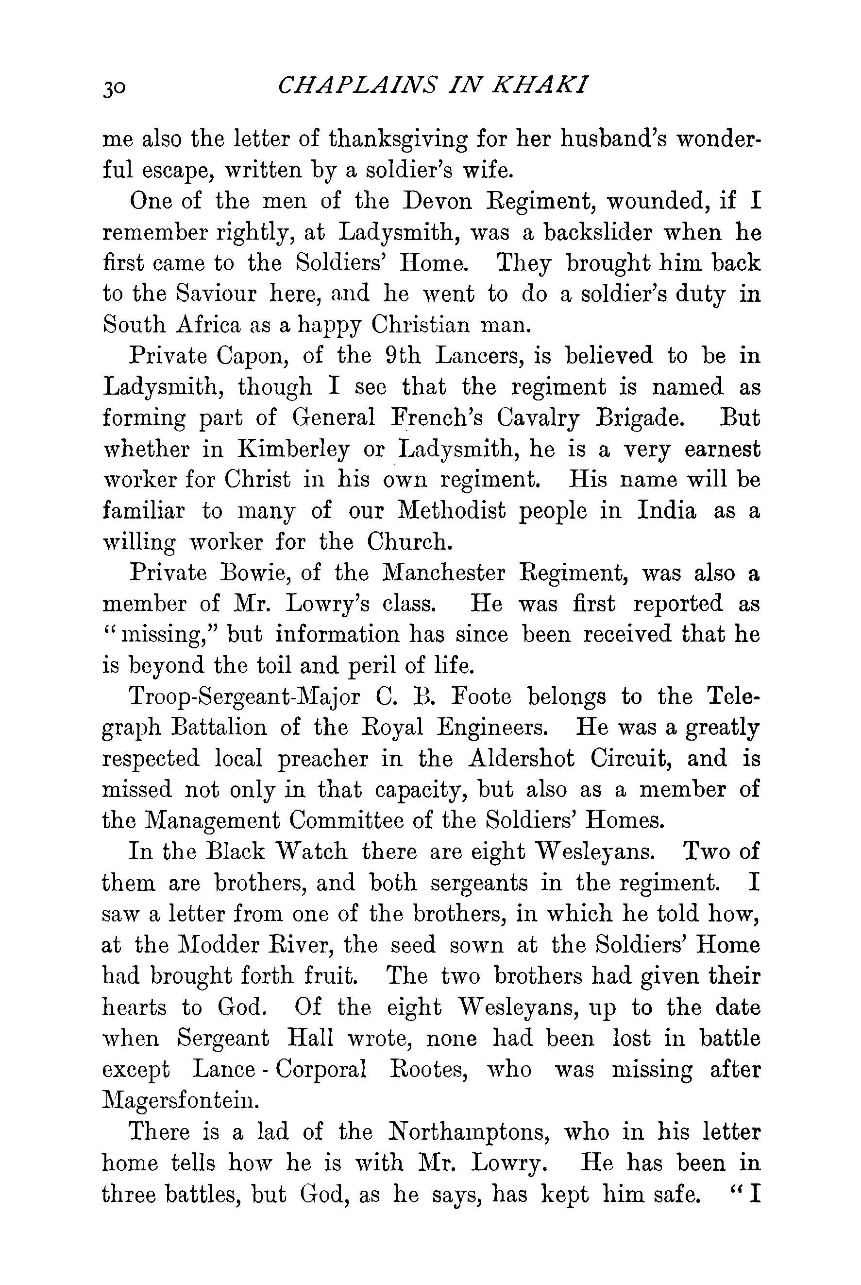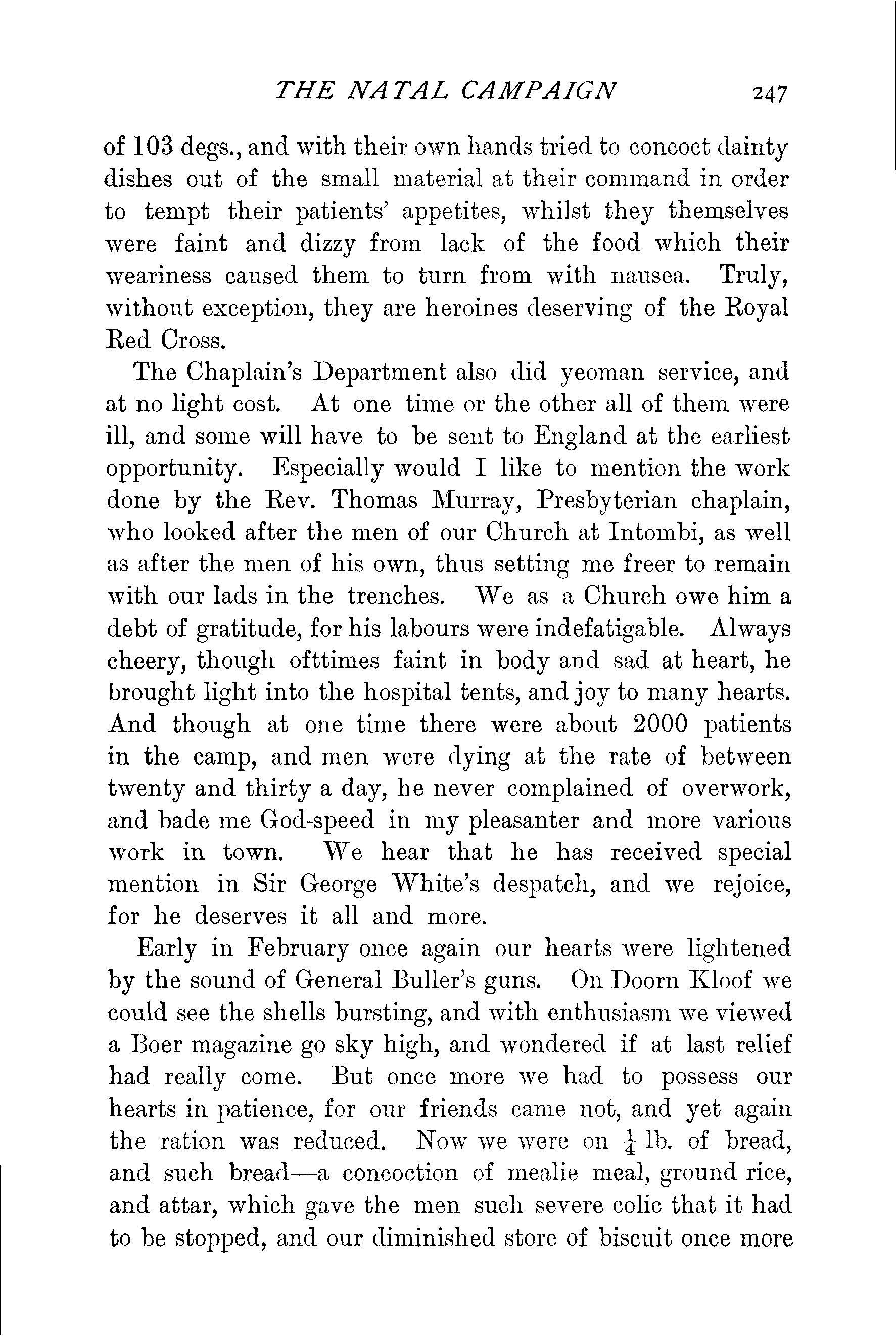 After the battle, he was, somehow, not discovered by our stretcher-bearers, and he layout all night with no one to give him even a drop of water. The next day the Boers could see him crawling about, but no one came near. Some time during the day, however, a Boer, passing on horseback, got off his horse and gave him drink, and then passed on, leaving the wounded man with his wound unattended to. On Wednesday he crawled to the river to drink, and in trying to do so fell in, but was caught by a branch of a tree, and he was thirty hours (!) getting out. On Friday Lord Roberts sent to the Boer commandant to exchange six wounded prisoners, and it was only then that the Boers picked him up, took him to their laager, roughly bound his wound, and sent him to the British camp. He was afterwards sent to \Vynberg in a very critical state, and on Saturday, 24th March, he passed away. It seemed a double miracle that he should be alive to reach our camp. During those five days he had no food, and no attention whatever. I saw him the Sunday after his arrival; he was cheerful and full of hope of recovery. I saw him again on Monday, when he seemed to have improved. On Friday, however, after an operation of cleansing the wound in his thigh, he was very weak, but still hopeful. But on Saturday he suddenly collapsed, and soon went home to God. I cannot say much concerning his spiritual state, but I have no doubt about his safety. He was most patient and calm, and assented to all I had to say to him of Goel's love and goodness. I had given him one of those flannel nightshirts our good people at home sent me through you, and he seemed so pleased to get it. Poor fellow! He did not need it. But a comrade in the same tent did so many little acts of kindness for him, that I gave the shirt to him as a memento. W e laid him to rest in our cemetery on Monday, 26th March, with full military honours. Last week I was much touched at seeing one of our