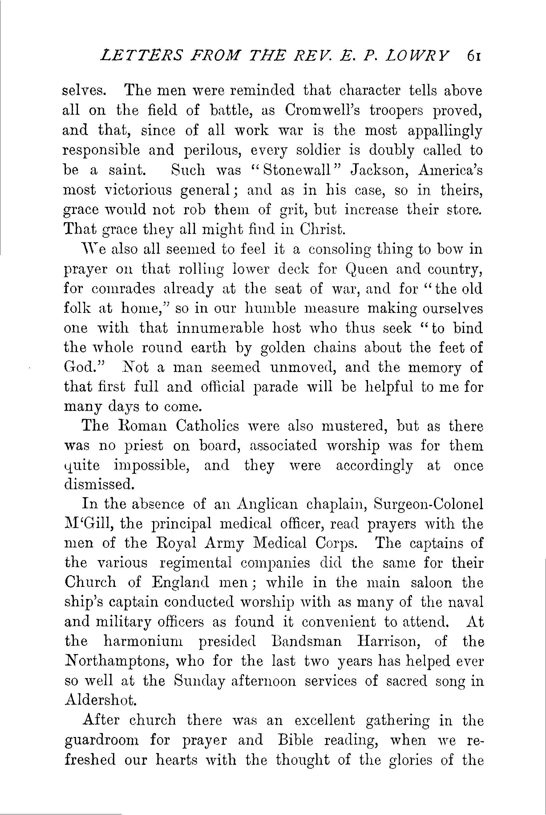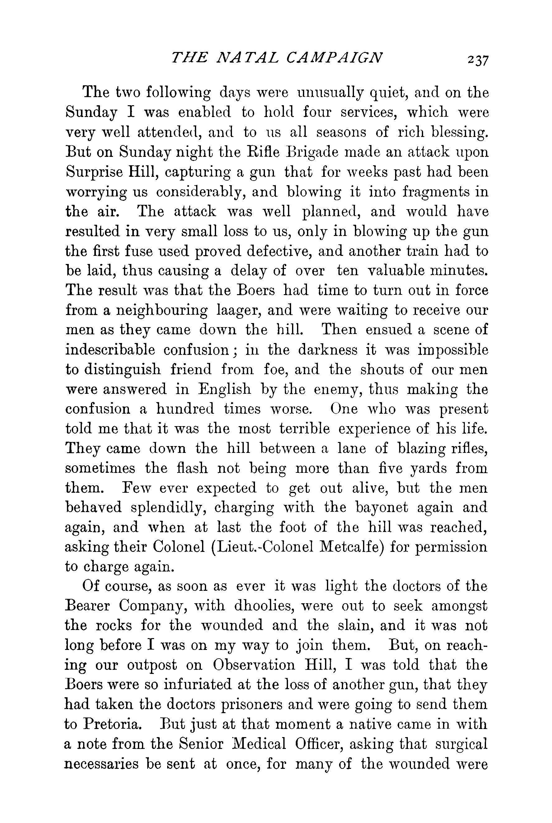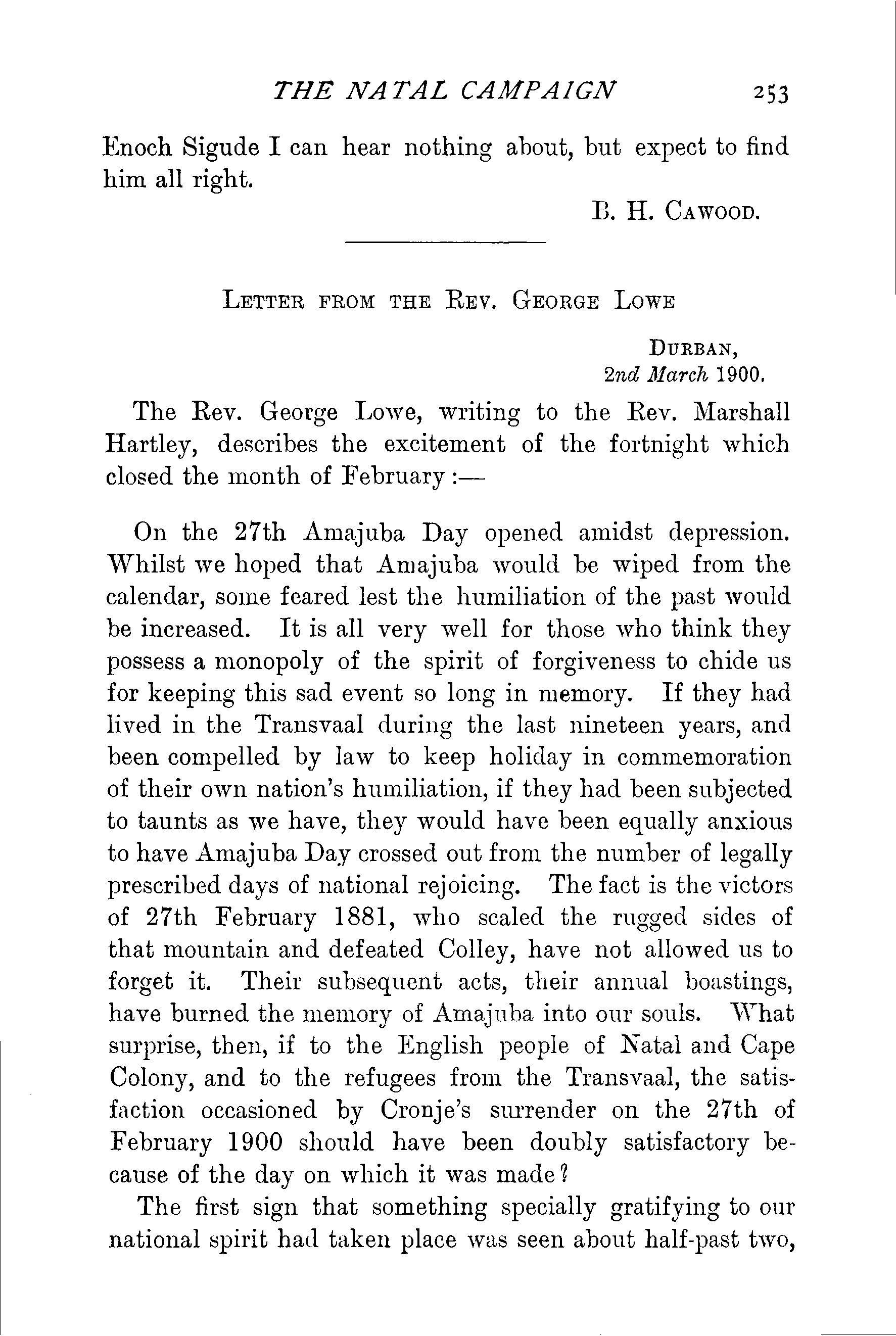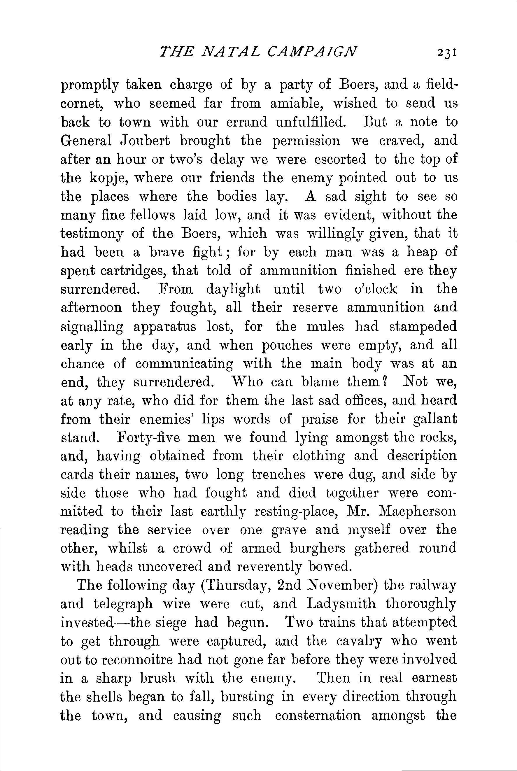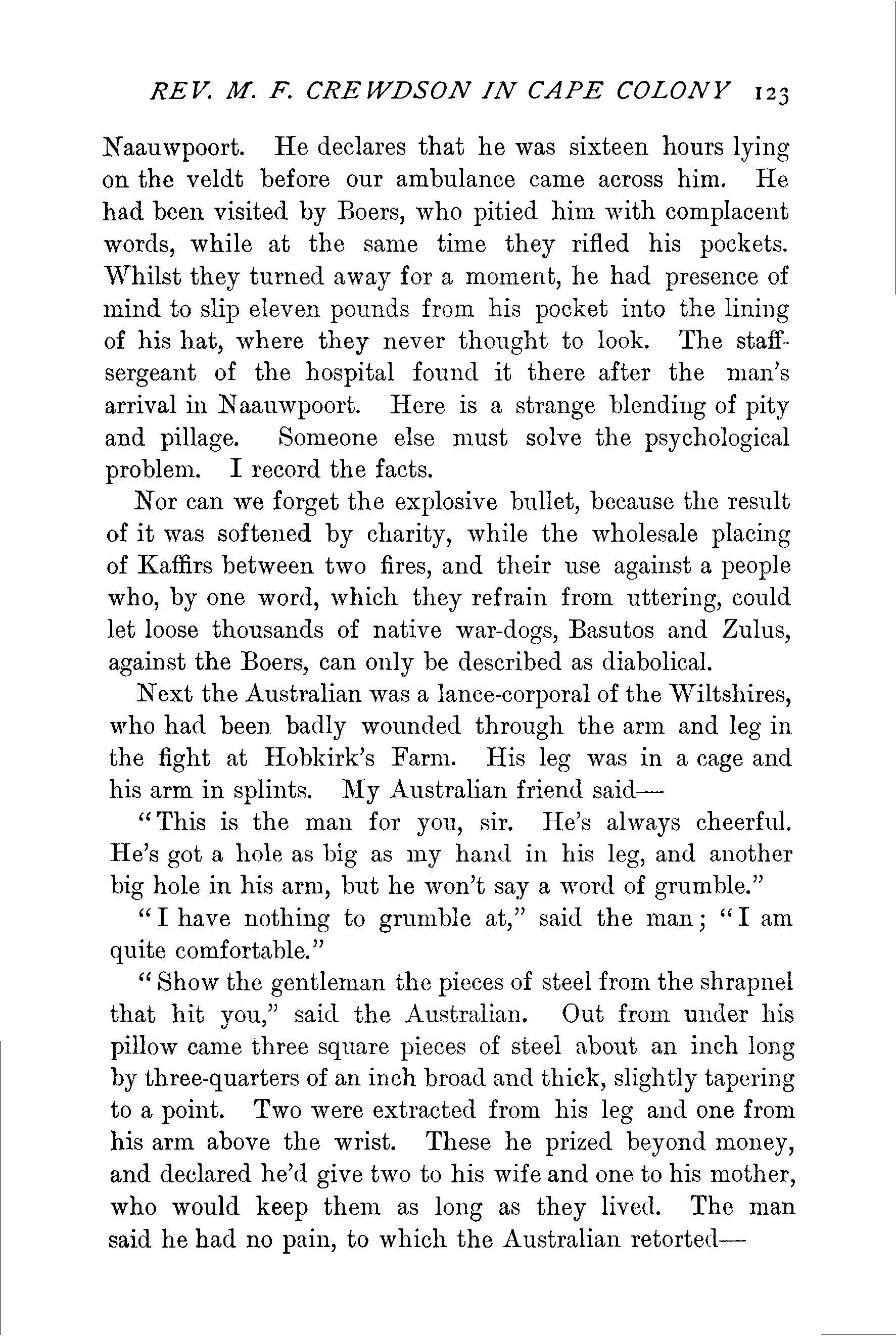 After the battle, he was, somehow, not discovered by our stretcher-bearers, and he layout all night with no one to give him even a drop of water. The next day the Boers could see him crawling about, but no one came near. Some time during the day, however, a Boer, passing on horseback, got off his horse and gave him drink, and then passed on, leaving the wounded man with his wound unattended to. On Wednesday he crawled to the river to drink, and in trying to do so fell in, but was caught by a branch of a tree, and he was thirty hours (!) getting out. On Friday Lord Roberts sent to the Boer commandant to exchange six wounded prisoners, and it was only then that the Boers picked him up, took him to their laager, roughly bound his wound, and sent him to the British camp. He was afterwards sent to \Vynberg in a very critical state, and on Saturday, 24th March, he passed away. It seemed a double miracle that he should be alive to reach our camp. During those five days he had no food, and no attention whatever. I saw him the Sunday after his arrival; he was cheerful and full of hope of recovery. I saw him again on Monday, when he seemed to have improved. On Friday, however, after an operation of cleansing the wound in his thigh, he was very weak, but still hopeful. But on Saturday he suddenly collapsed, and soon went home to God. I cannot say much concerning his spiritual state, but I have no doubt about his safety. He was most patient and calm, and assented to all I had to say to him of Goel's love and goodness. I had given him one of those flannel nightshirts our good people at home sent me through you, and he seemed so pleased to get it. Poor fellow! He did not need it. But a comrade in the same tent did so many little acts of kindness for him, that I gave the shirt to him as a memento. W e laid him to rest in our cemetery on Monday, 26th March, with full military honours. Last week I was much touched at seeing one of our