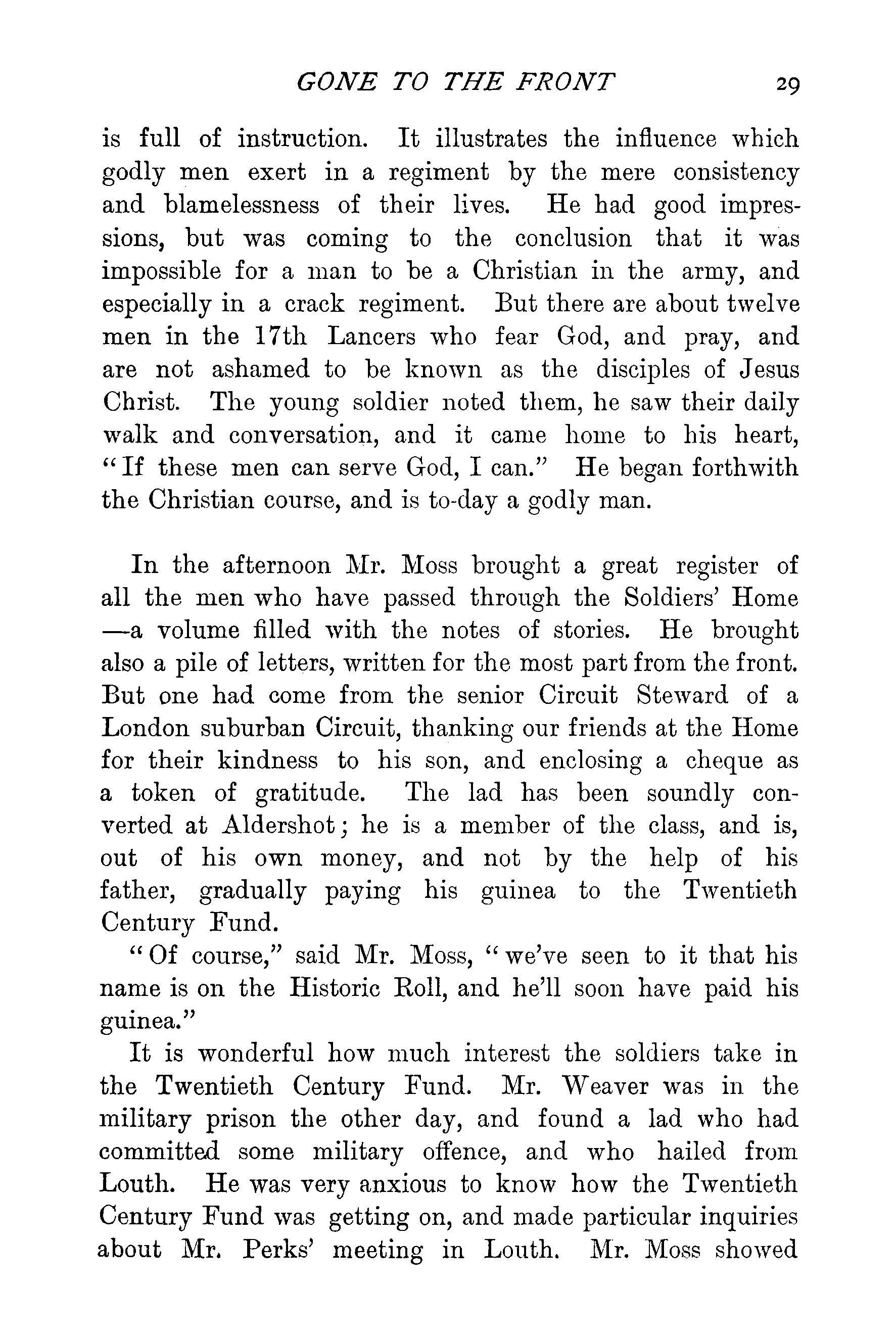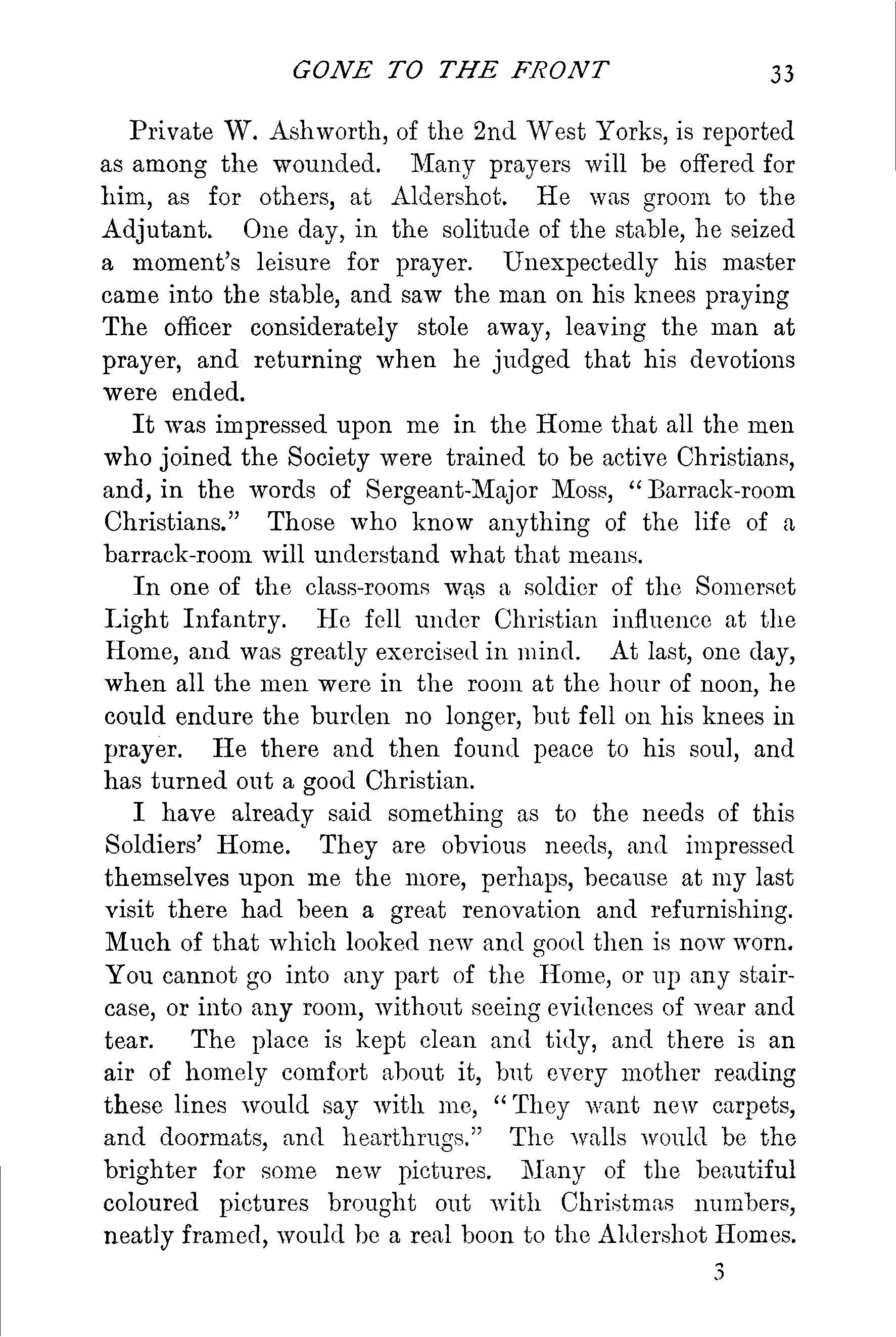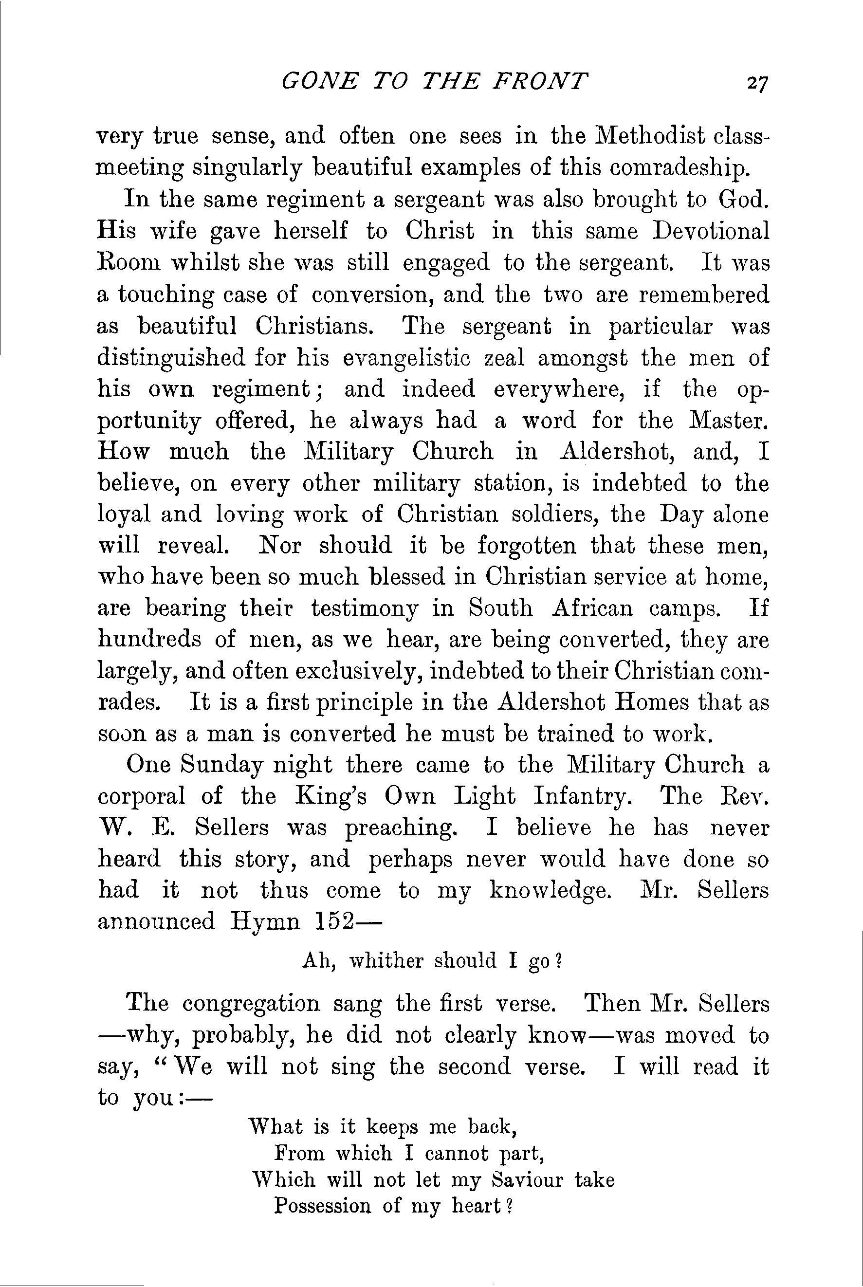 IFever Methodism had cause to be thankful for the work it has been led to do during recent years for the Soldiers of the Queen, it is now. Its Homes at Aldershot, Pirbright, Chatham, Portsmouth, Shorncliffe, Woolwich, and elsewhere have been centres of blessing to thousands of men now in South Africa, or on the way there, and centres of comfort and help to wives and children and mothers. It is not merely that the sons of Methodist parents, brought up in our Sunday schools and dear to us by kinship, are cared for, but many who belong to other Churches come, and are made welcome, and are never made to feel that they must desert the Church of their fathers in order to share the social and religious privileges enjoyed by "Wesleyans." There are two or three men whose characters are sketched here who are Methodists in precisely the same sense in which my ancestors in the last century were Methodists. They are "members of Society" among the people called Methodists,