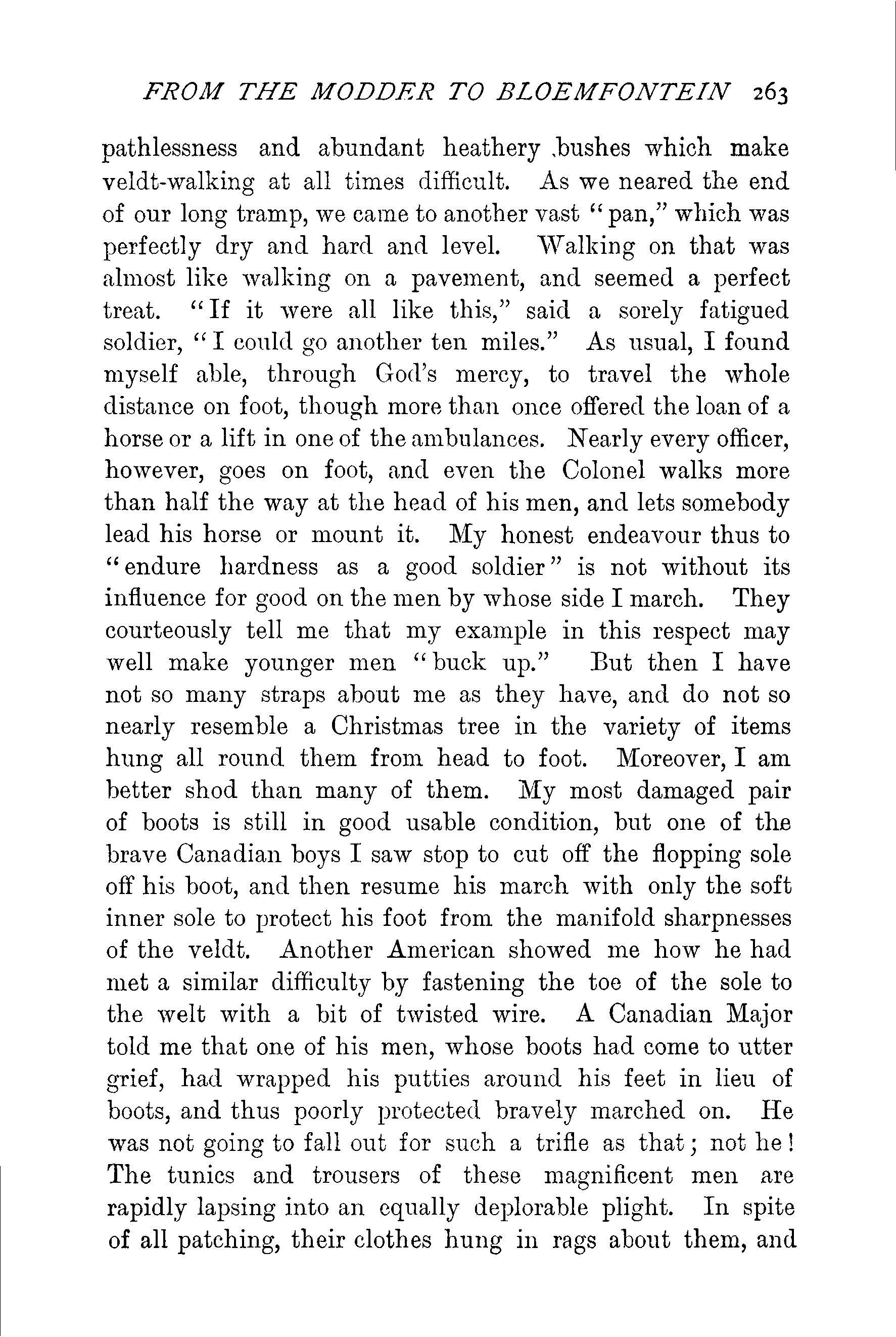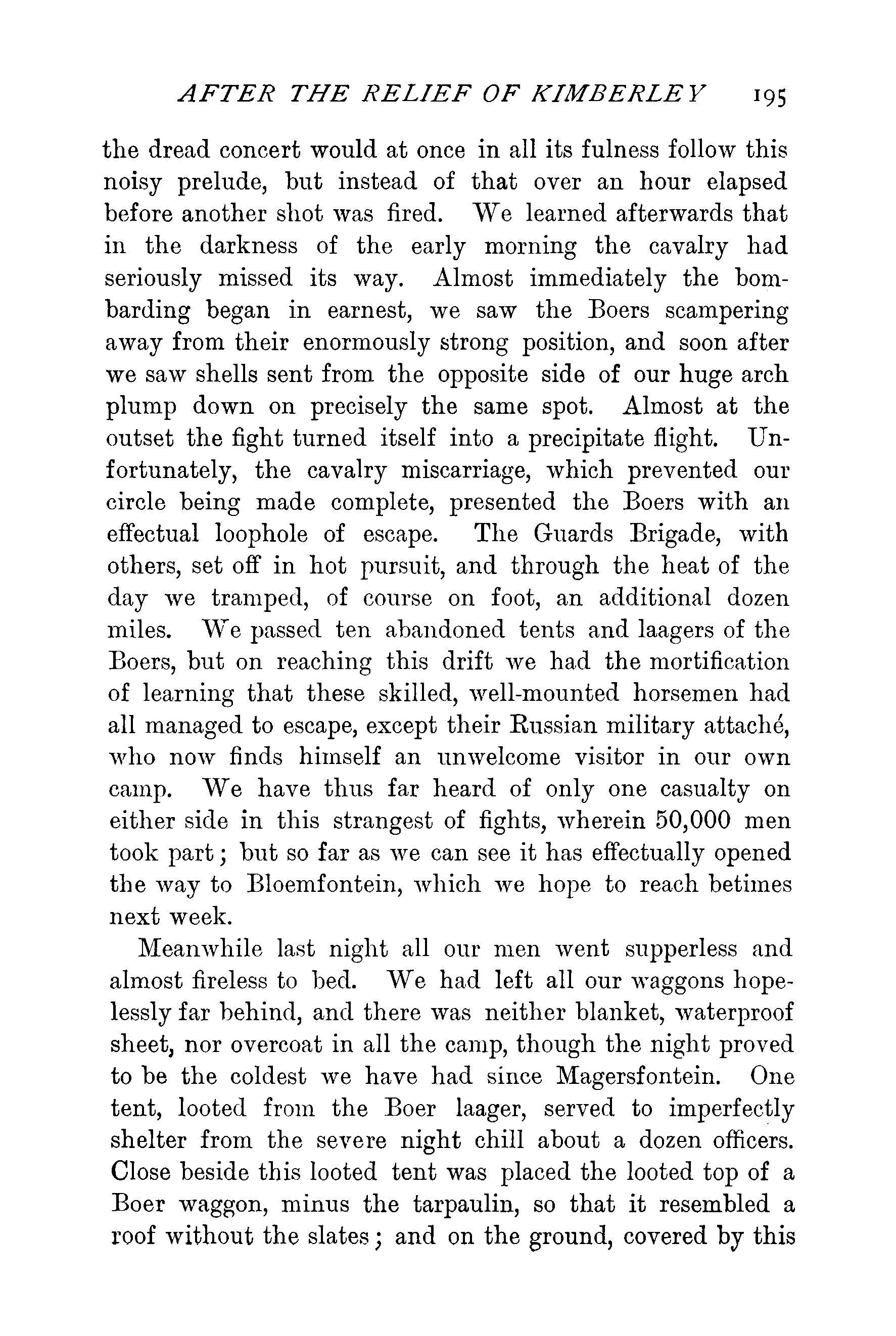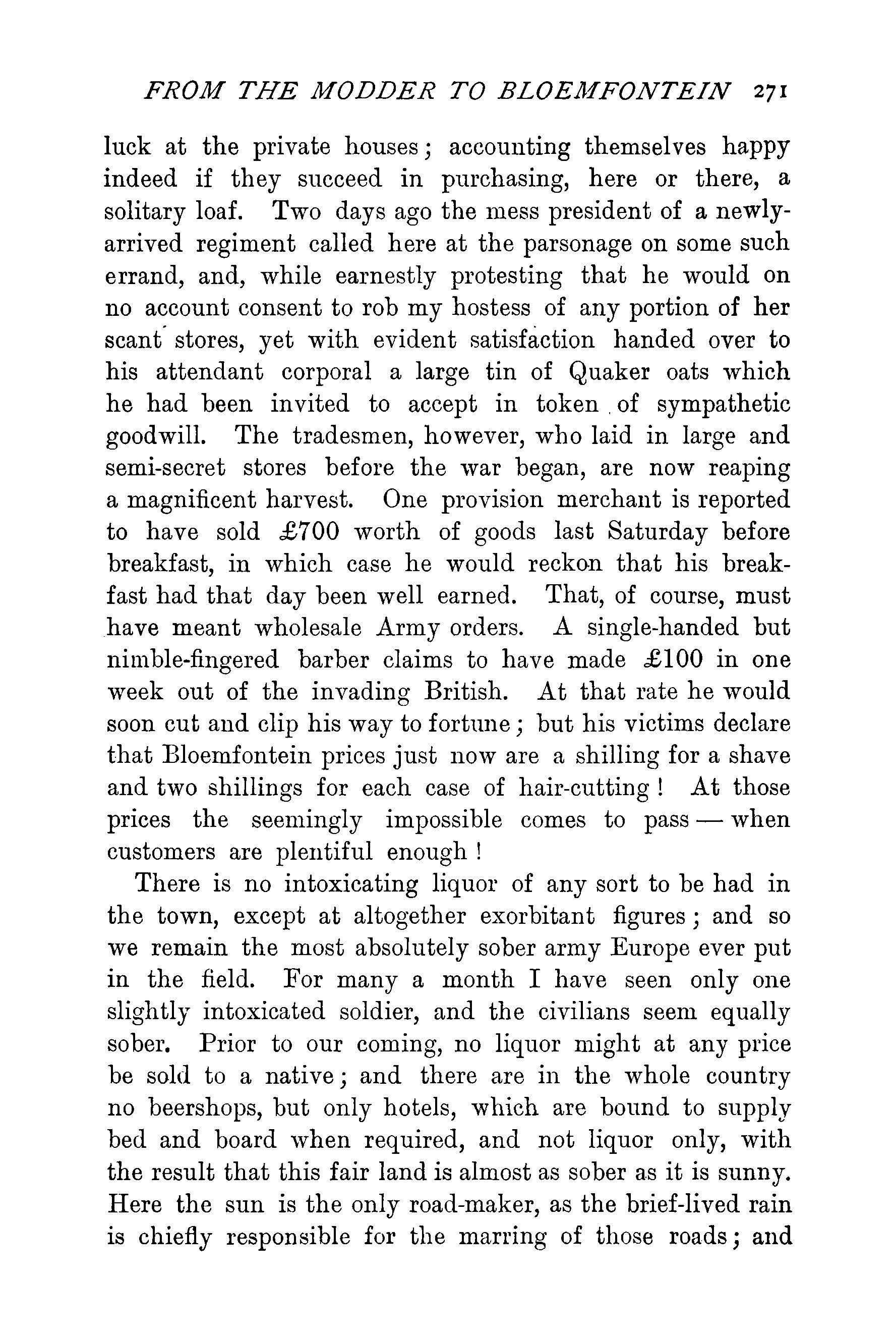 By this time our people at home have been disillusioned concerning the Boer characteristics. It was a marvel to us when leading men in England denounced in passionate tones our intrusion upon the patriarchal quietude of the Boer peasantry, whom they likened to the freedom-loving Puritans who emigrated to New England. Latterly you have heard enough of their dirty ha hits, which make their camps reek with tilth, of their treacherous use of the flag of truce and of that of the Red Cross, and of the outrageous lies which are circulated throughout their commandoes with a view to sustain the courage of the mixed multitude.