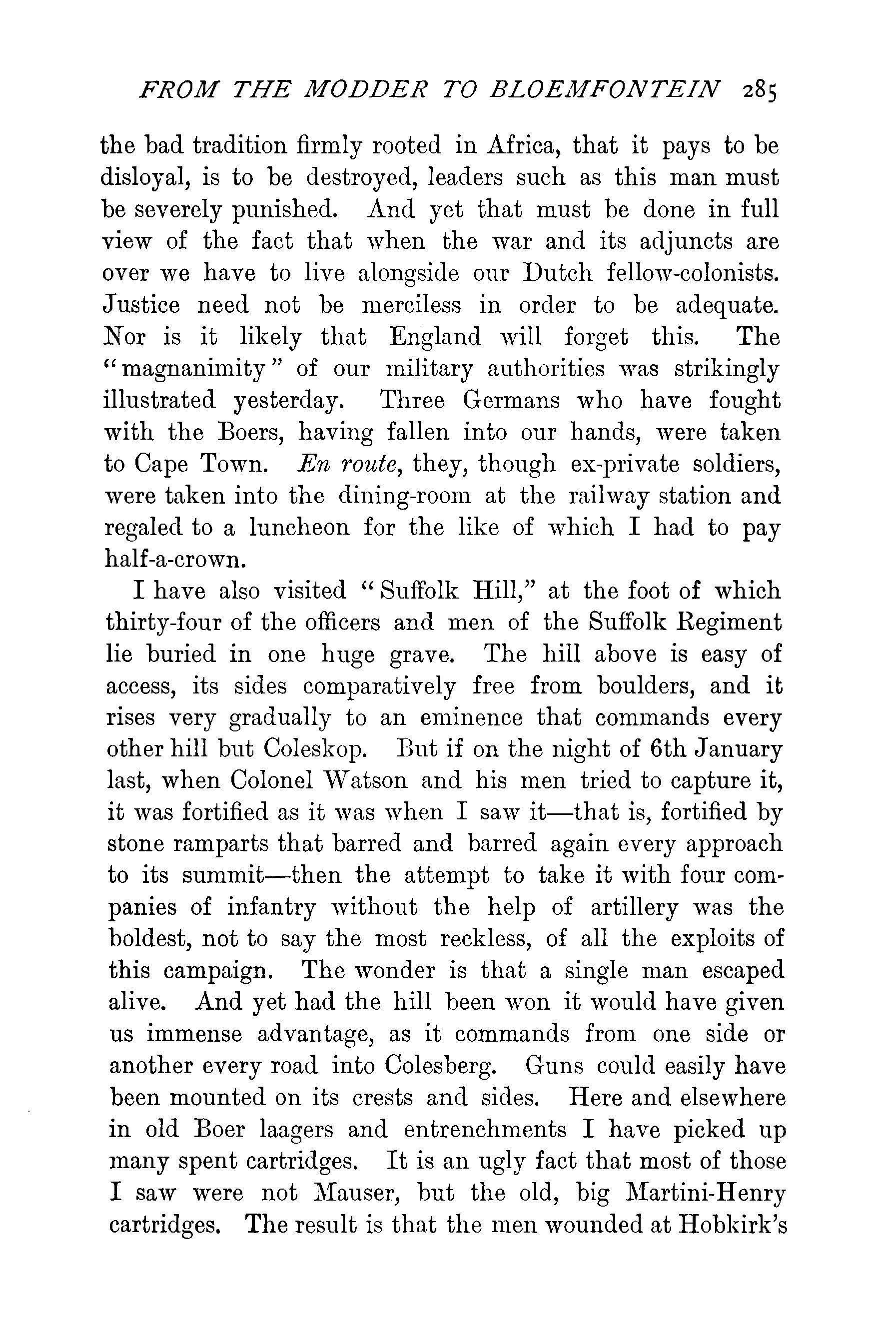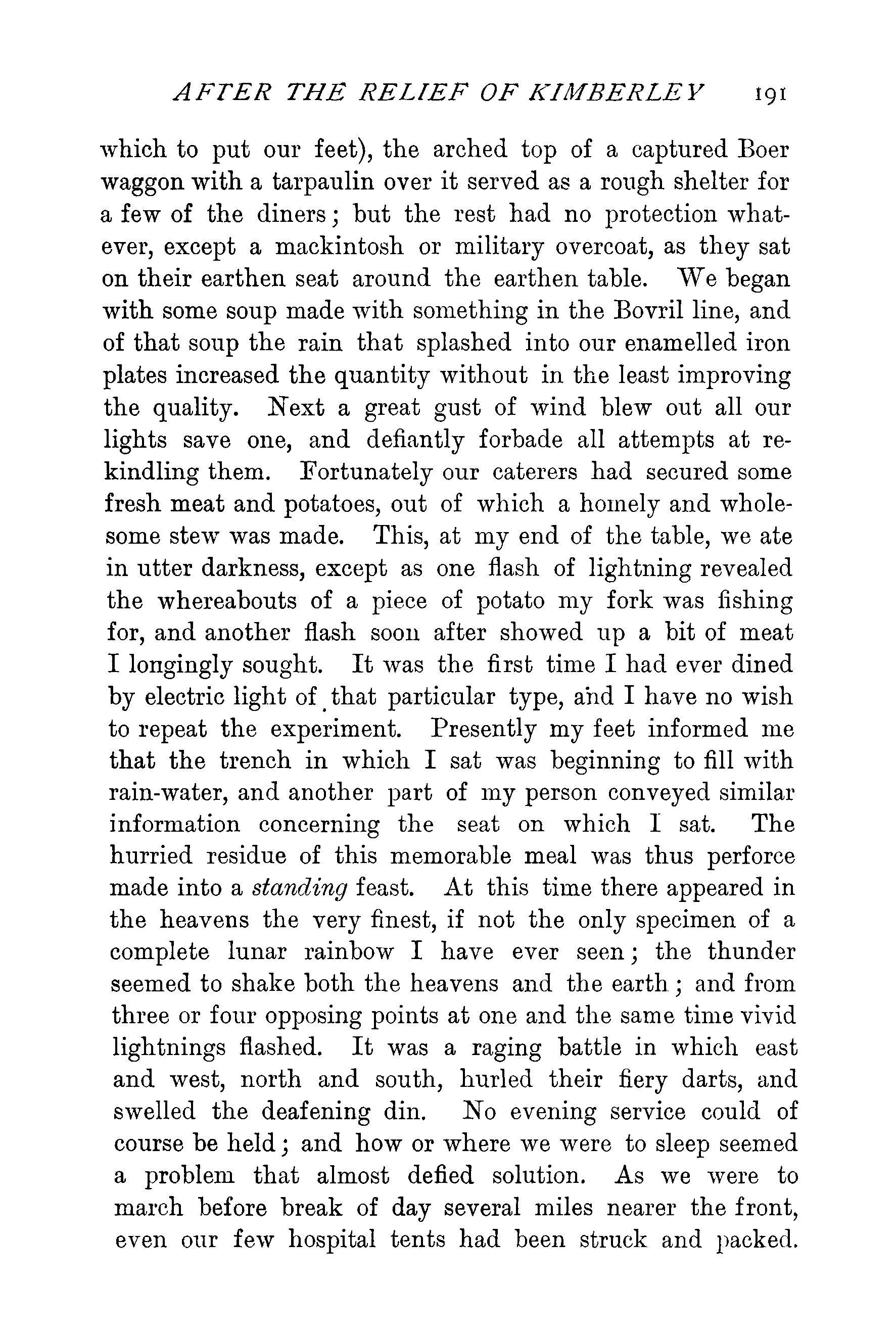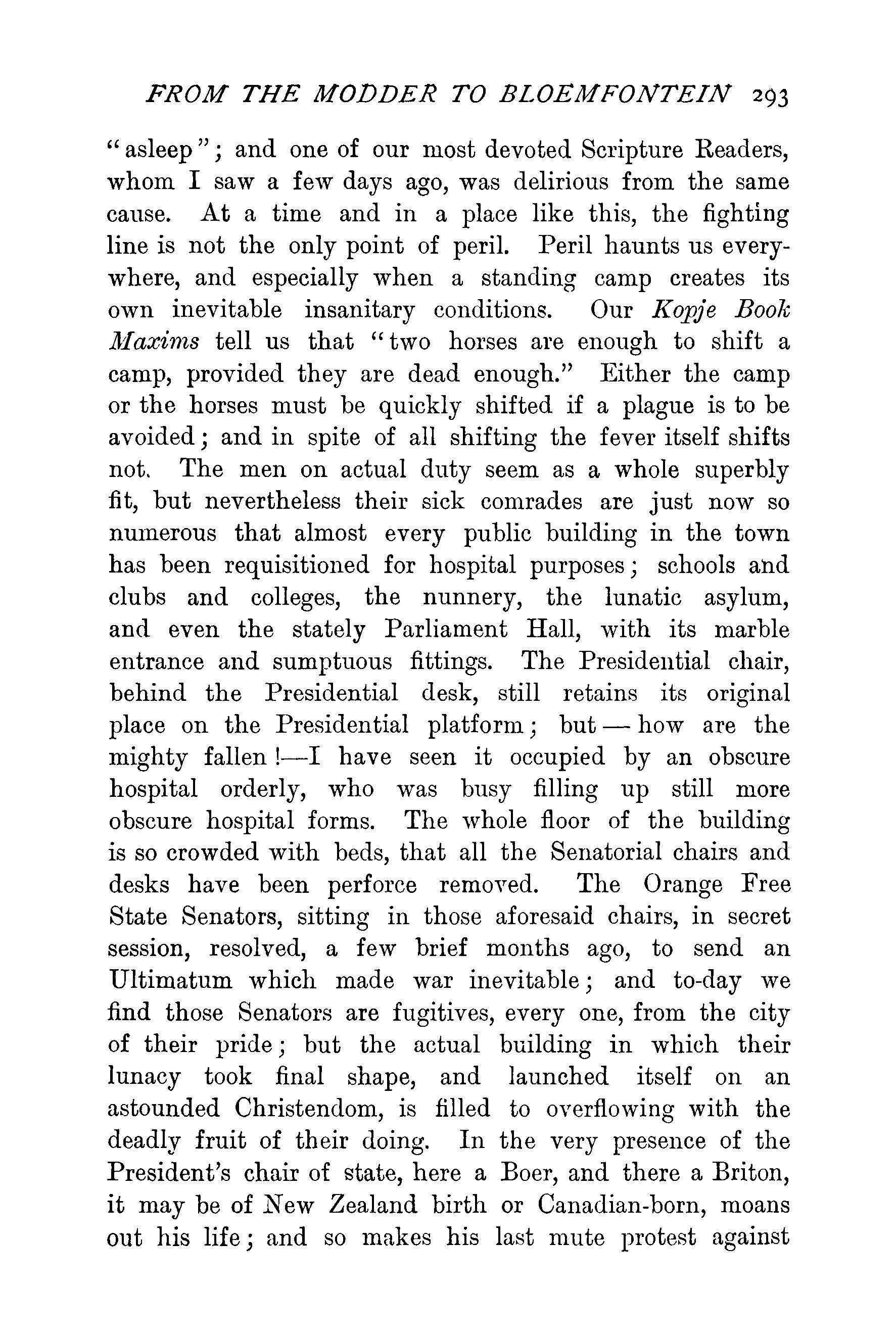 By this time our people at home have been disillusioned concerning the Boer characteristics. It was a marvel to us when leading men in England denounced in passionate tones our intrusion upon the patriarchal quietude of the Boer peasantry, whom they likened to the freedom-loving Puritans who emigrated to New England. Latterly you have heard enough of their dirty ha hits, which make their camps reek with tilth, of their treacherous use of the flag of truce and of that of the Red Cross, and of the outrageous lies which are circulated throughout their commandoes with a view to sustain the courage of the mixed multitude.