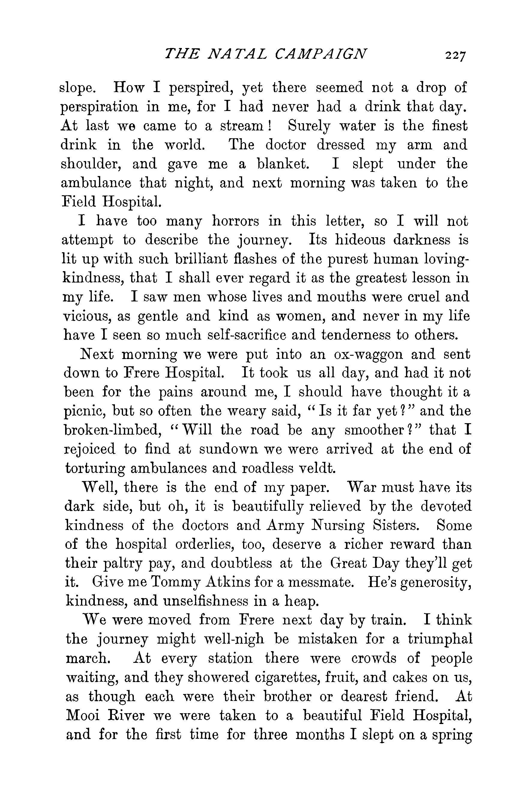 Rounds of hospitals, where I have met representatives from Ceylon, Australia, Canada, India, New Zealand, South Africa, and the United Kingdom-an omnium gatherum of sufferers-have filled much of my time during the past fortnight. Death is less victorious than three weeks ago, but fever, pain, weariness, and anxiety have not released their grasp. I cannot tell of the sweet brave things I have heard from tongues that had almost lost their power to speak. But every man declares he is getting better. One, a Canadian lad, who has passed through his course as a student for the ministry, and, being refused as a chaplain, volunteered as a trooper, gasped out to me yesterday in answer to my question, "How are you, old man? " "Trusting Jesus." Another, nearly well, said, "I have been a Christian for twenty years, but the weeks spent in this
