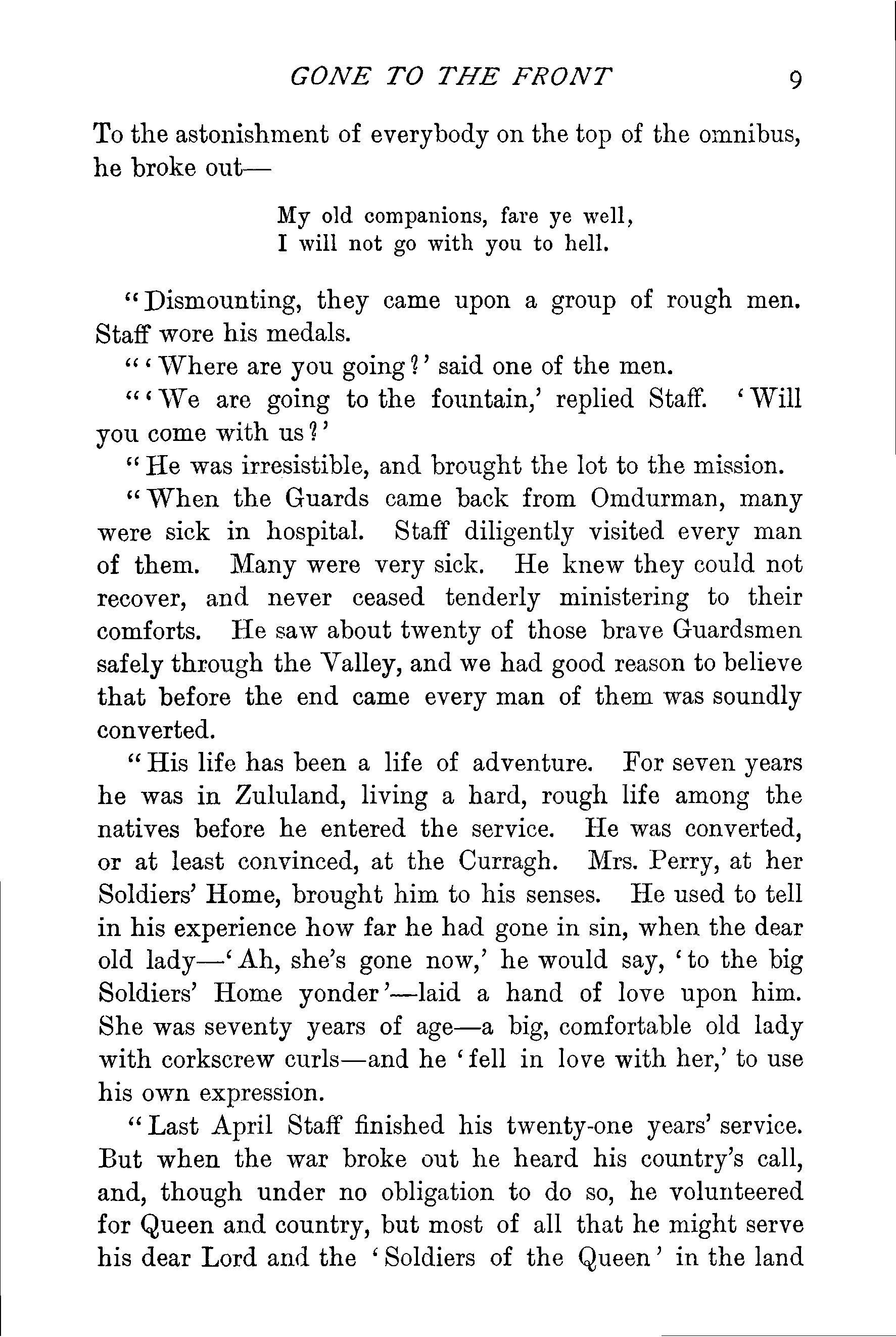 " 'Dear Lord, take care of our fellows. They've gone to the Soudan. The Evening News, dear Lord, says there are five hundred of them;' and then, true to his always keen desire for accuracy, he paused, correcting himself, 'No, Lord, it's four hundred and fifty.' And he prayed for them as though they had been his own sons.