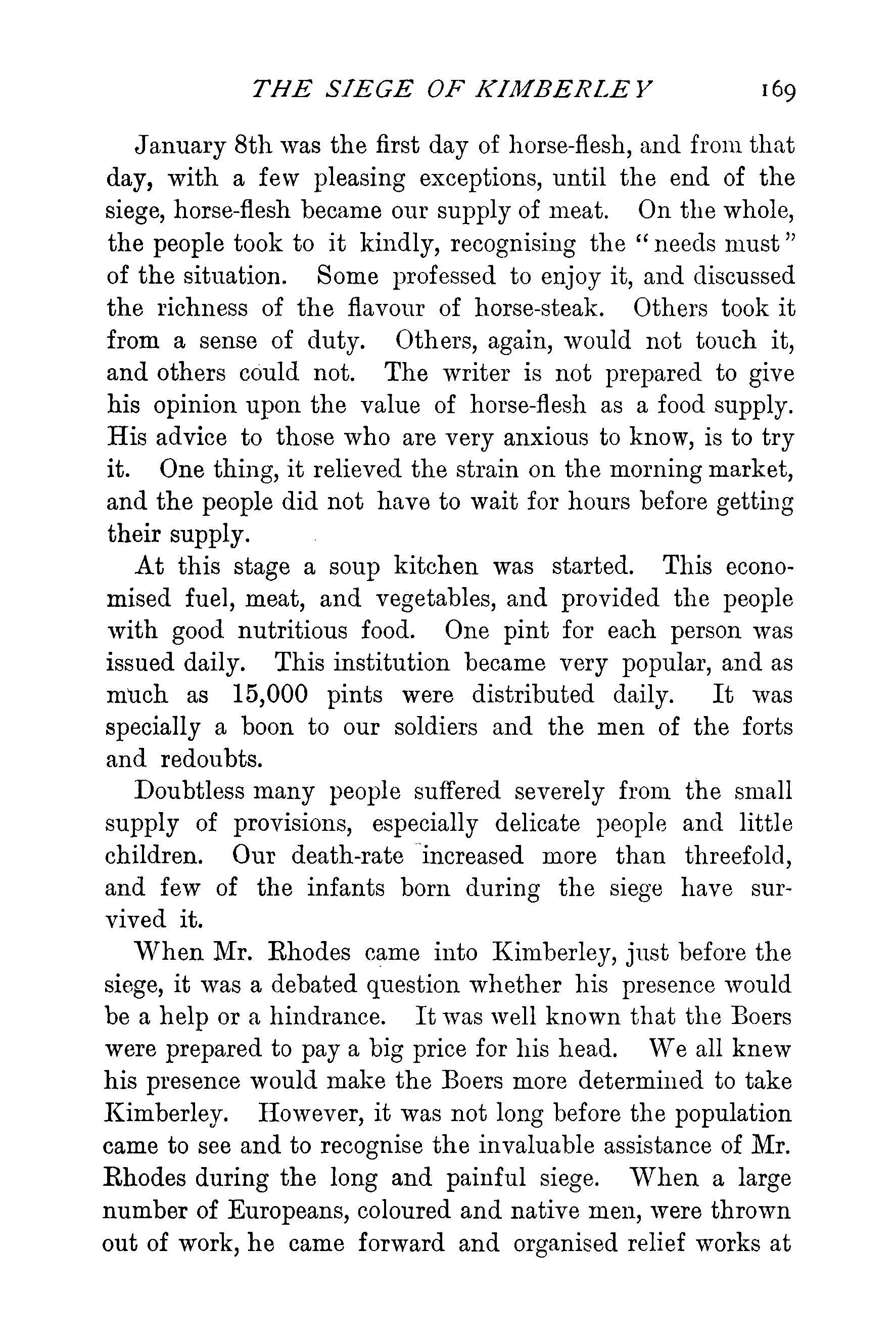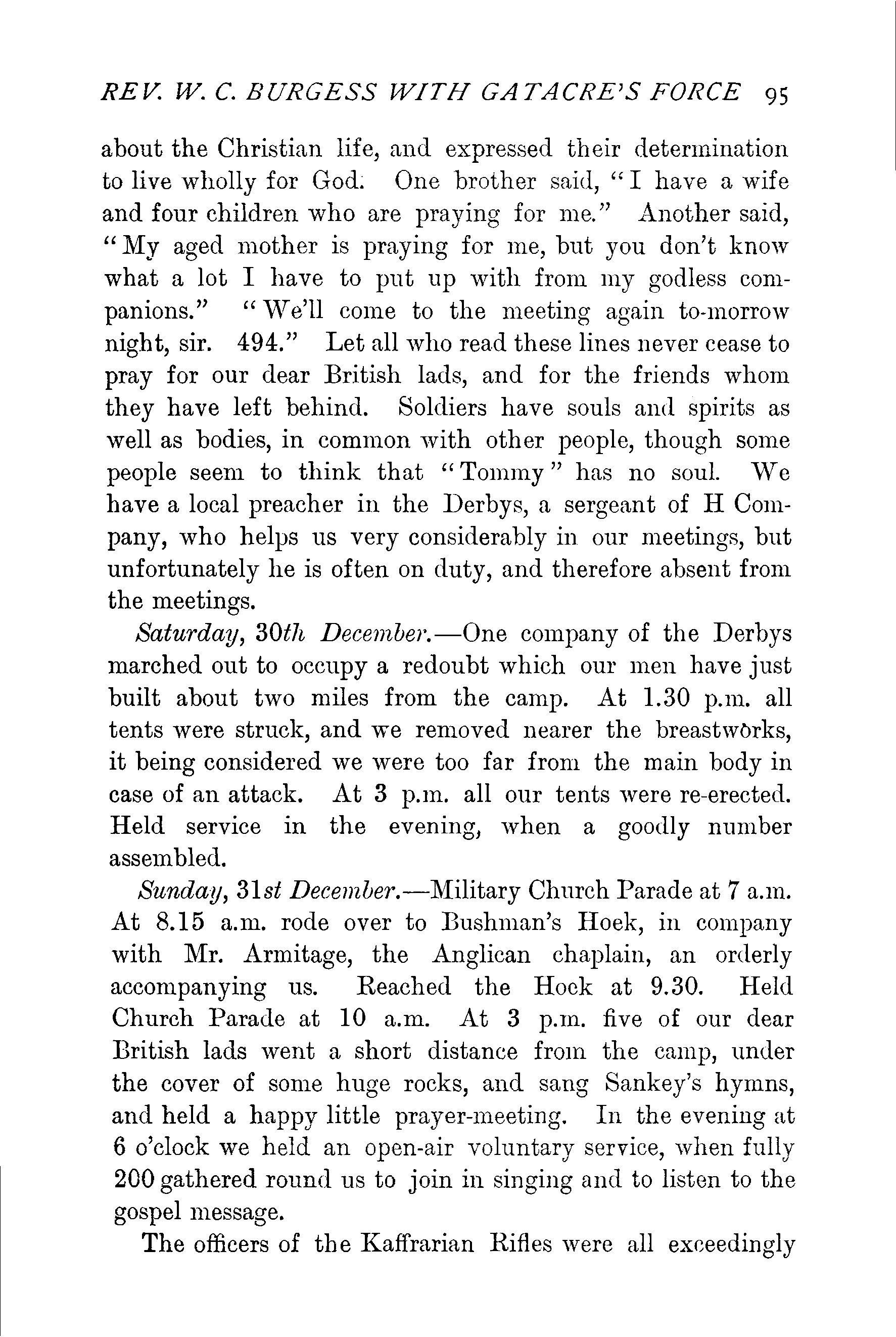 Almost every night I have been present or preached at services in one or other of the Soldiers' Homes in the places where I work. The meetings are uniformly well attended, and especially in De Aar great spiritual results are being achieved. I thank God for the change wrought in the life of not a few. If the steady ruck of Christian respectability in Cape Town and elsewhere could be broken for a while by the hearty evangelistic, soul-saving energy which permeates these soldiers' meetings, great spiritual advantage would ensue. Formality would die-it would be killed. Spiritual life and effort for the ingathering of unsaved men and women would be quickened. To use an expressive phrase, the soldier's religion is "out and out," but it is of a very genuine stamp.