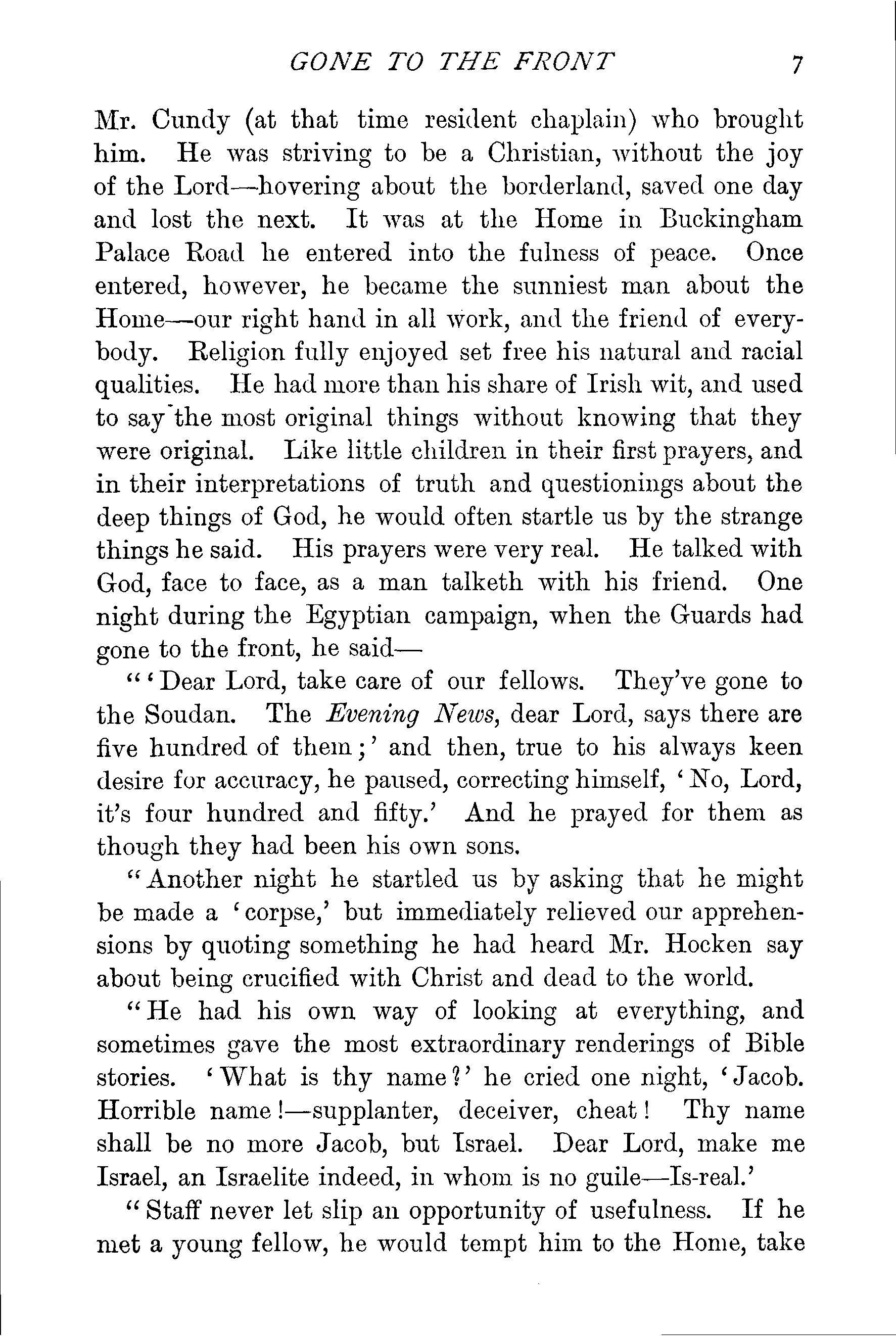 Mr. Cundy (at that time resident chaplain) who brought him. He was striving to be a Christian, without the joy of the Lord-hovering about the borderland, saved one day and lost the next. It was at the Home in Buckingham Palace Road he entered into the fulness of peace. Once entered, however, he became the sunniest man about the Home-our right hand in all work, and the friend of everybody. Religion fully enjoyed set free his natural and racial qualities. He had more than his share of Irish wit, and used to say -the most original things without knowing that they were original. Like little children in their first prayers, and in their interpretations of truth and questionings about the deep things of God, he would often startle us by the strange things he said. His prayers were very real. He talked with God, face to face, as a man talketh with his friend. One night during the Egyptian campaign, when the Guards had gone to the front, he said-