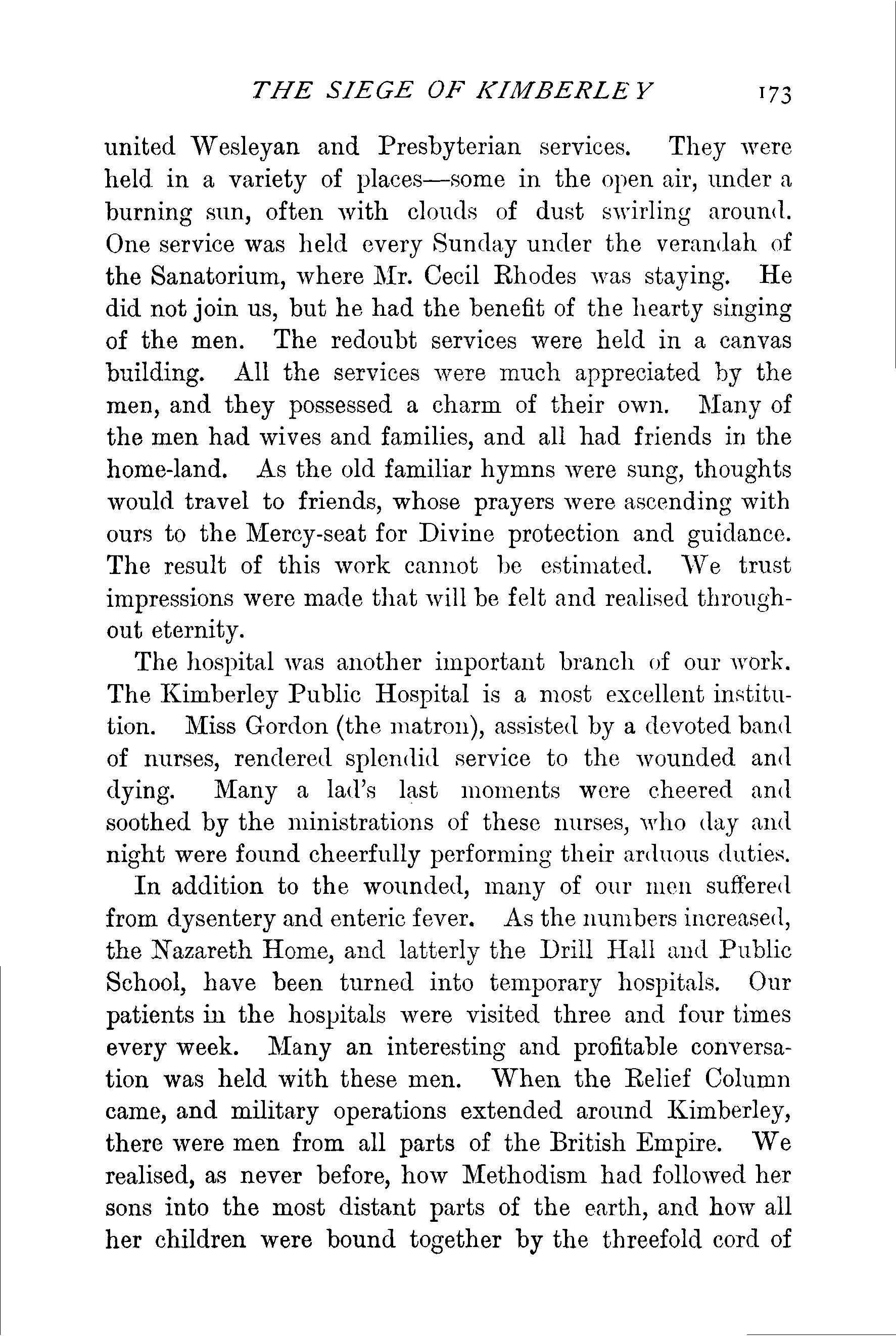 I know that all our Methodist people are anxious to know how "our boys" are getting on. Of one thing you may rest assured-they have the best of attention by both doctors and nurses, and all the service my colleague and I can render them is cheerfully done. It is delightful work ministering to these lads, and three or four days a week we are at the camp doing what we can to cheer and comfort them. We have at present a large number of enteric and dysenteric cases in both No. 1 and No. 2 Hospitals. We have come across Sergeant Oats, of the Northumberland Fusiliers, of Barnard Castle Circuit-a fine Christian man, and as brave as he is good. He was through the fierce fights around Kimberley, and at Magersfontein he was specially mentioned for coolness and bravery under fire. He escaped the Mauser bullet, but the rough kind of life brought on dysentry. I am thankful, however, to tell you he is now doing nicely. He was delighted, through a copy of the Recorder, to get once more iuto touch with English Methodist life.