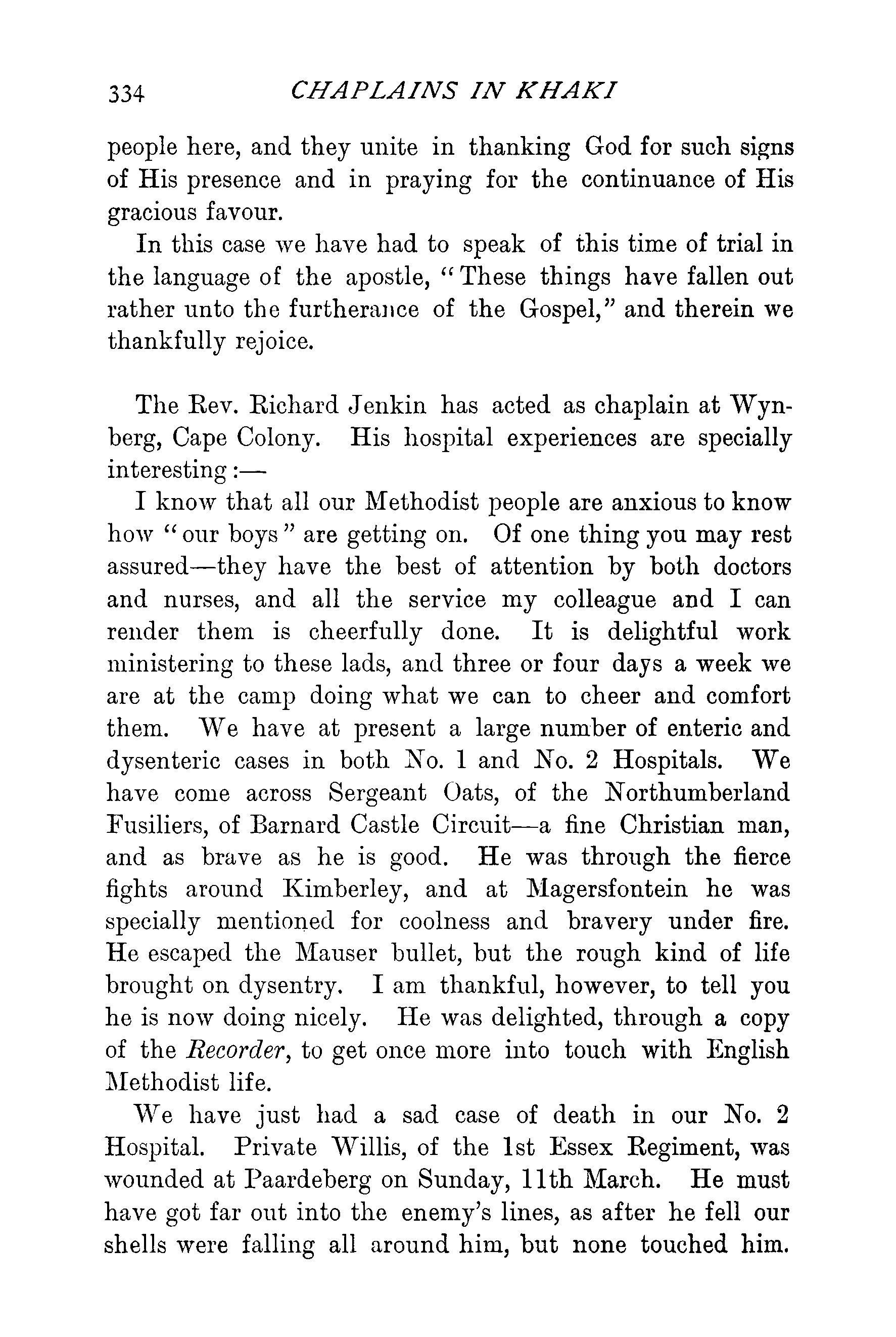 The Rev. Richard Jenkin has acted as chaplain at Wynberg, Cape Colony. His hospital experiences are specially interesting :-