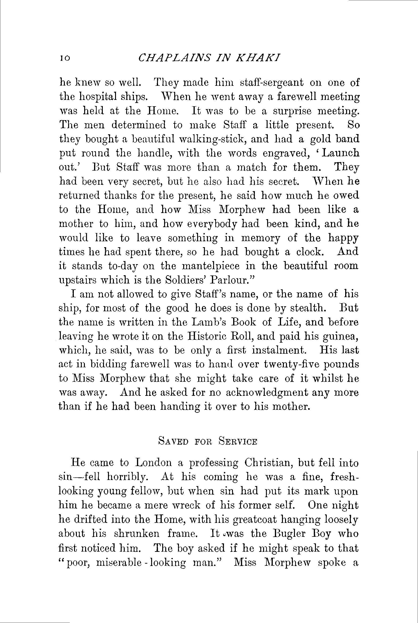 A bandsman, himself a foundling, and a frequent visitor at the Home, had a great love for the boy, and watched over him during the perilous furlough weeks with a sort of fatherly tenderness. Just before the lad went to the war, on that last visit, Miss Morphew took him into her own room and asked the bandsman to come also. They talked together for a little, and then knelt in prayer. When Mother had commended her "son" to God, the bandsman, though not a Christian, broke out into prayer also. And when the last good-bye was said, the great bandsman kissed the child.