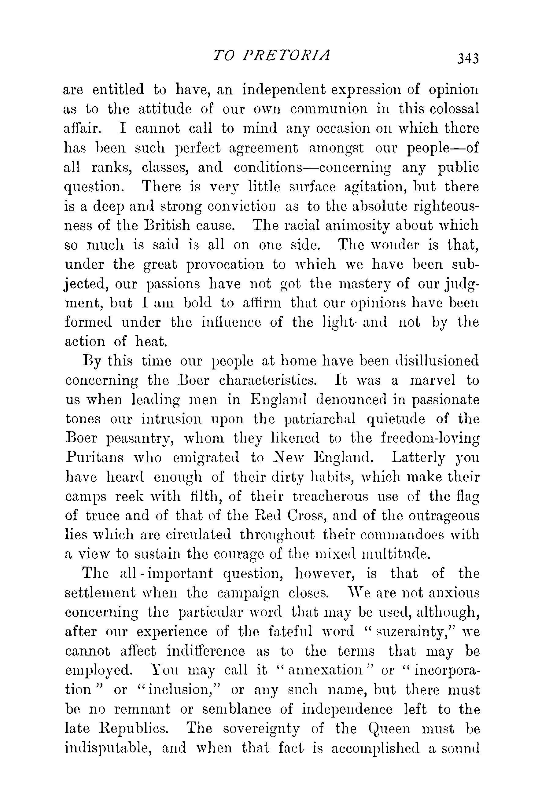 The all- important question, however, is that of the settlement when the campaign closes. "\Ye are not anxious concerning the particular word that lllay be used, although, after our experience of the fateful word "suzerainty," we cannot affect indifference as to the terms that may be employed. You lllay call it "annexation" or "incorporation" or "inclusion," or any such name, but there must be no rem nan t or semblance of independence left to the late Republics. The sovereignty of the Queen must be indisputable, and when that fnct is accomplished a sound