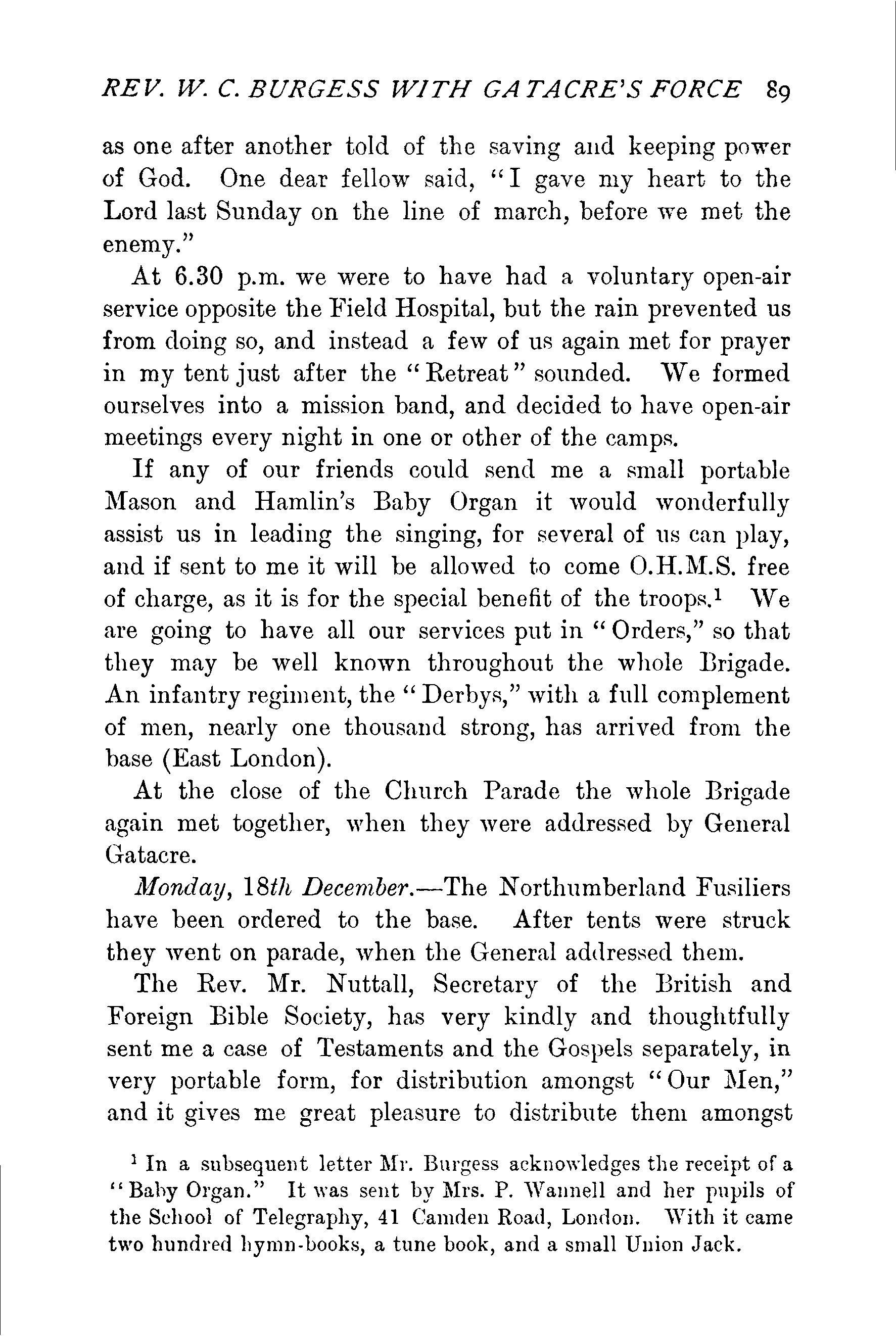 At the close of the sermon a few departed, but the great majority remained. And the Lord was never more really present with His disciples than on this occasion. Our shapeless hut of mud was indeed the Holy of Holies, and the Shekinah glory illuminated our souls with the light of God. For myself that service will ever be marked as a " red letter" experience. What it meant to others, and what visible result followed, will be seen by the perusal of the following letter, written on the evening of the next day by Sergeant Dudley:-