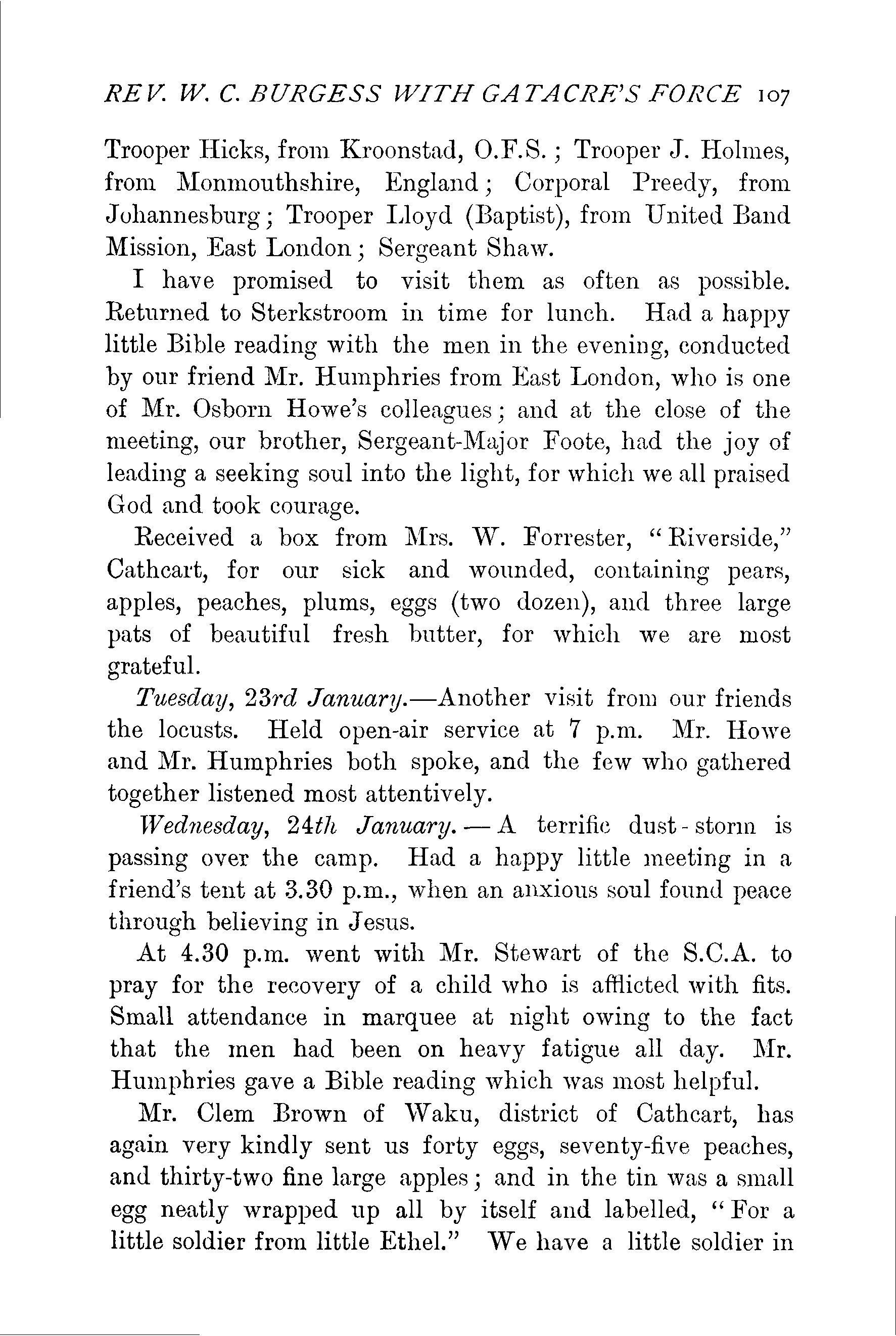 The Rev. M. F. Crewdson writes from De Aar, Cape Colony:-