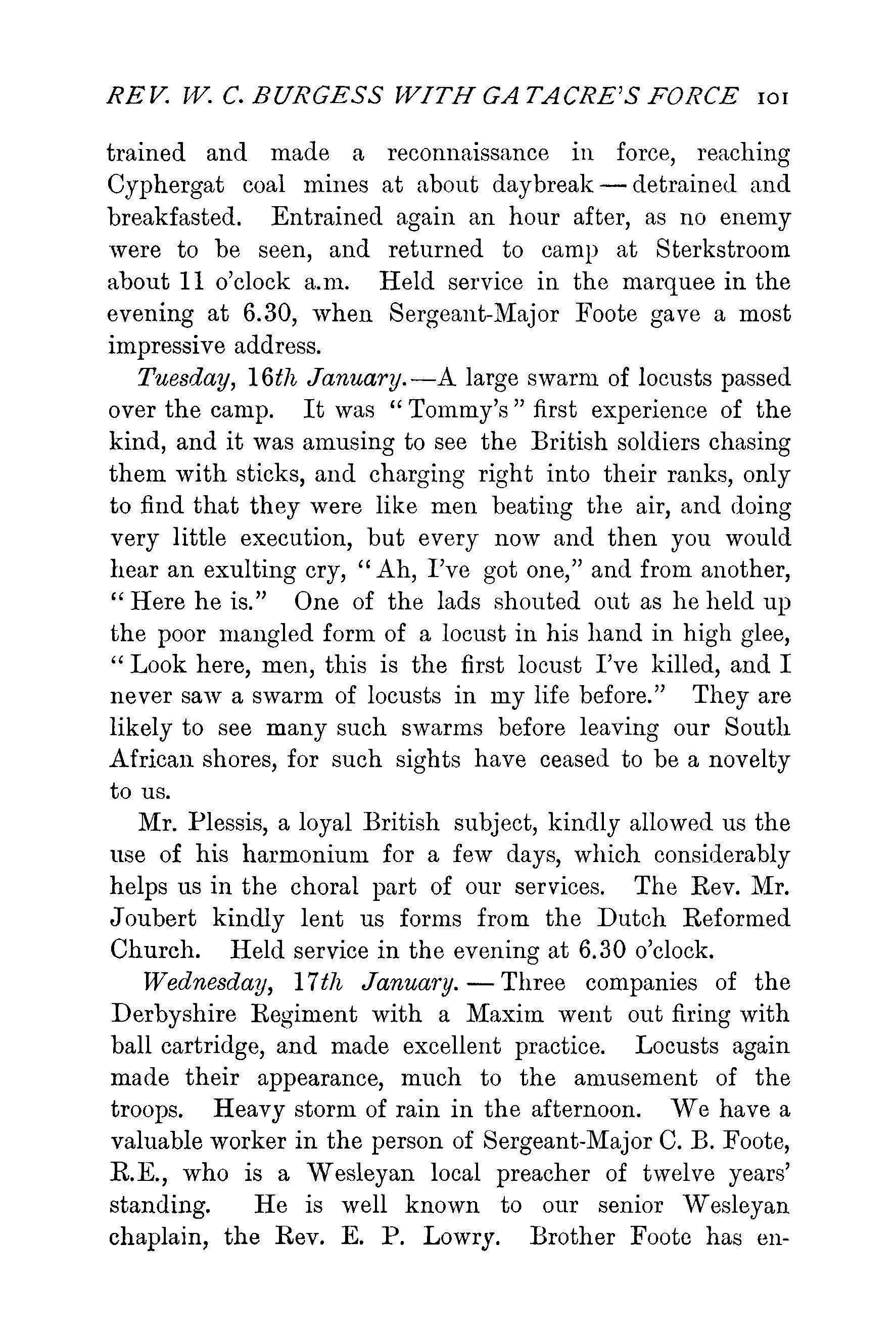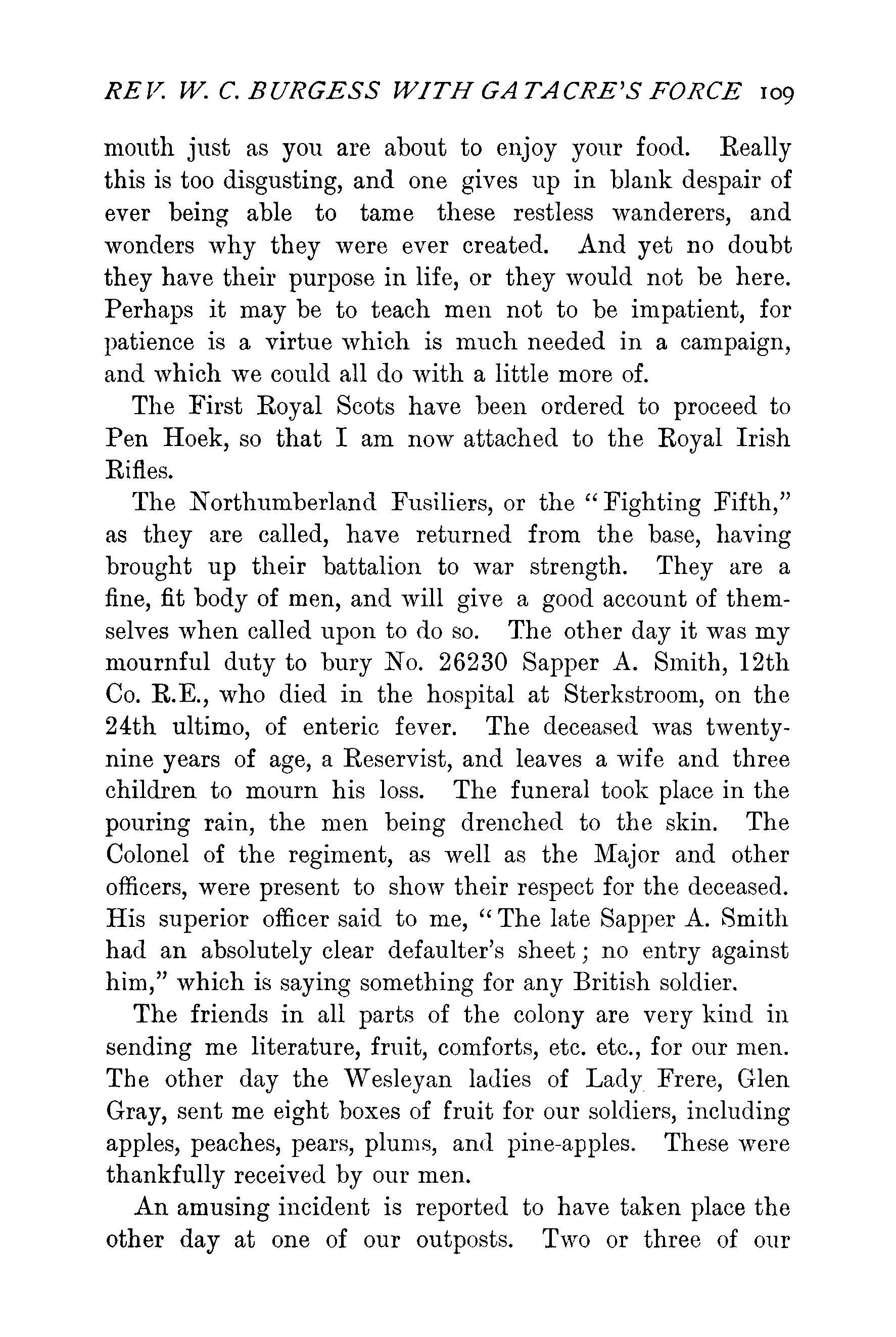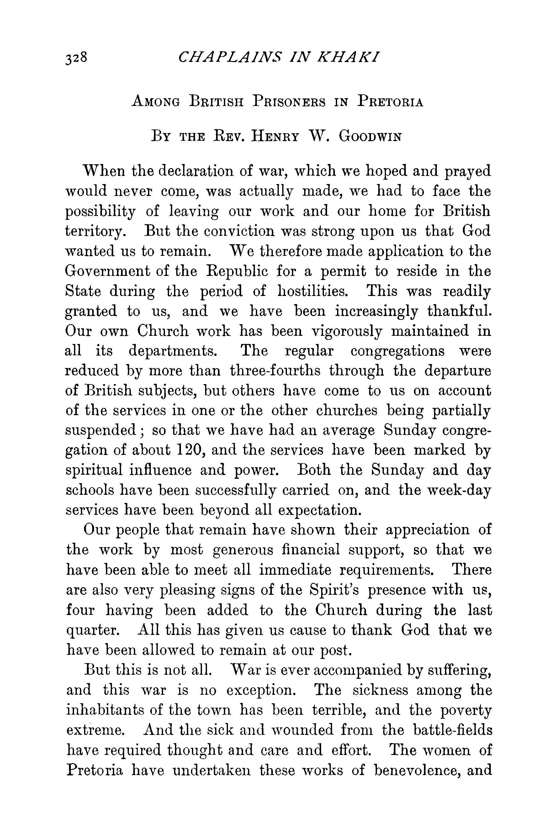 Amongst the first batch of war prisoners there was a detachment of the 18th Hussars, in which was included Sergeant Dudley, who announced to me, with commendable pride, the second time I met him, that he was a Wesleyan Methodist local preacher. Immediately after their arrival in Pretoria this good brother gathered round him all the decided Christians in the camp, and commenced holding regular meetings, which have borne fruit abundantly. On the occasion of my first visit I found them in great need of hymn-books and Bibles, with which I was able to supply them. My visits have been as regular and as frequent as the authorities would allow. As often as our esteemed Chairman's duties would permit him, he has supplied for me in Pretoria, and on one occasion he has visited the prisoners' camp himself. The ministers of other English Churches that have remained in Pretoria have also taken their turn in conducting services. But the work as a whole has been continuous, the ministerial visits being regarded as helps by the way.