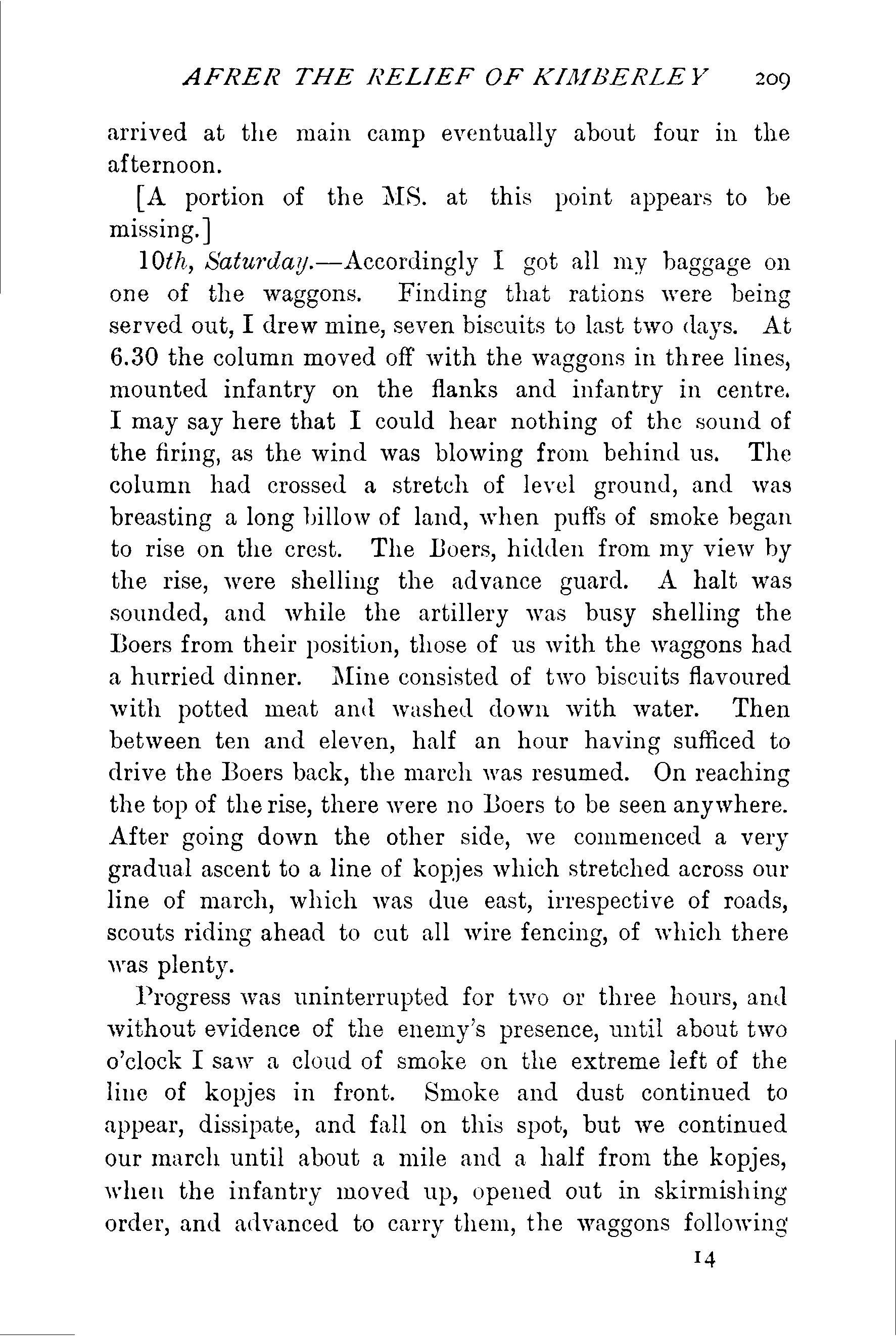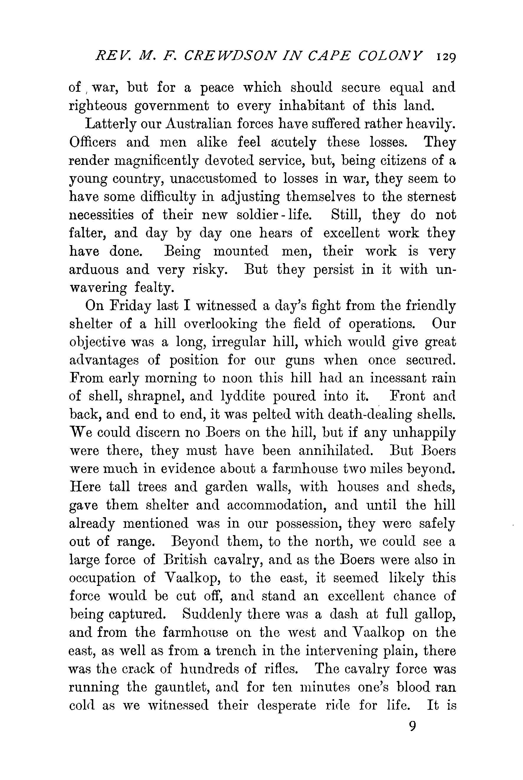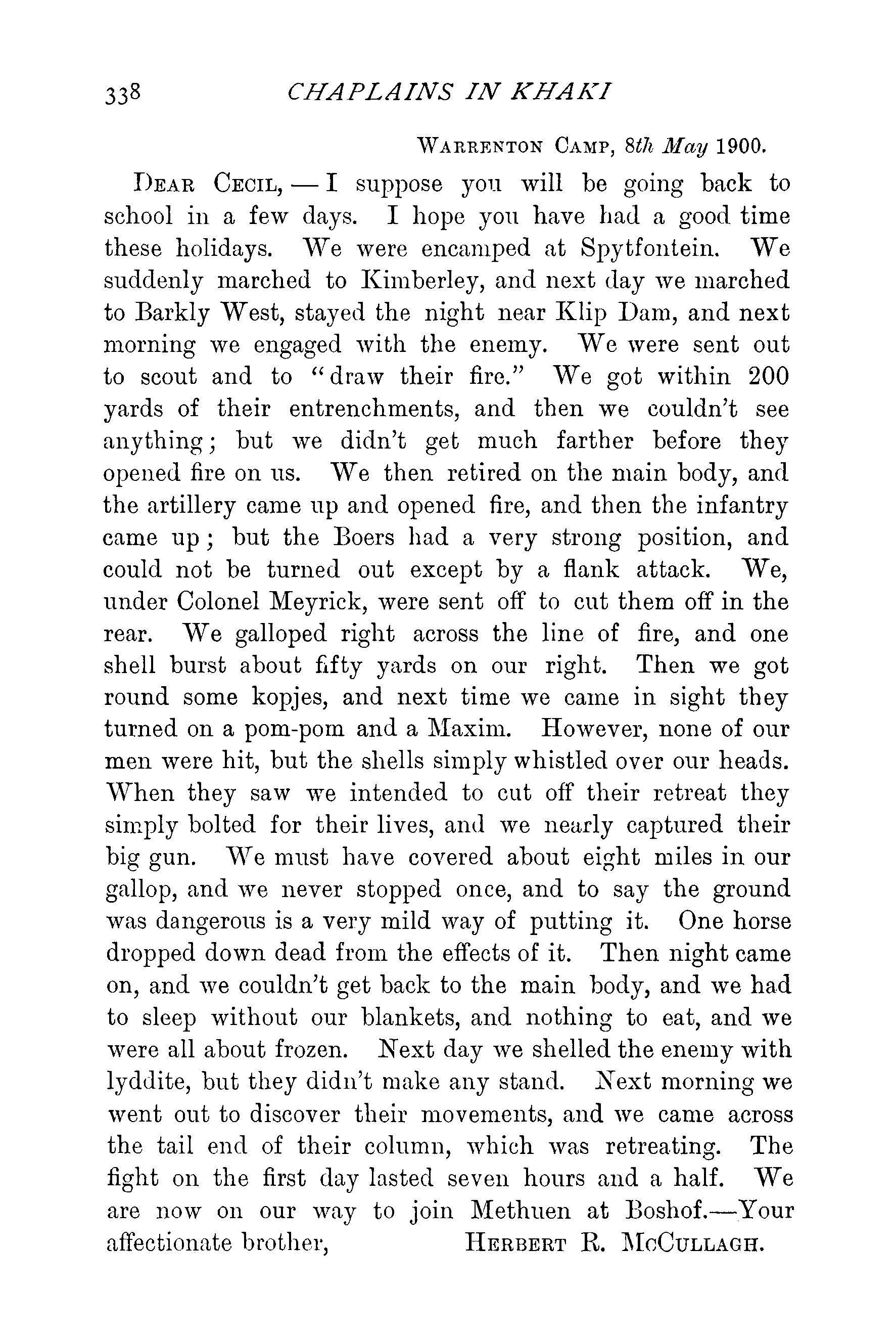 DEAR CECIL, - I suppose you will be going back to school in a few days. I hope you have had. a good time these holidays. We were encamped at Spytfontein. We suddenly marched to Kimberley, and next day we marched to Barkly West, stayed the night near Klip Dam, and next morning we engaged with the enemy. We were sent out to scout and to "draw their fire." We got within 200 yards of their entrenchments, and then we couldn't see anything; but we didn't get much farther before they opened fire on us. We then retired on the main body, and the artillery carne up and opened fire, and then the infantry came up; but the Boers had a very strong position, and could not be turned out except by a flank attack. We, under Colonel Meyrick, were sent off to cut them off in the rear. We galloped right across the line of fire, and one shell burst about fifty yards on our right. Then we got round some kopjes, and next time we came in sight they turned on a porn-porn and a Maxim. However, none of our men were hit, but the shells simply whistled over our heads. "When they saw we intended to cut off their retreat they simply bolted for their lives, and we nearly captured their big gun. 'Ve must have covered about eight miles in our gallop, and we never stopped once, and to say the ground was dangerous is a very mild way of putting it. One horse dropped down dead from the effects of it. Then night came on, and we couldn't get back to the main body, and we had to sleep without our blankets, and nothing to eat, and we were all about frozen. N ext day we shelled the enemy with lyddite, but they didn't make any stand. Next morning we went out to discover their movements, and we came across the tail end of their column, which was retreating. The fight on the first day lasted seven hours and a half. We are now on our way to join Methuen at Boshof.-Your affectionate brothel', HERBERT R. l\[CCULLAGH.