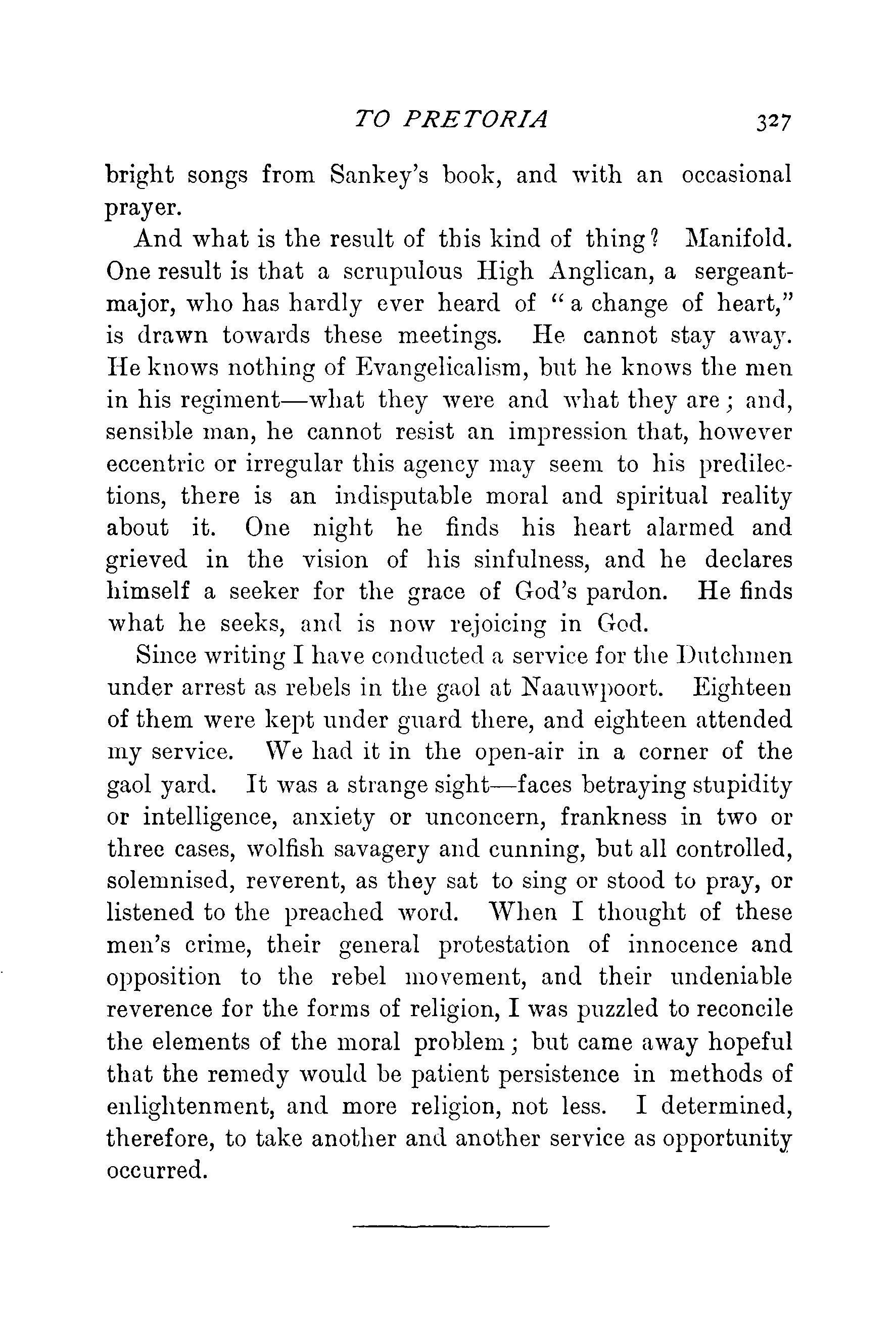 Since writing I have conducted a service for the Dutchmen under arrest as rebels in the gaol at N aauwpoort. Eighteen of them were kept under guard there, and eighteen attended my service. \Ve had it in the open-air in a corner of the gaol yard. It was a strange sight-faces betraying stupidity or intelligence, anxiety or unconcern, frankness in two or three cases, wolfish savagery and cunning, but all controlled, solemnised, reverent, as they sat to sing or stood to pray, or listened to the preached word. When I thought of these men's crime, their general protestation of innocence and opposition to the rebel movement, and their undeniable reverence for the forms of religion, I was puzzled to reconcile the elements of the moral problem; but carne away hopeful that the remedy would be patient persistence in methods of enlightenment, and more religion, not less. I determined, therefore, to take another and another service as opportunity occurred.