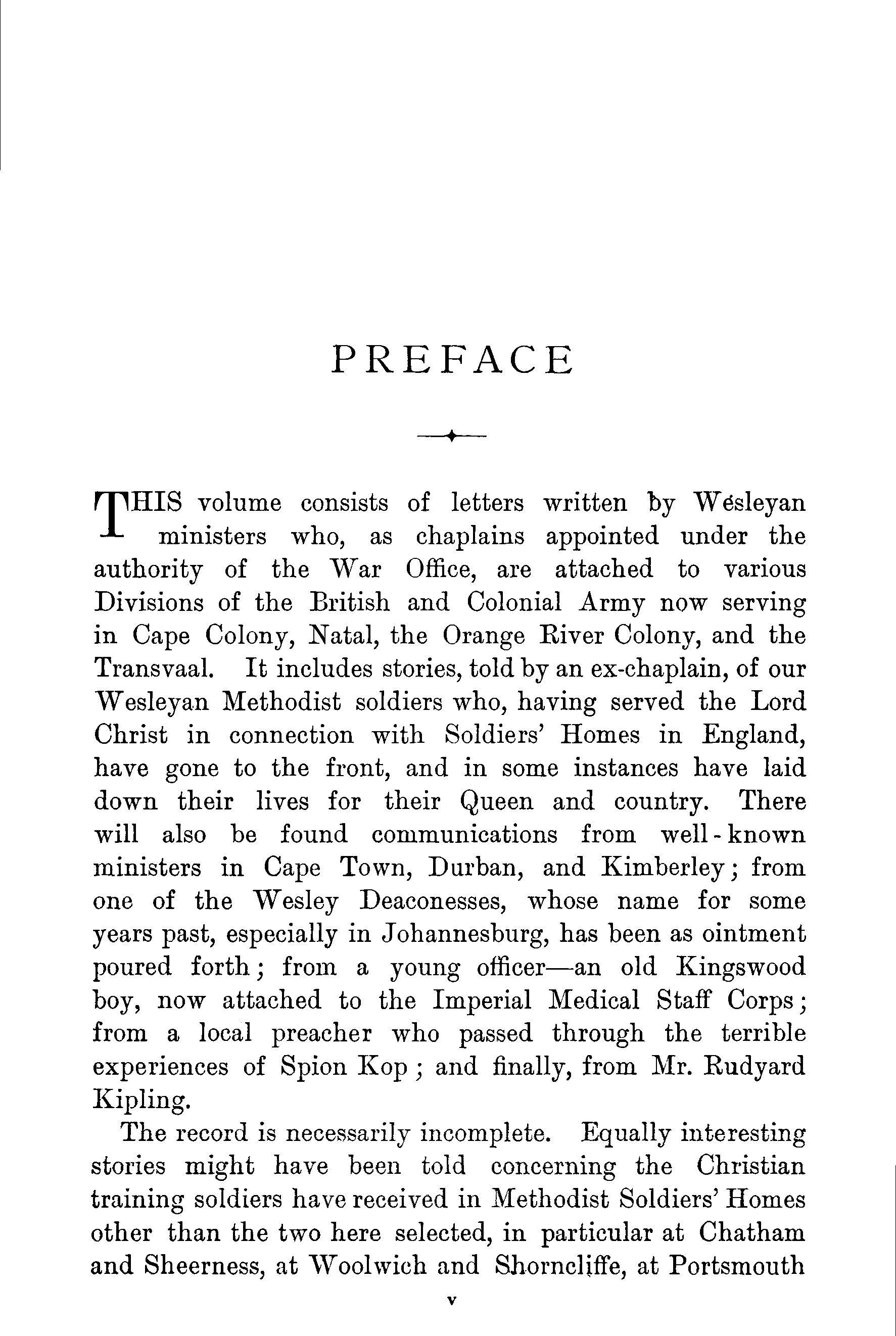 THISvolume consists of letters written by Wesleyan ministers who, as chaplains appointed under the authority of the War Office, are attached to various Divisions of the British and Colonial Army now serving in Cape Colony, Natal, the Orange River Colony, and the Transvaal. It includes stories, told by an ex-chaplain, of our Wesleyan Methodist soldiers who, having served the Lord Christ in connection with Soldiers' Homes in England, have gone to the front, and in some instances have laid down their lives for their Queen and country. There will also be found communications from well- known ministers in Cape Town, Durban, and Kimberley j from one of the Wesley Deaconesses, whose name for some years past, especially in Johannesburg, has been as ointment poured forth j from a young officer-an old Kingswood boy, now attached to the Imperial Medical Staff Corps; from a local preacher who passed through the terrible experiences of Spion Kop; and finally, from Mr. Rudyard Kipling.