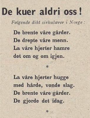De to første strofene av diktet «De kuer aldri oss!» av Inger Hagerup slik det ble publisert anonymt i avisa Norsk Tidend fra London i 1941. Diktet ble senere publisert med tittelen «Aust-Vågøy» i 1945.