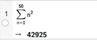 Formelen for det n-te kvadrattallet er an n 2 For å finne summen skal vi summere dette uttrykket for n = 1, n = 2, og så videre, opp til og med n = 50. Se utskriften fra CAS til høyre.