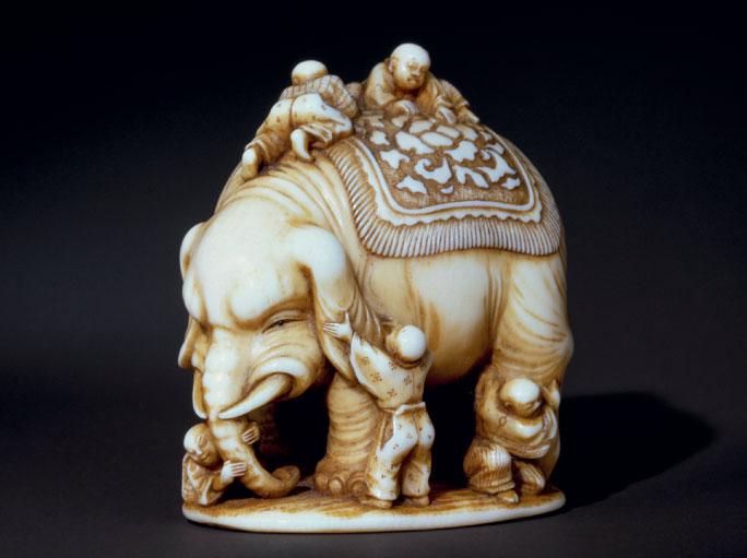 En japansk ibenholtskulptur av de blinde mennene som undersøker en elefant.