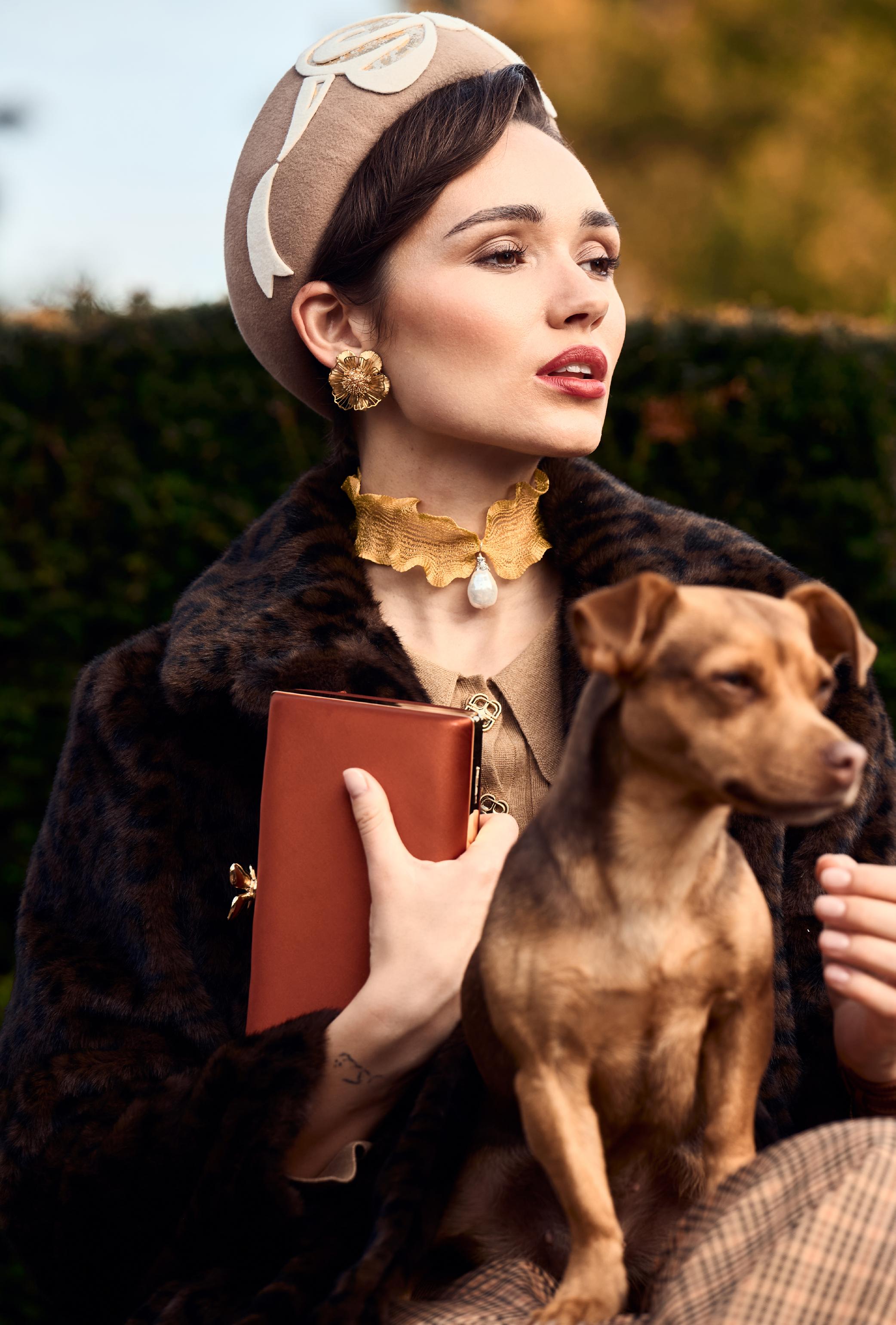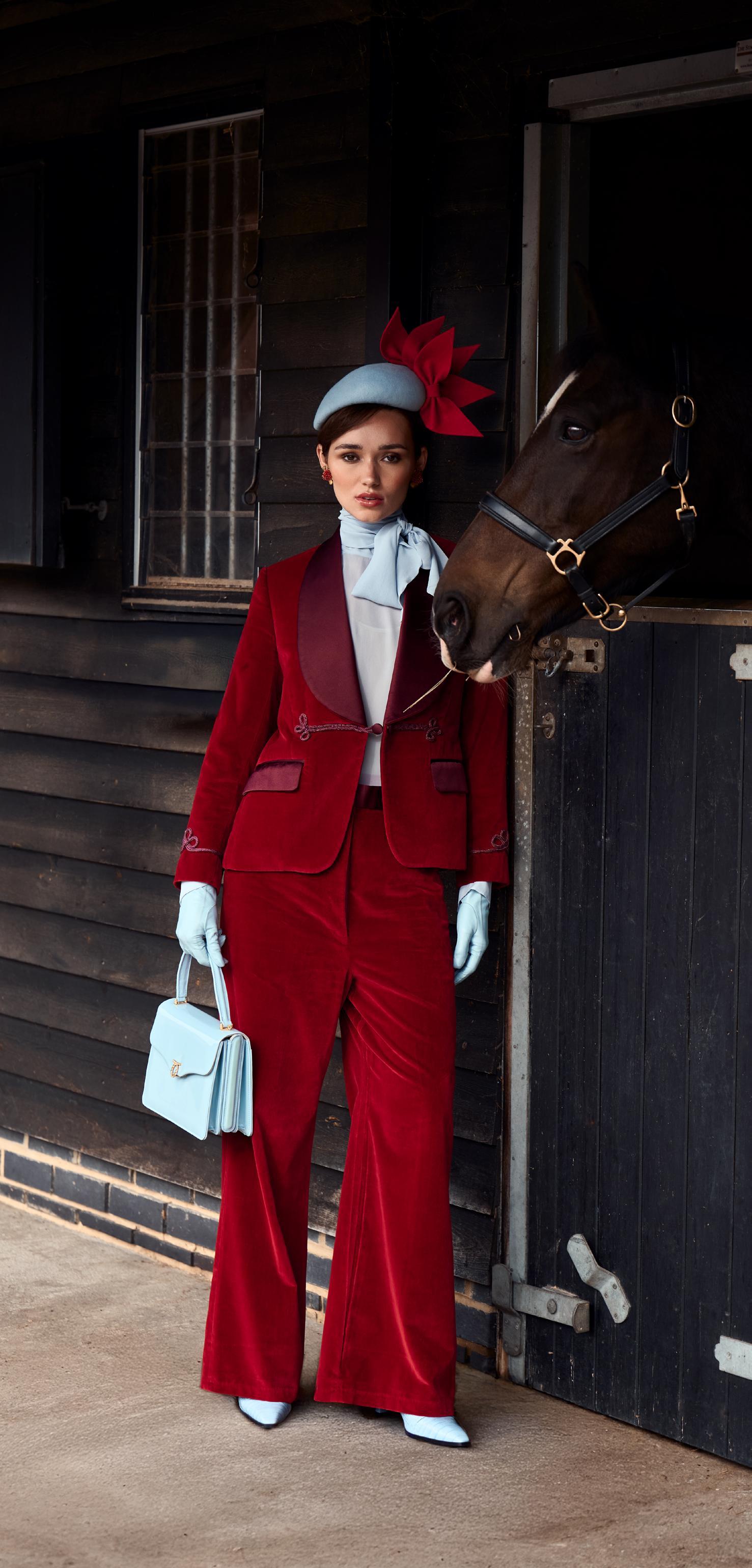 Crucially, in the same breath, the clothes in this Lookbook are wearable clothes. They’re not clothes that are talking points because they are ridiculous. Art and wearability (and key for the Jumps season – practicality) are and should be friends. Take Suzannah’s coat dress. It boasts the most elegant of cowl necks and a bow-adorned back, but an elements-defying durability exists alongside this beauty courtesy of its fabric – tweed sourced in Cumbria. (Naturally, this is traditionally neutral tweed reimagined in an ice queen-worthy duck egg blue). Likewise, Banshee’s red suit combines the warmth of velvet with decadent details – militarystyle frog buttons (each made totally by hand) and a pink, rose-print lining.