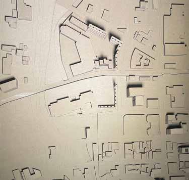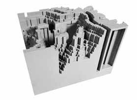 Housing units are built up and connected through the use of a larger floor type then disconnect and become columns. This spatial make allows for the courtyards to be inbetween the housing columns. The whole building is one unit in width to accomadate the cityscape and fram the Mohawk we are redefining as the center for Downtown Syracuse, the units only face towards this building and match the height of it on one side. Matching the height of the top of the Mohawk highlights the stepped top of the perpendicular building through the space made between the two. The larger floor type turns into a bridge and then lowers in height to match the height of theshopping mall infront of the Mohawk. The bridge creates an entrance to the new center of the city and the contuniuation of the wall of housing units facing in makes a boarder for the new defined city campus.