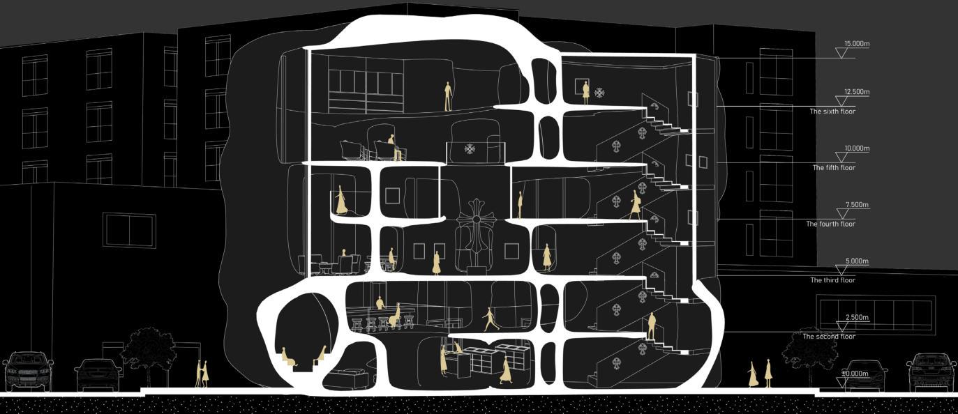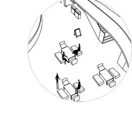 Theplatformisequippedwithgreenplants,providingpeoplewithaplacetorestandshade.Di erentSpaces interweavewitheachother,allowinglighttopenetrateeachspaceandenhancingthelightinge ect.Thisavoids theproblemofSpacesblockingeachother,thuspreventingtheinteriorfrombeingtoodark.