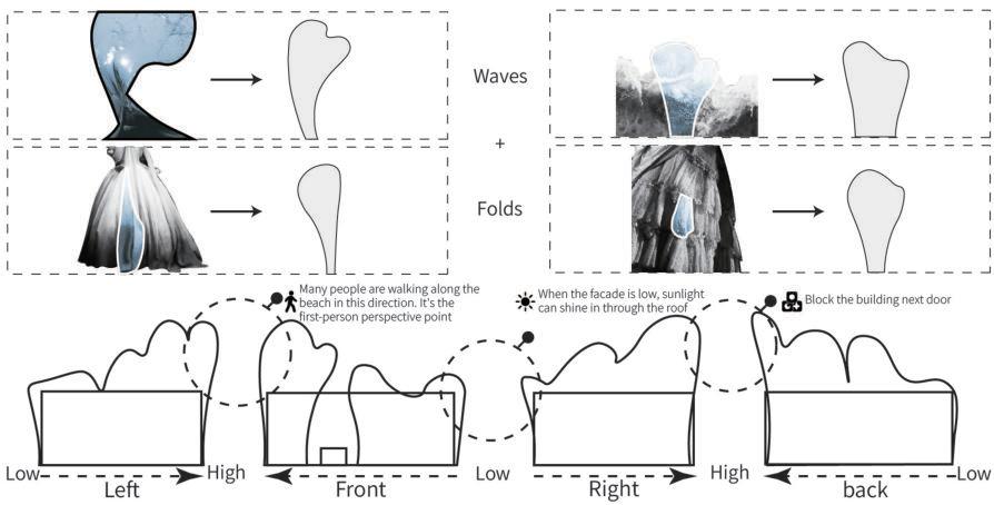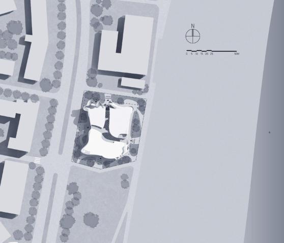 The facade combines the pleats of the costumes and the elements of waves, each with different undulations and convexity, which adds a sense of layering and enhances the visual effect. There is a large ow of people around the beach. The building is located right by the beach, and there are also three theaters not far away. Therefore, it can attract many peoplewhoareinterestedindrama.