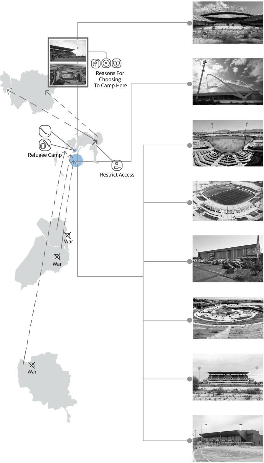 By analyzing the reasons for the abandonment of each venue and the situation near the site. It was found that almost no one came to most of the venues after the Olympic Games, and only the baseball and hockey elds were inhabited by refugeesfrom2015to2017.SincethenumberofrefugeesinGreecehasalsoincreasedinrecentyears,Iwanttodesigna prefabricatedcommunityforthispurpose.