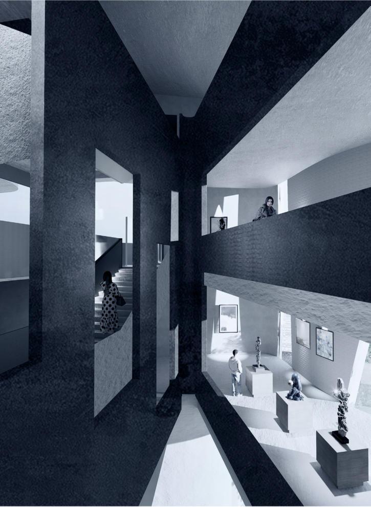 Therefore, design a stage costume museum in this place. It is located in a natural theater that coexists with the coast and humanities. Through close-up viewing of stage costumes, everyone can understand the evolution and charm of stage art from di erent perspectives. At the same time, it has an interesting interior space and a beautiful facade, which is a popular photo-op location for tourists.